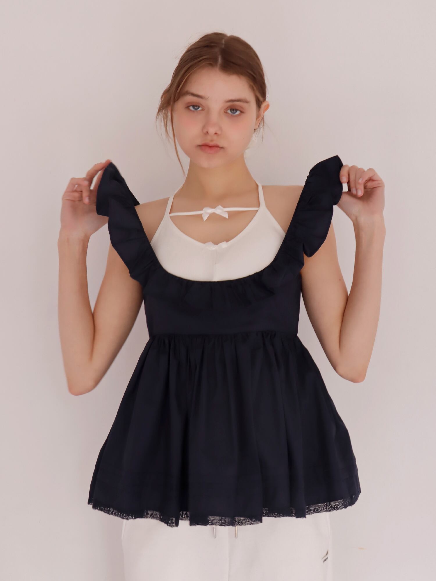 まるで小さなエプロンのような愛らしいデザインのレイヤードアイテム。