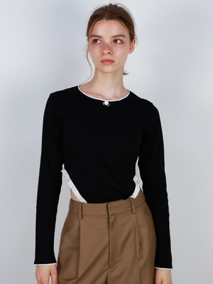 両サイドのお腹が見えるちょっぴり大胆なシルエットながら、首元と袖口にあしらわれた繊細なレースが、可愛らしさをプラスしてくれます。
