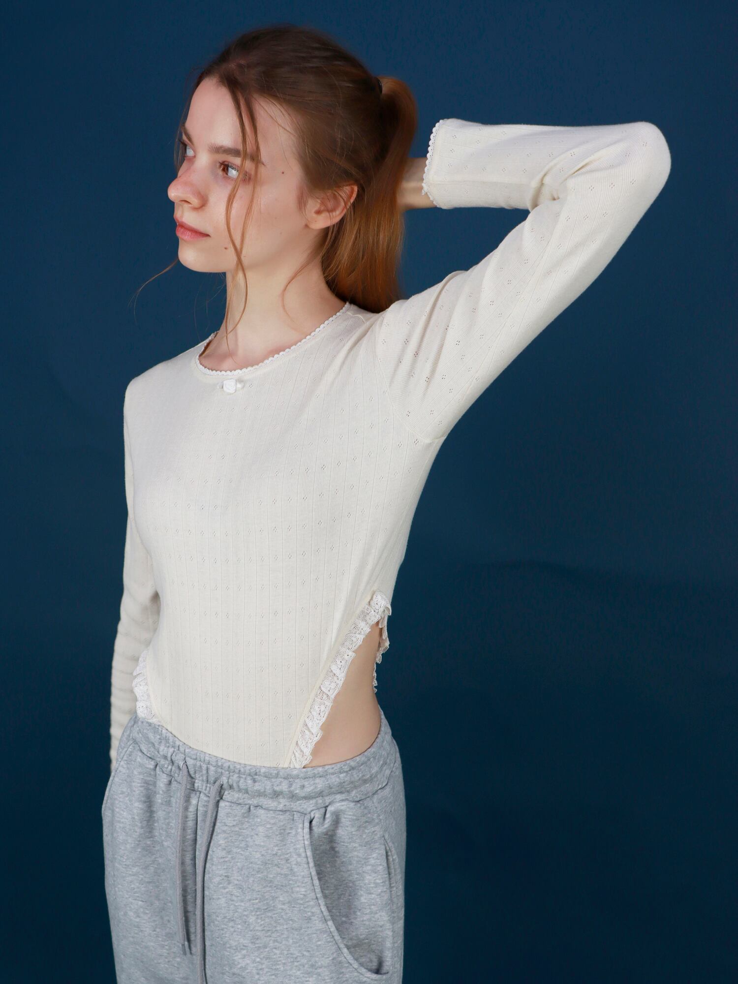 両サイドのお腹が見えるちょっぴり大胆なシルエットながら、首元と袖口にあしらわれた繊細なレースが、可愛らしさをプラスしてくれます。