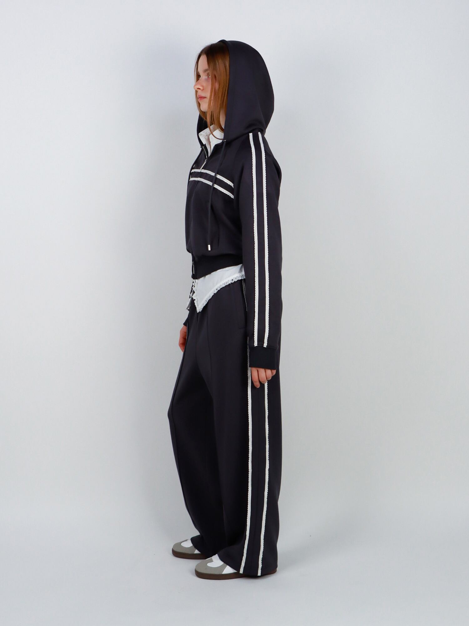 同じ素材・レースを使ったスウェットパンツとセットアップで着用すれば、全体に統一感が生まれ、よりこなれ感のある着こなしに仕上がります。