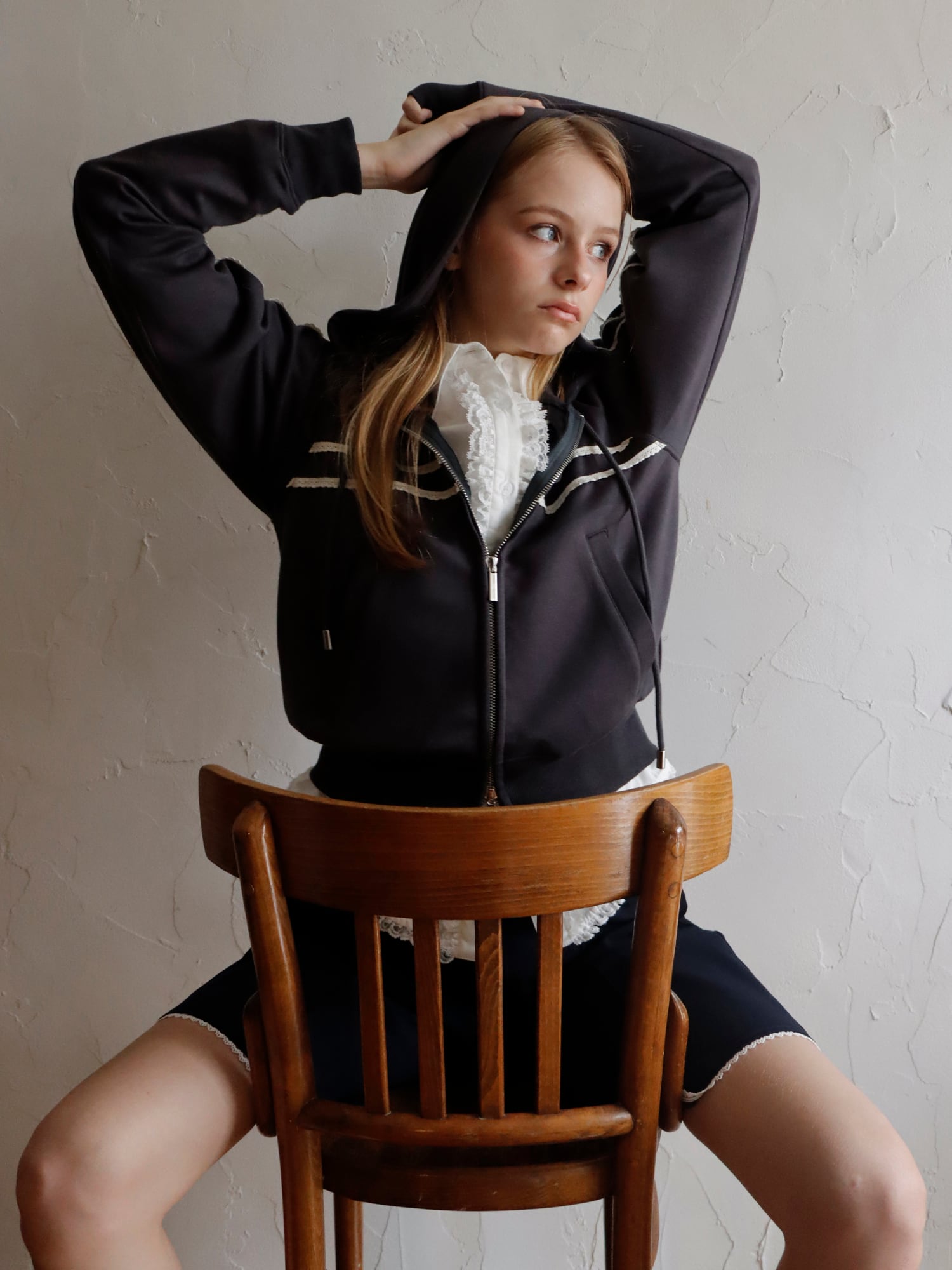 スポーティーなジャージ素材にガーリー要素を取り入れることで、カジュアルすぎない仕上がりに。とくに胸元のレースラインは、重ね着しても埋もれず存在感がありスタイリングのポイントになってくれます。