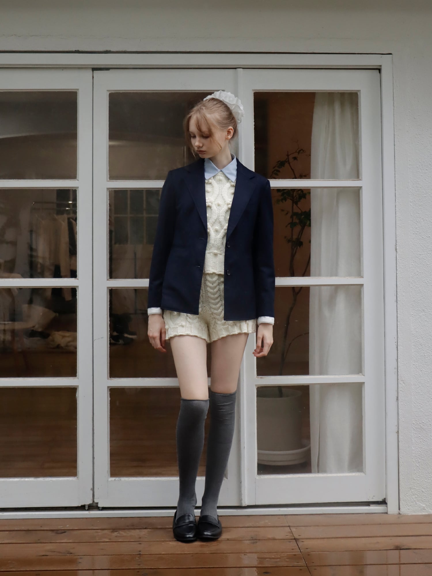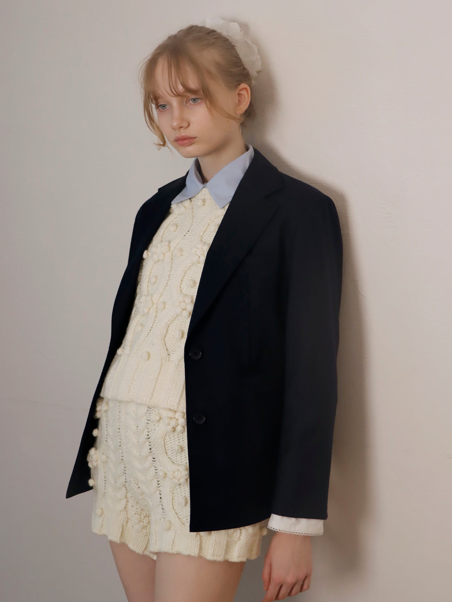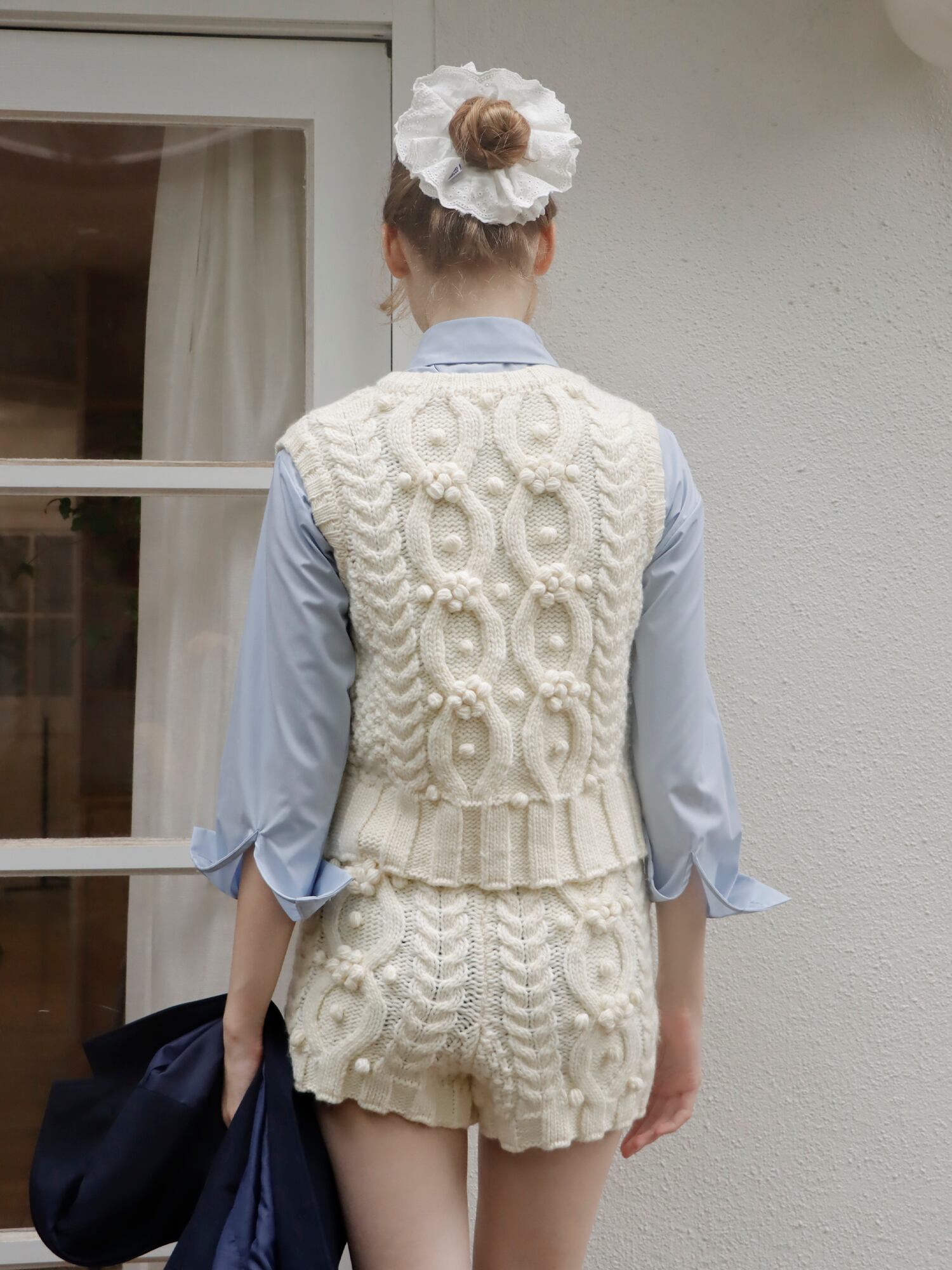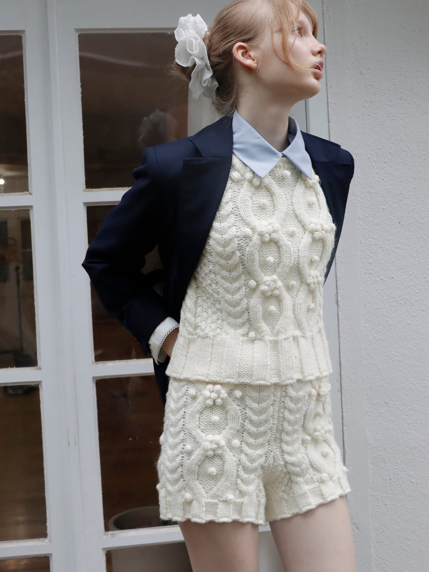 袖がないデザインなので、アウターを重ねてももたつかず、すっきりと着こなせるのも嬉しいポイント。フロントだけでなく、バックにもあしらわれたお花のモチーフは、ホイップクリームをイメージしたもの。ひとつひとつ職人の手によって丁寧にお花をつけており、細部までこだわりを感じる贅沢な仕上がりです。同じモチーフを使用したニットベストと合わせてセットで着ても、統一感があって可愛い印象に。