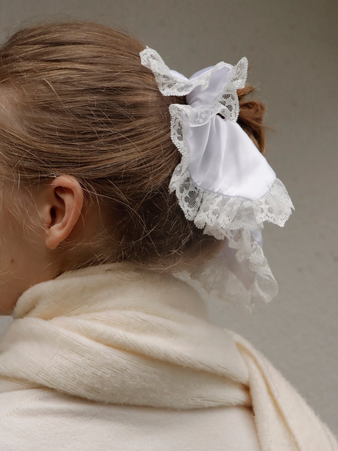 繊細なレースがあしらわれた、冬にぴったりの真っ白なサテンシュシュ。