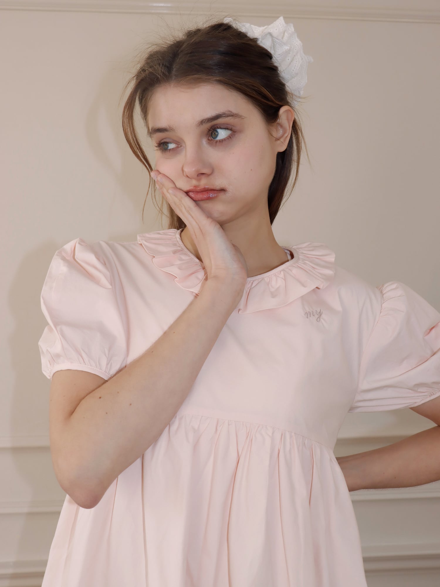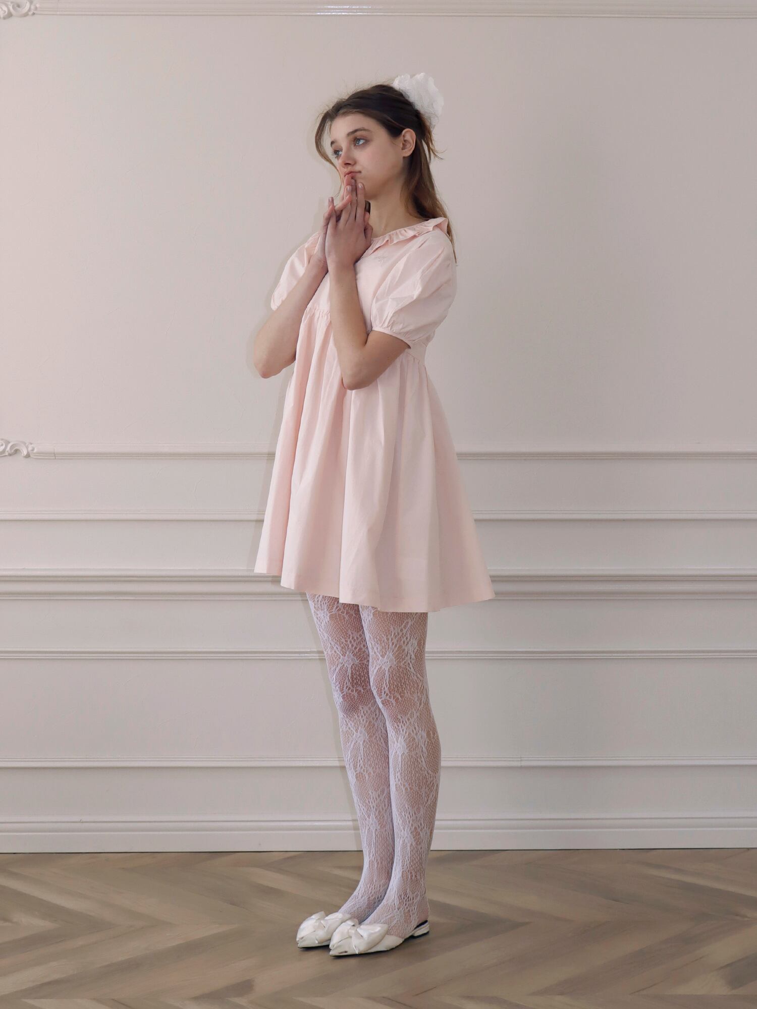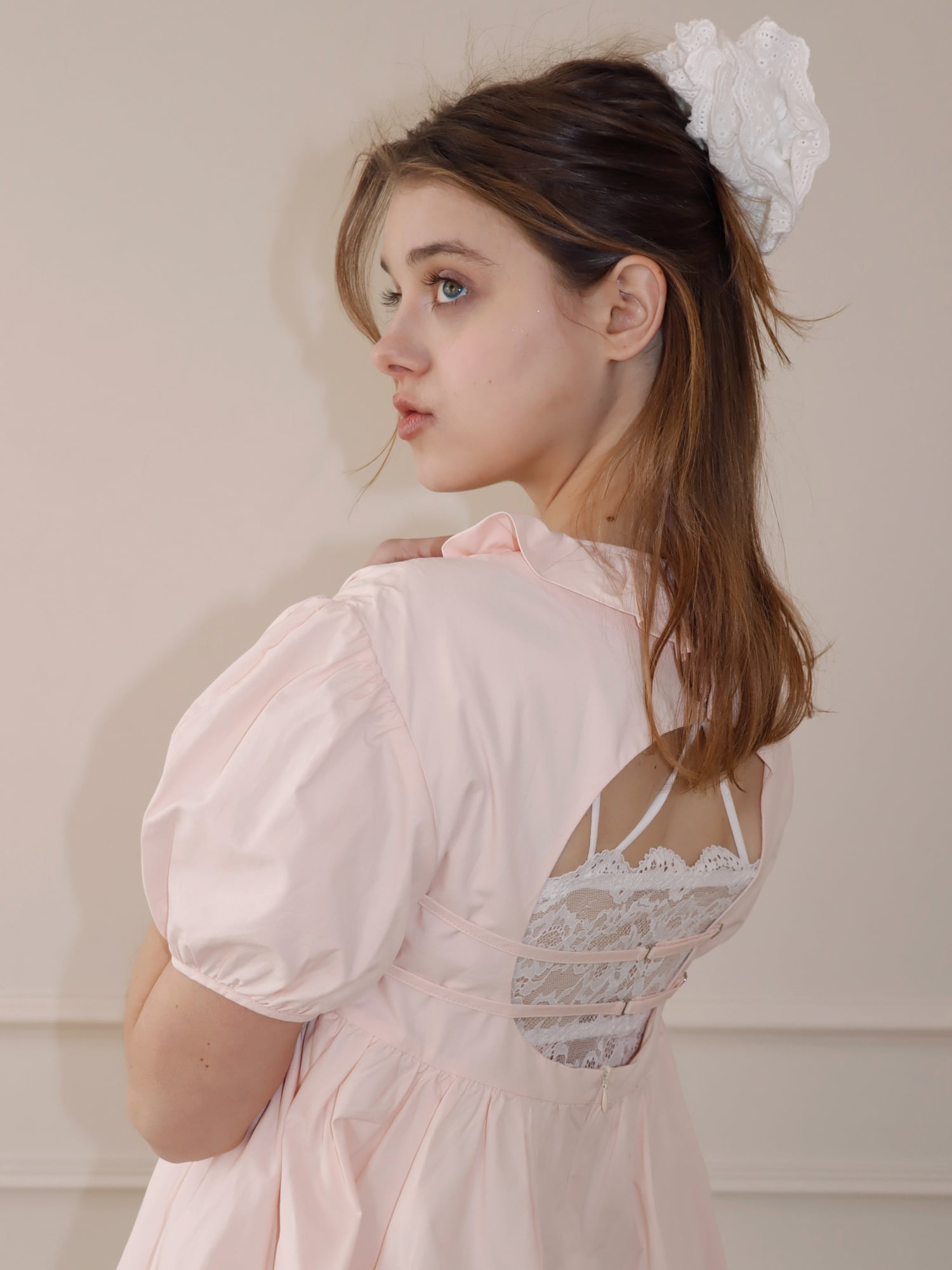 袖は、お花の蕾のようにコロンと丸みのあるシルエットに仕上げ、襟元は花びらを思わせるラインに仕上げました。胸下に切り替えを入れることで、自然とスタイルアップが叶います。