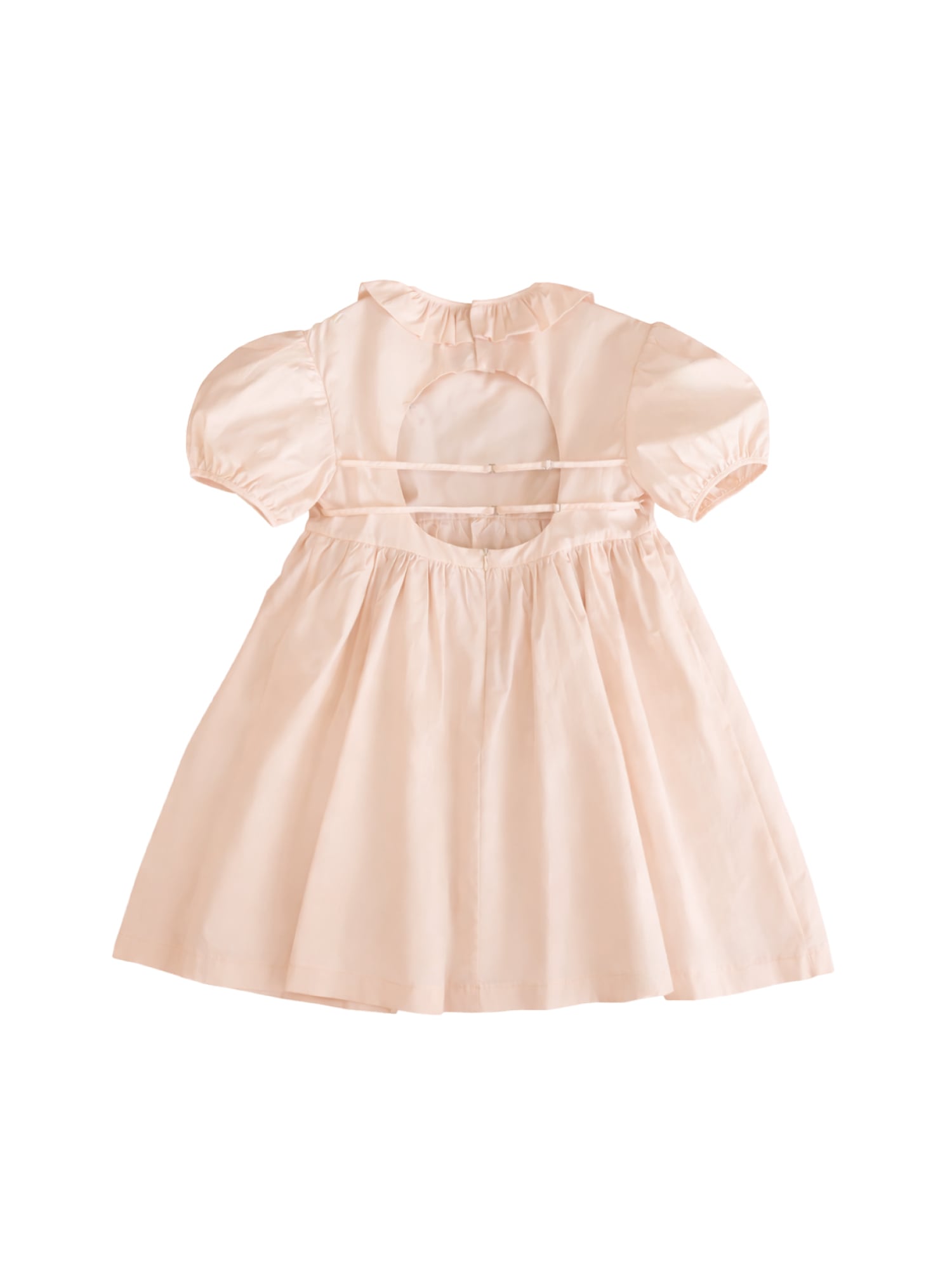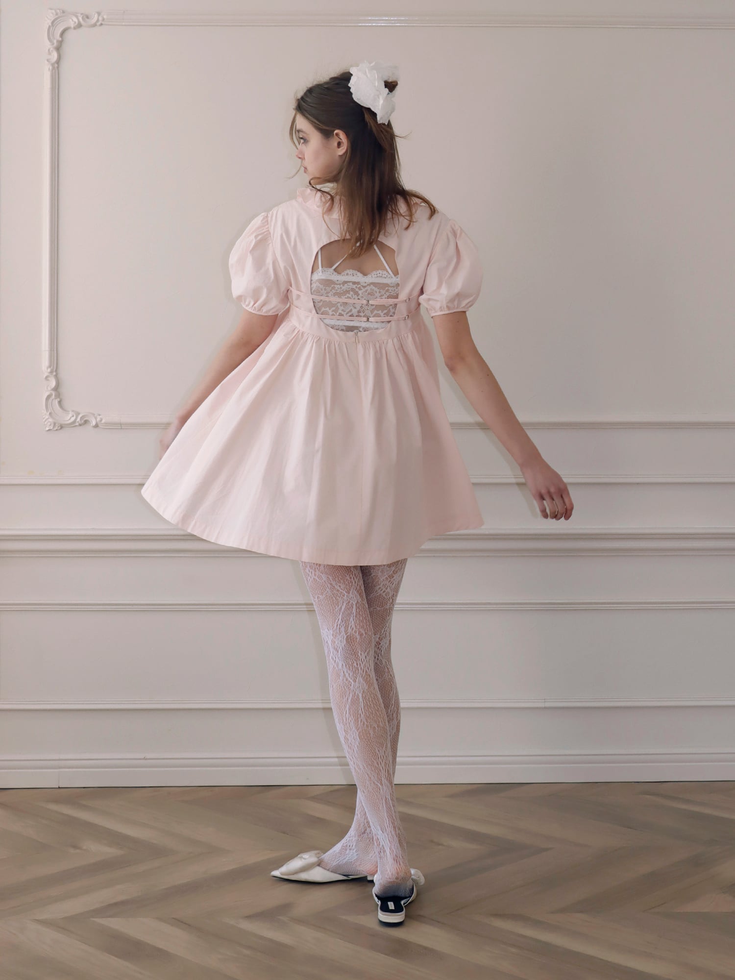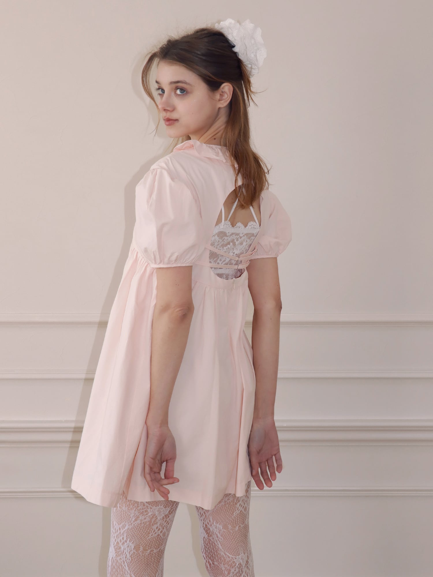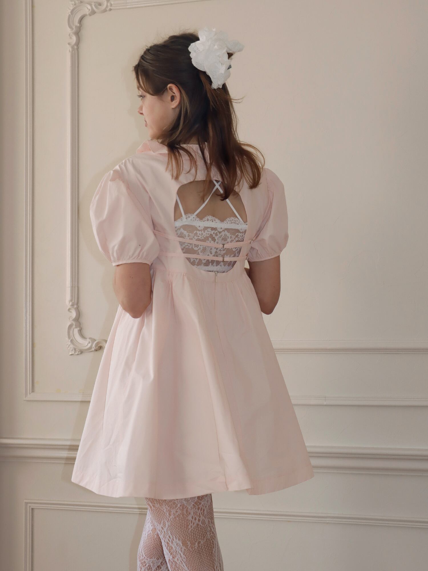 バックスタイルは背中が大きく開いたデザインで、フロントとのギャップが印象的な仕上がりに。