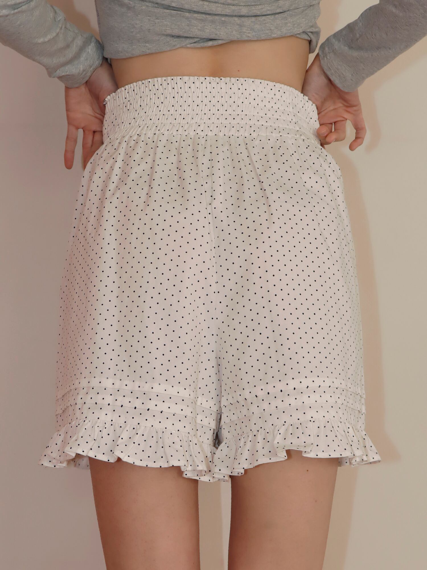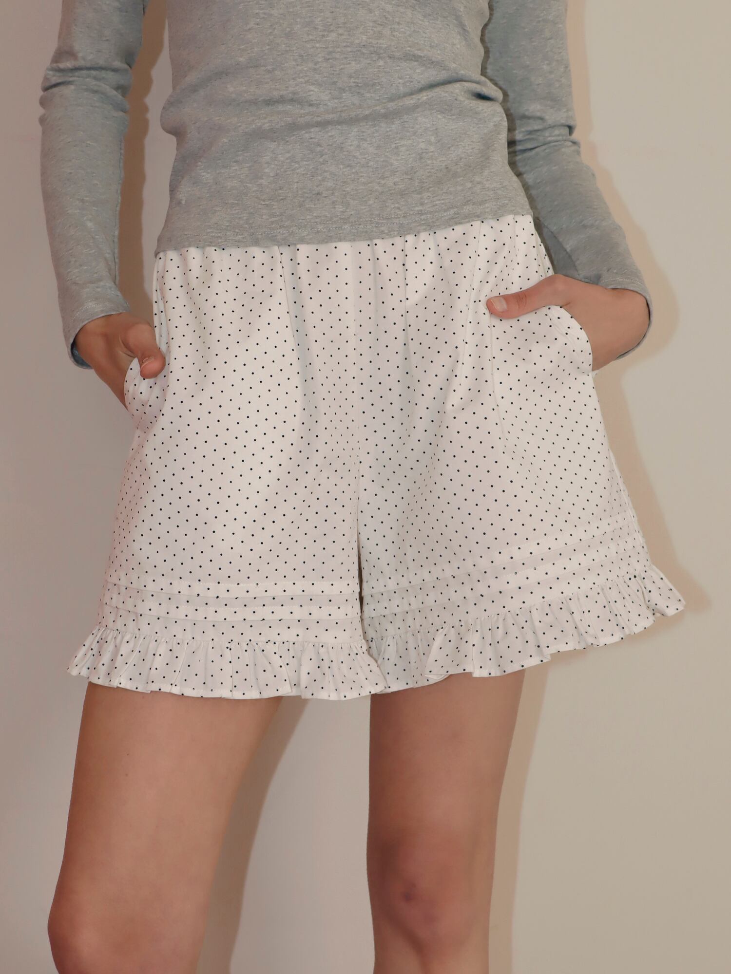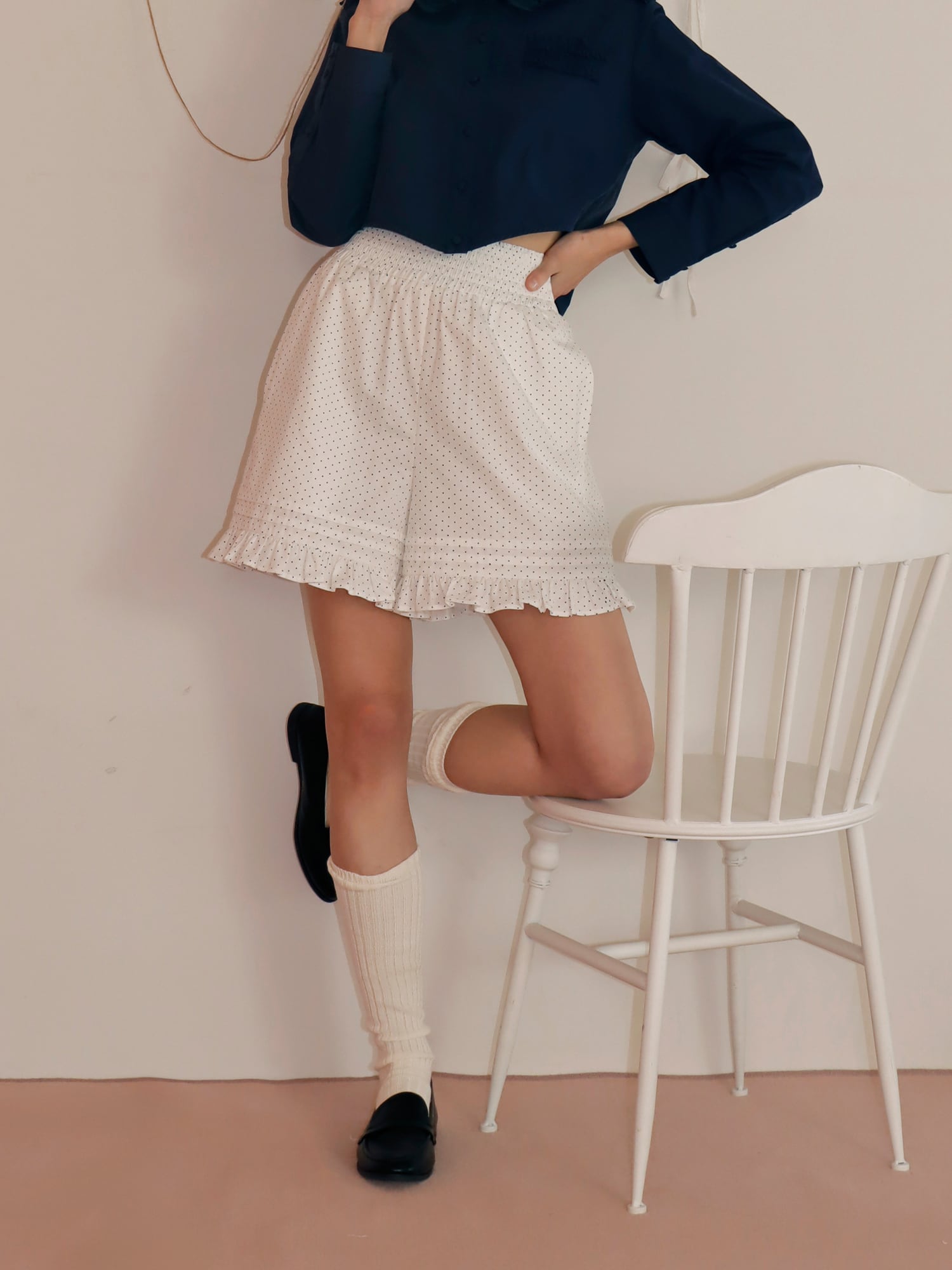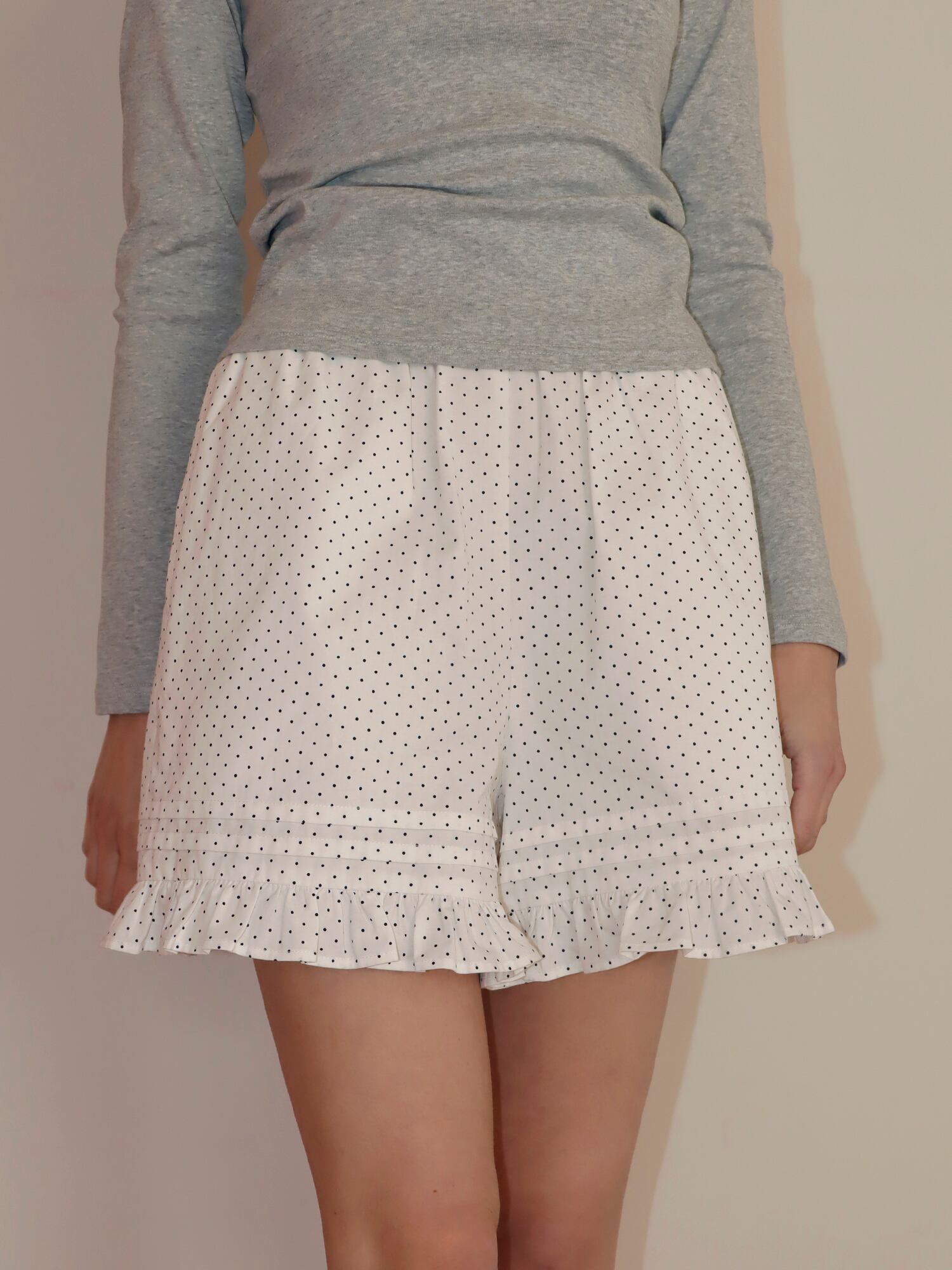 裾にフリルをあしらい、程よくガーリーなアクセントを加えたハーフパンツ。