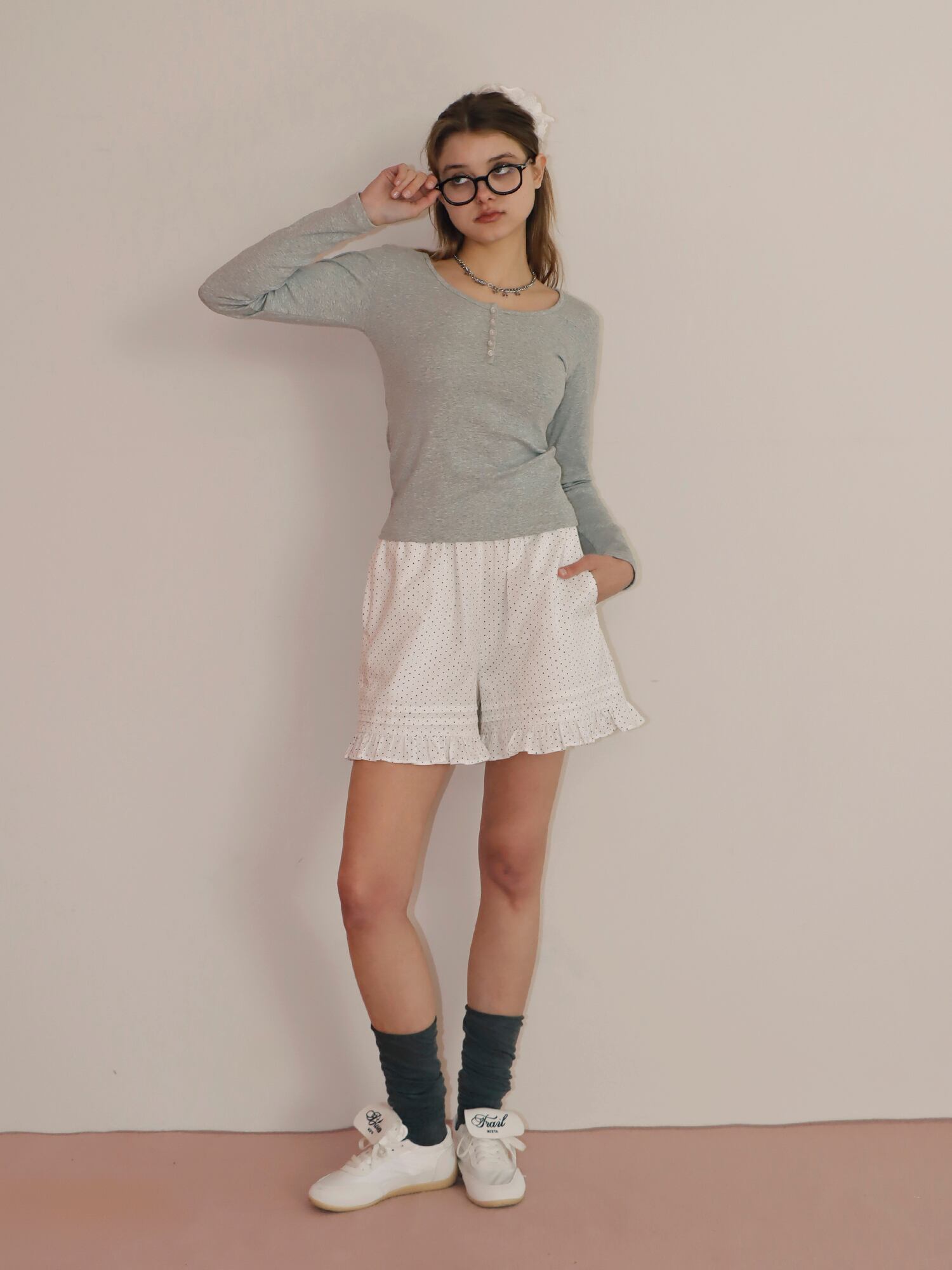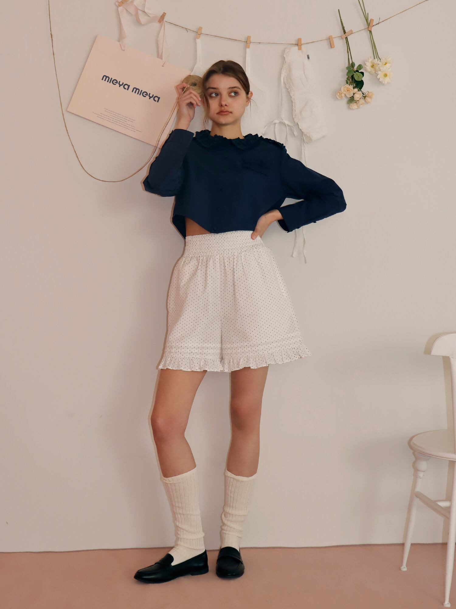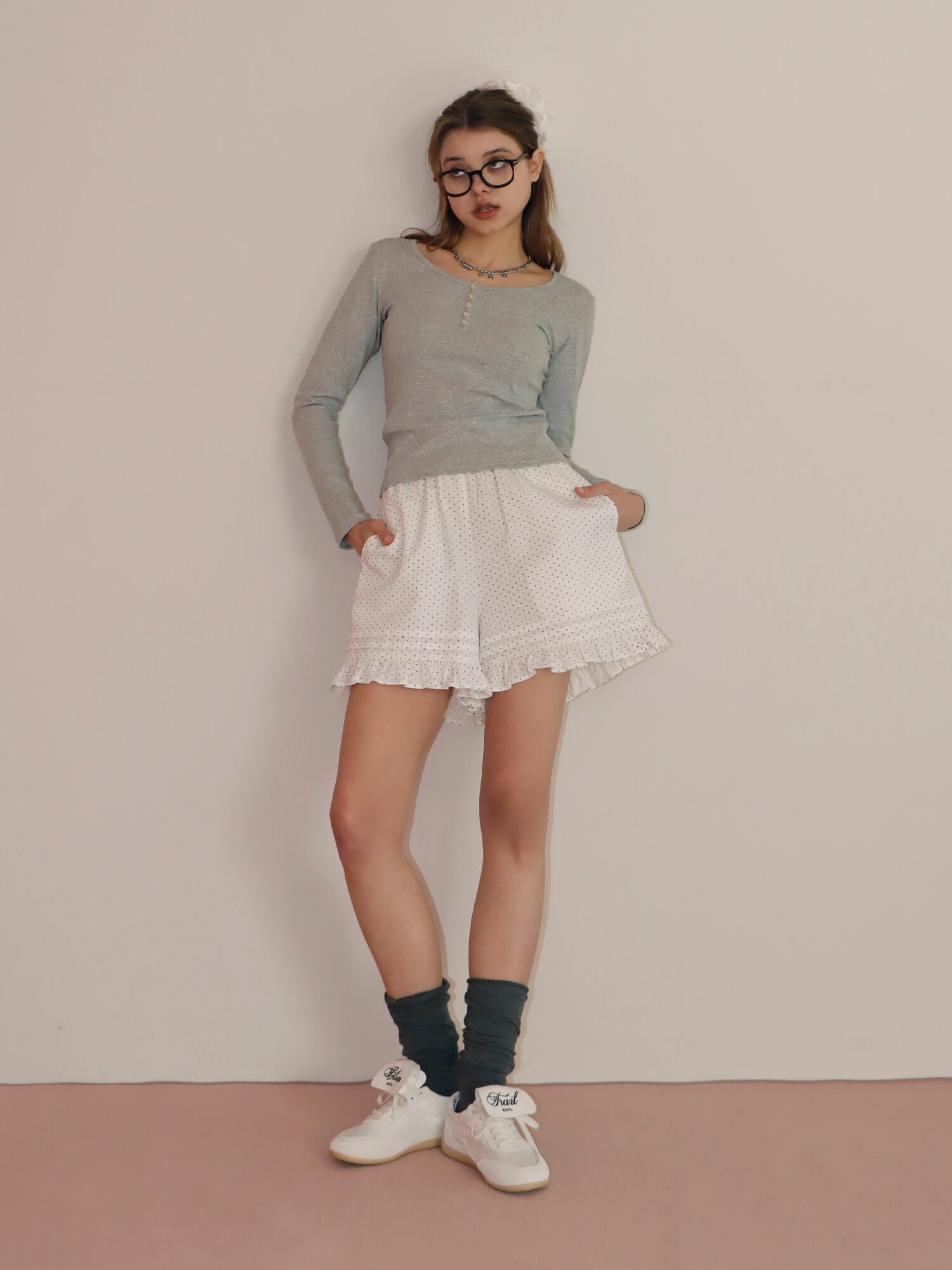 裾にフリルをあしらい、程よくガーリーなアクセントを加えたハーフパンツ。
