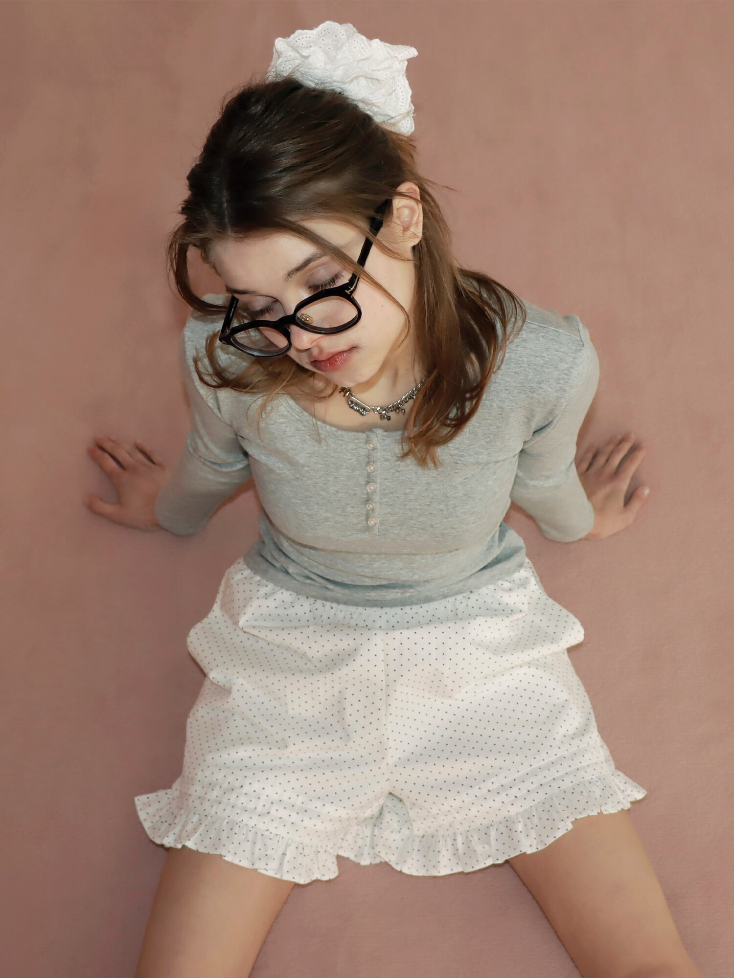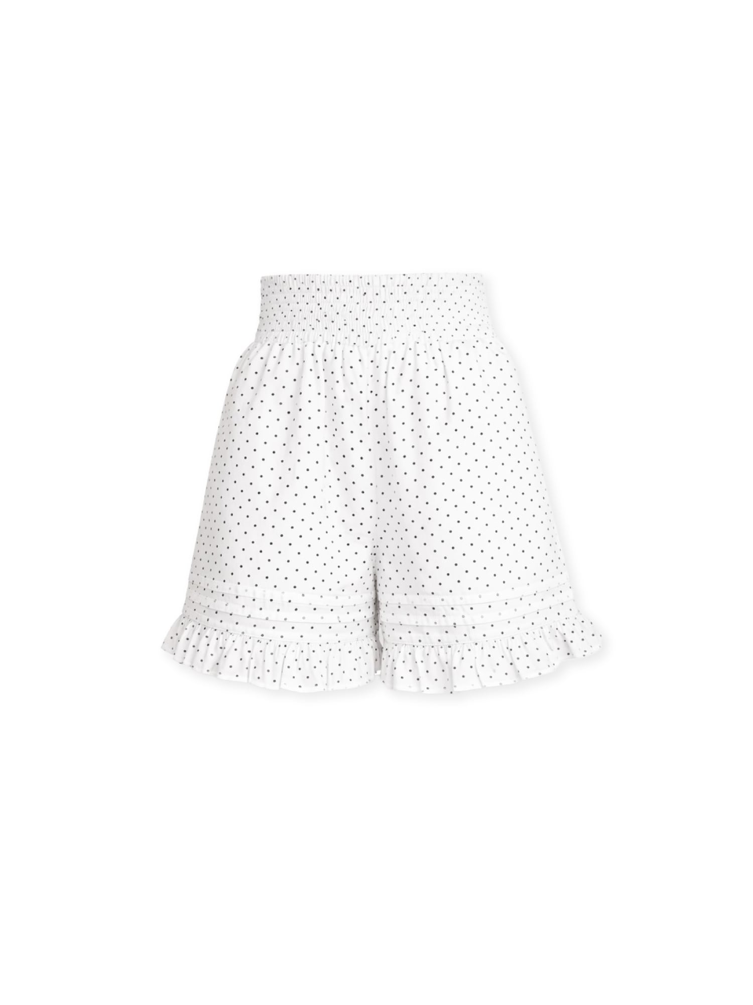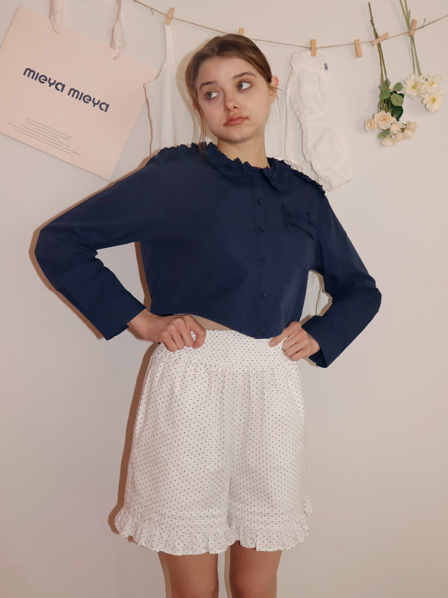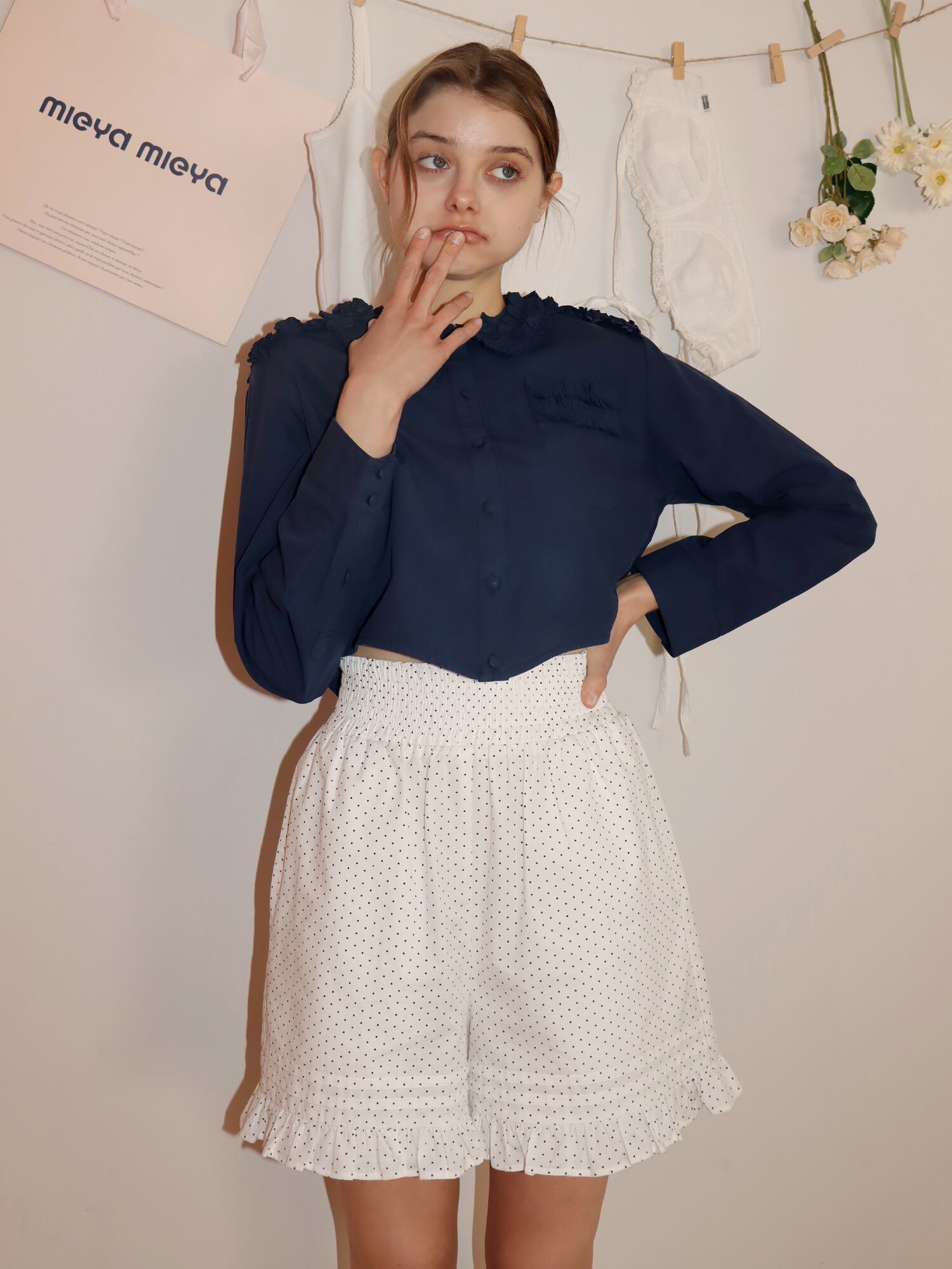 裾にフリルをあしらい、程よくガーリーなアクセントを加えたハーフパンツ。
