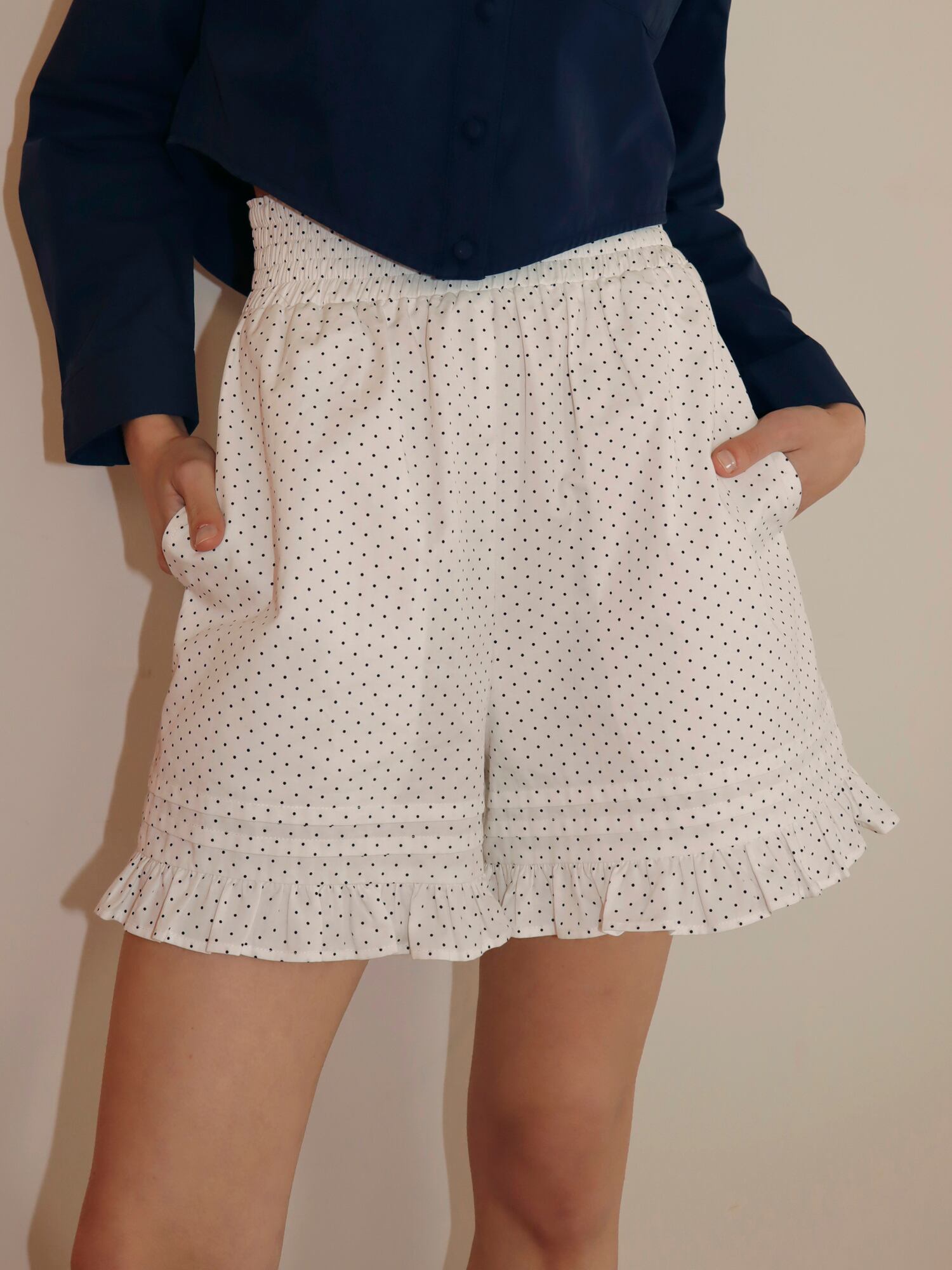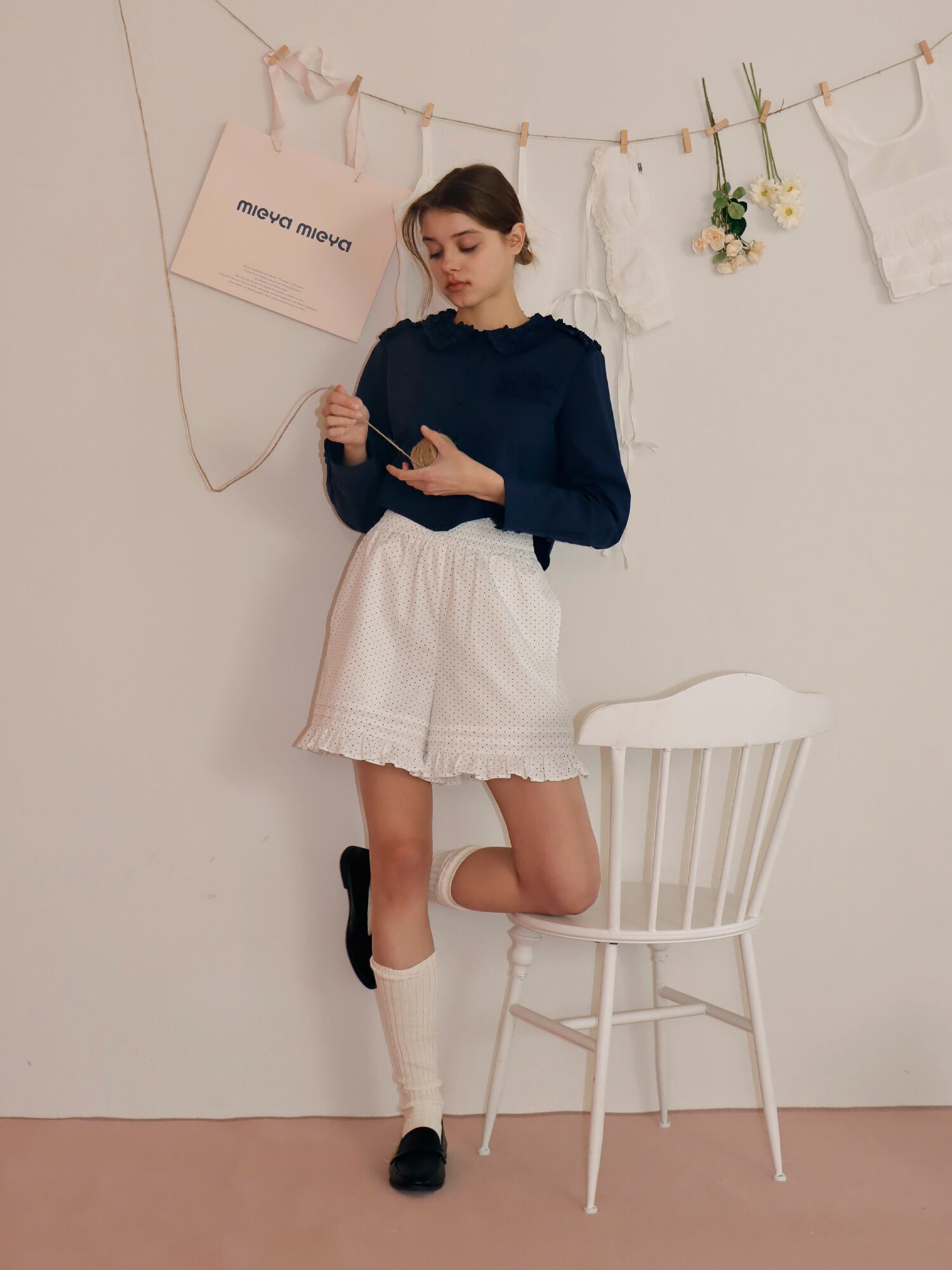 カラーは、ガーリーなホワイト、コーデの主役になるトレンドのドット、着回し力の高いネイビーの3色展開。スウェットやTシャツと合わせたラフなスタイリングから、ブラウスを合わせたきれいめカジュアルまで幅広く対応し、スタイリング次第で印象を変えて楽しめる万能ハーフパンツです。