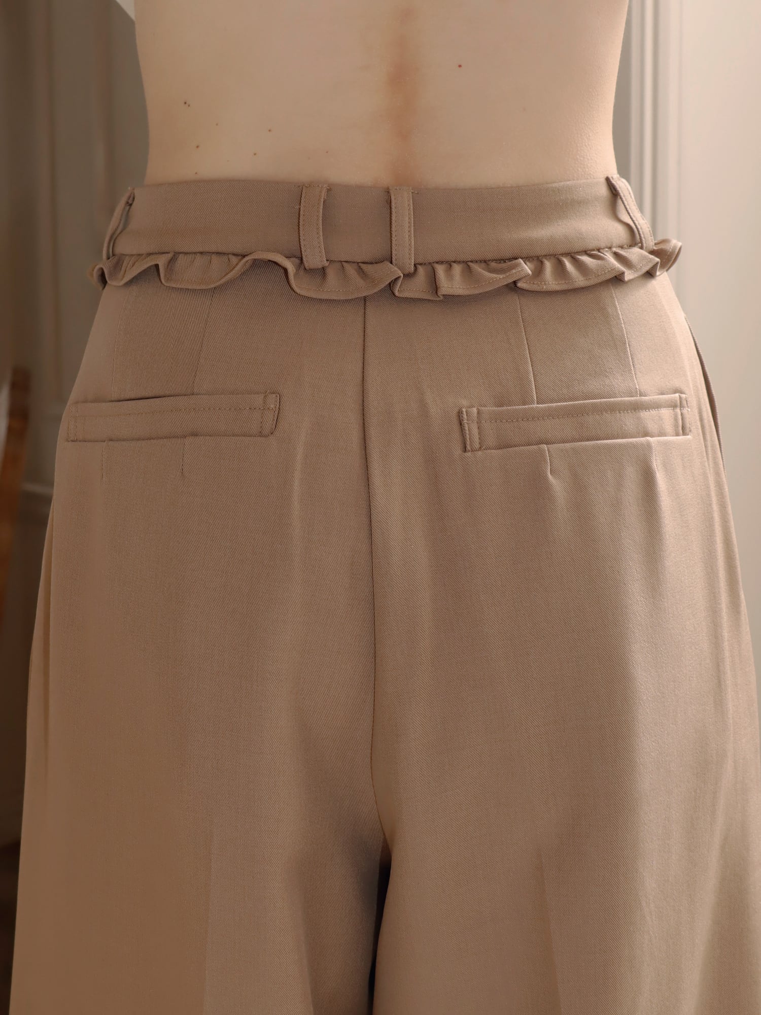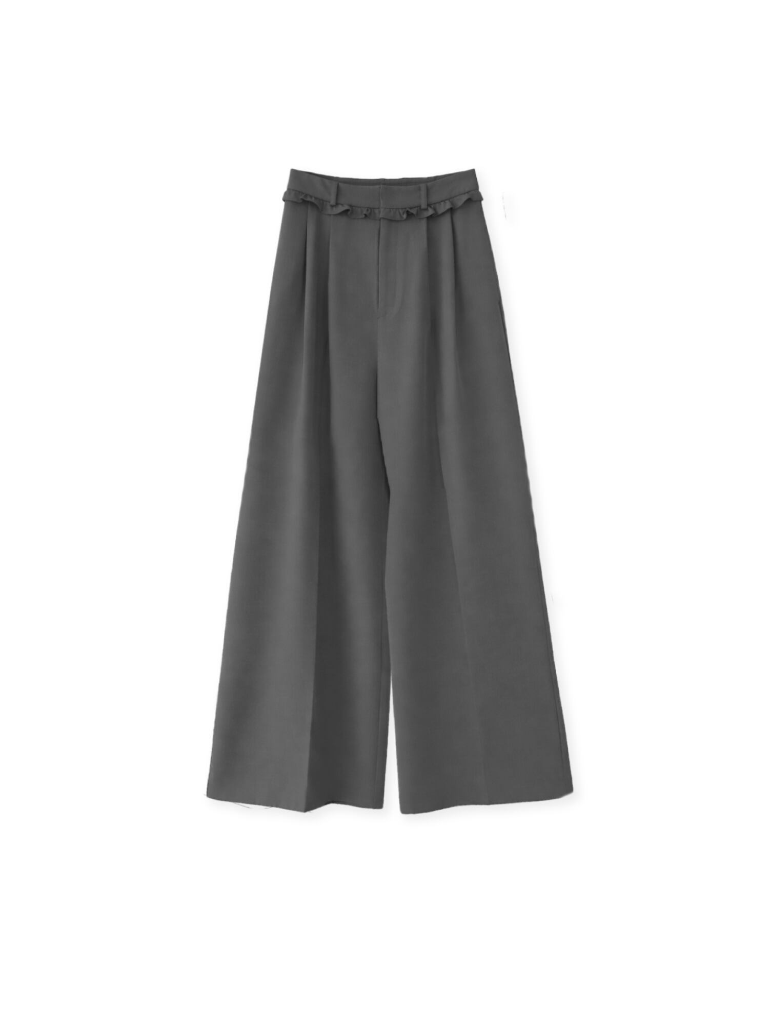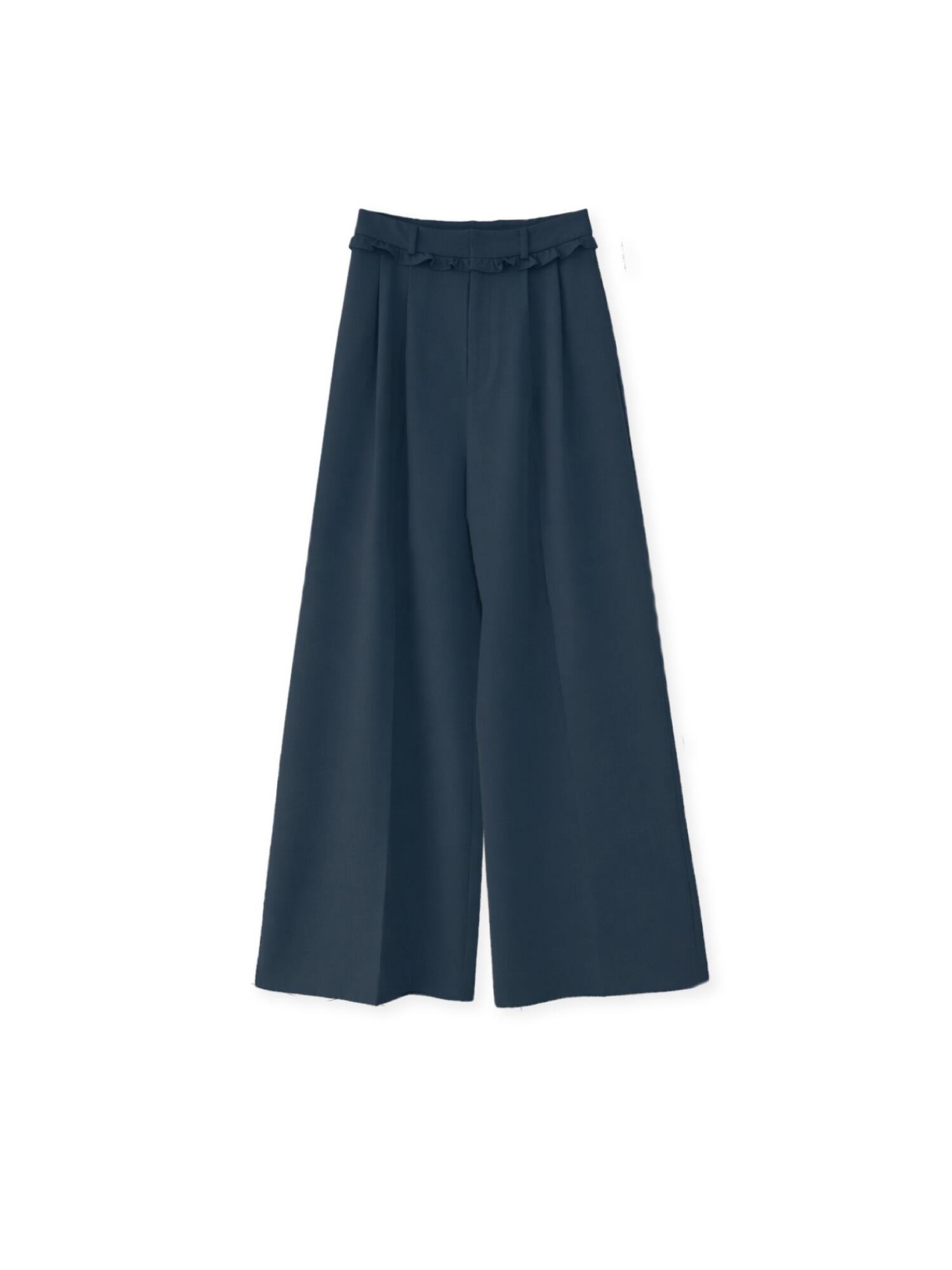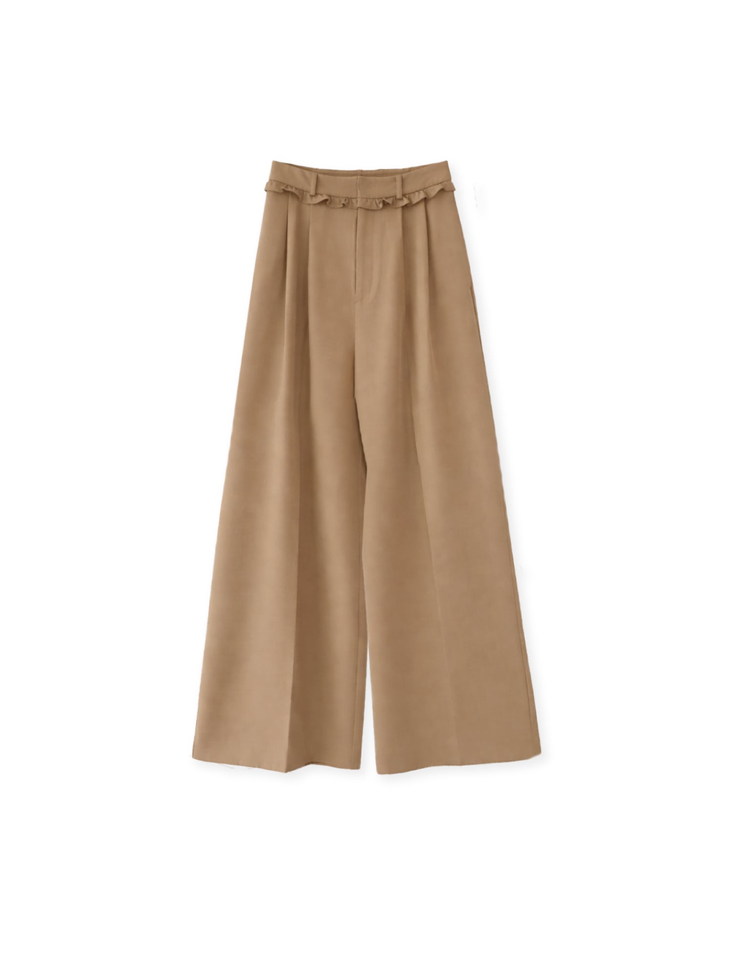 トレンド感のあるワイドシルエットに、ベルト部分のフリルデザインをプラスしたワイドパンツ。