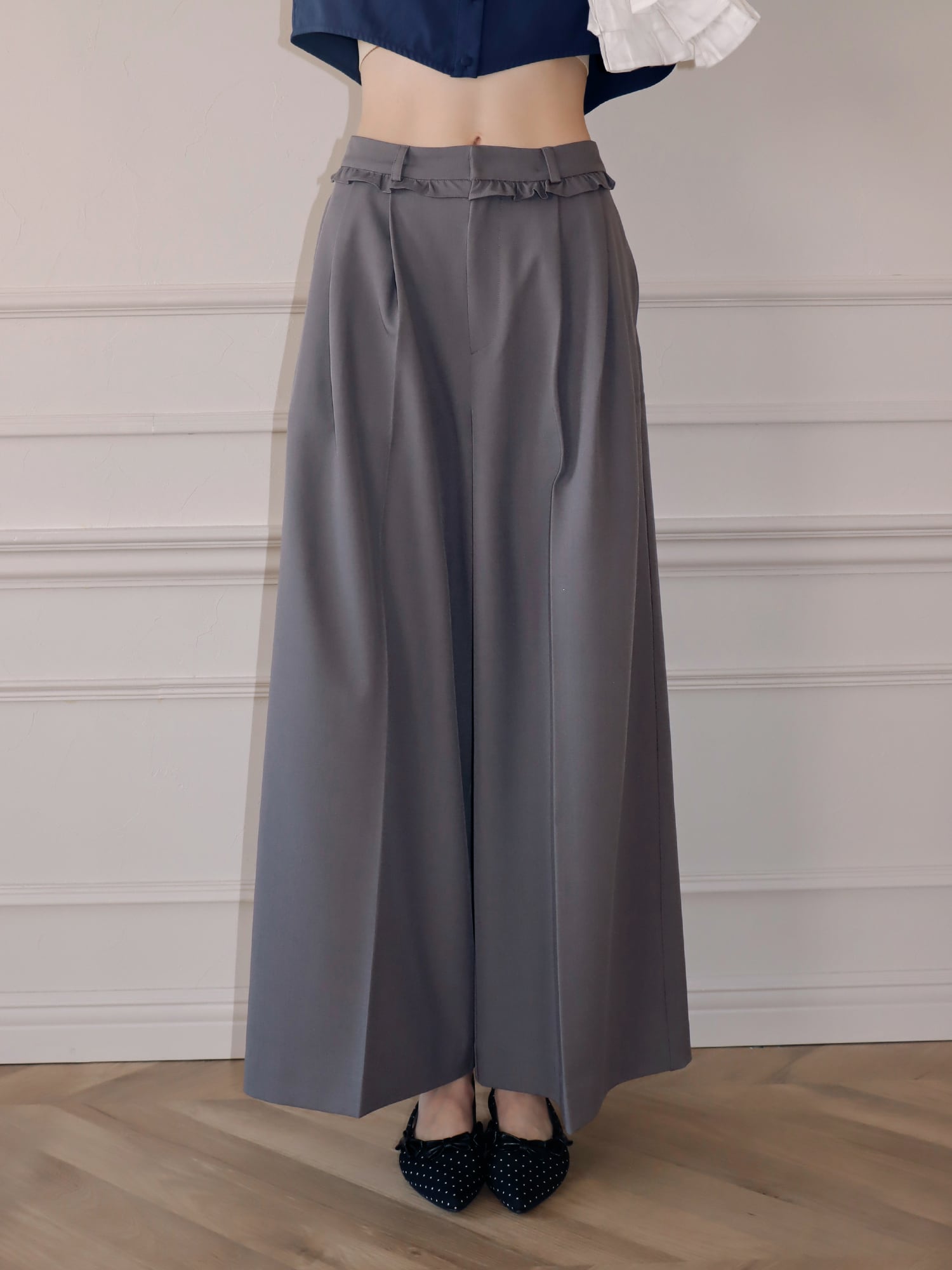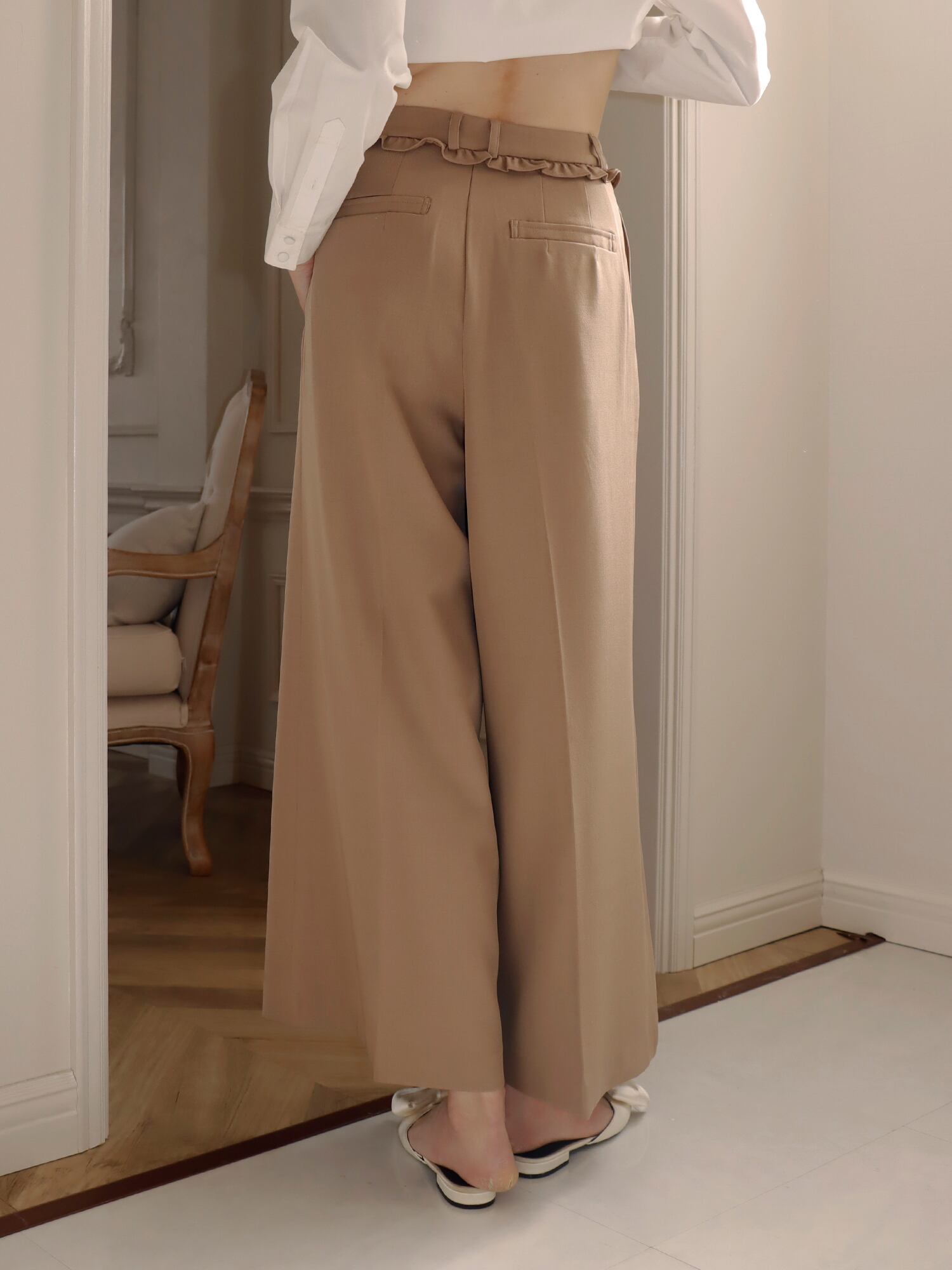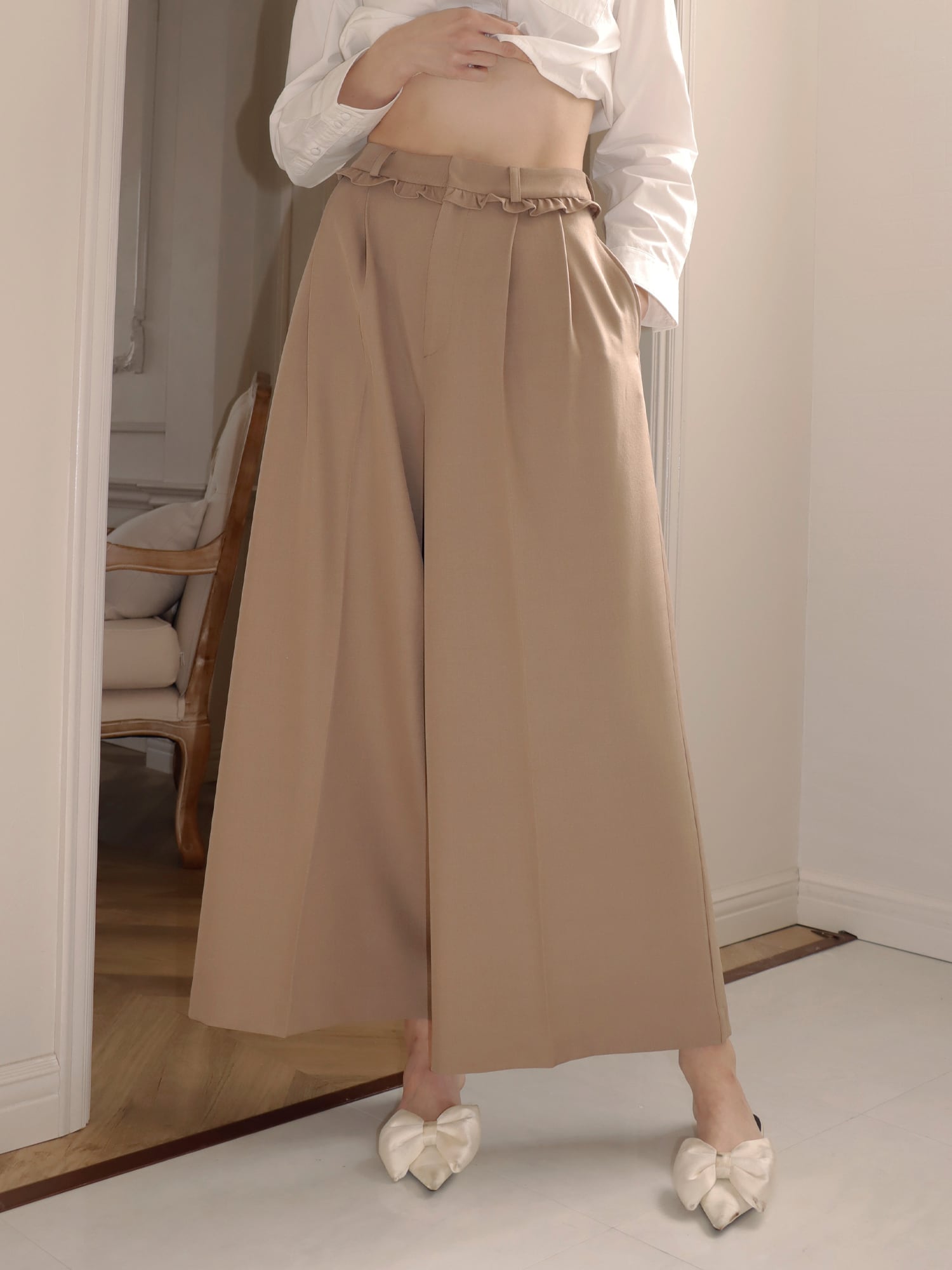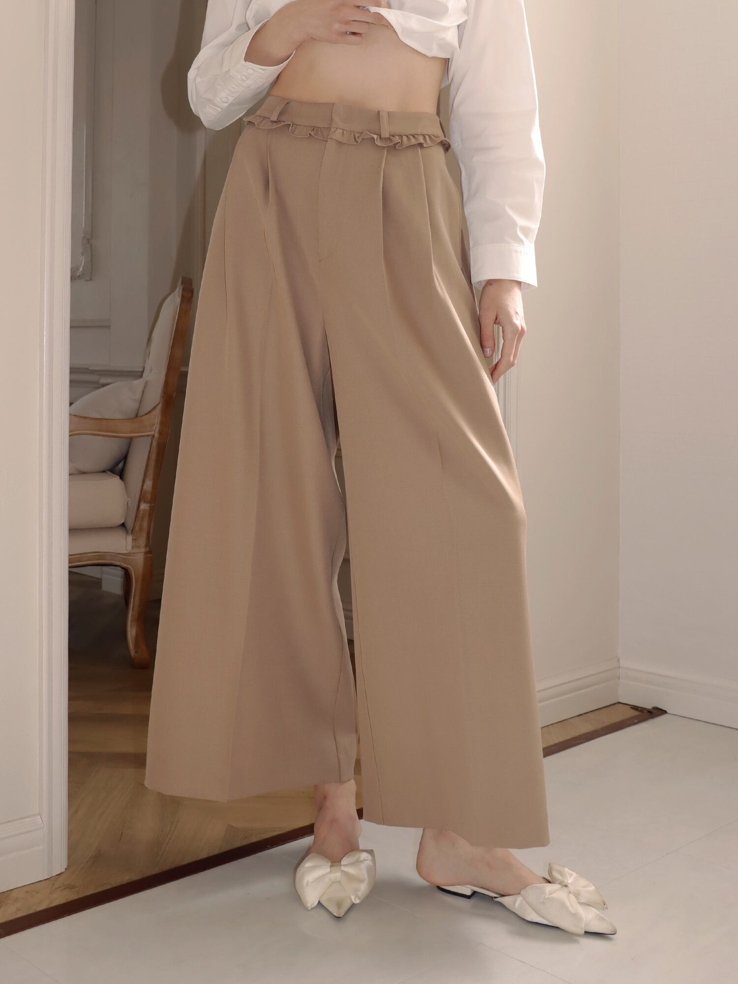 スラックスベースのデザインながら、フリルがほどよくガーリーなアクセントになり、かっちりしすぎず柔らかな印象で着こなせます。丈はあえて長めに設定し、自然と縦ラインを強調。脚をすらっと見せ、スタイルアップ効果も期待できる一枚です。