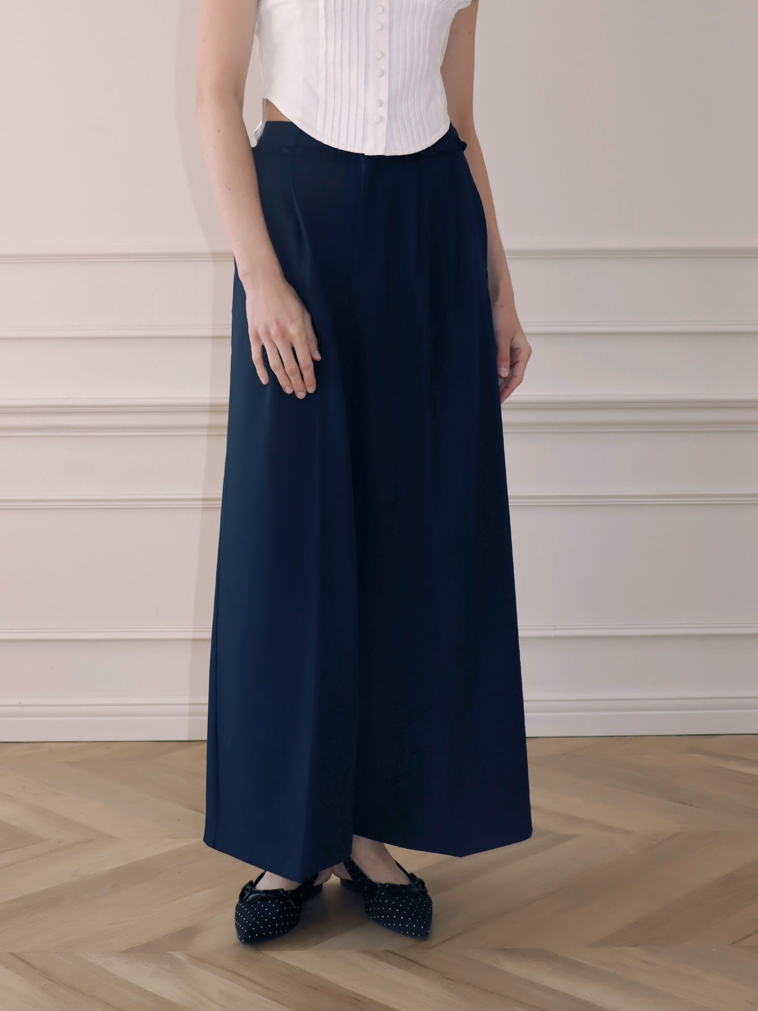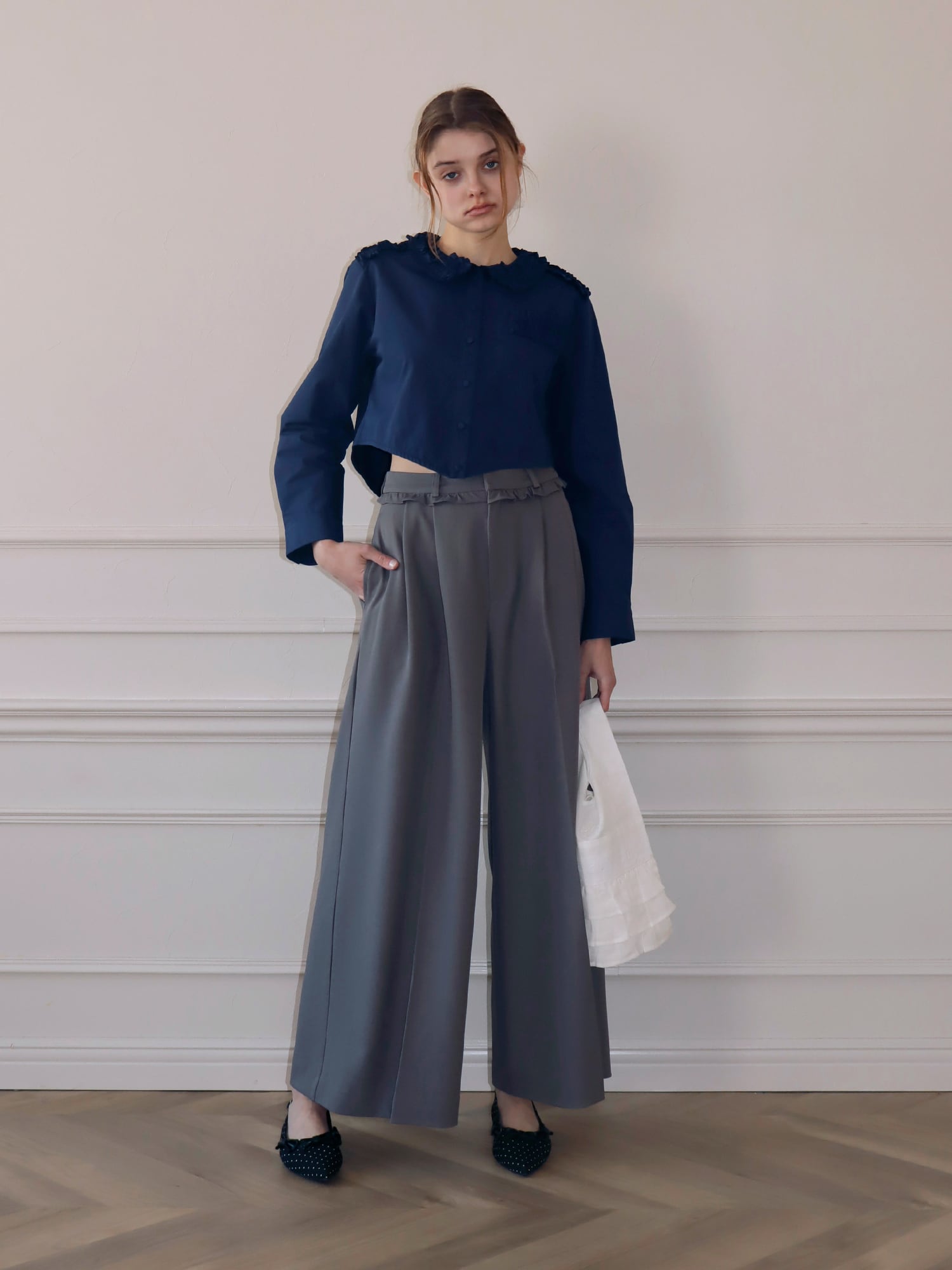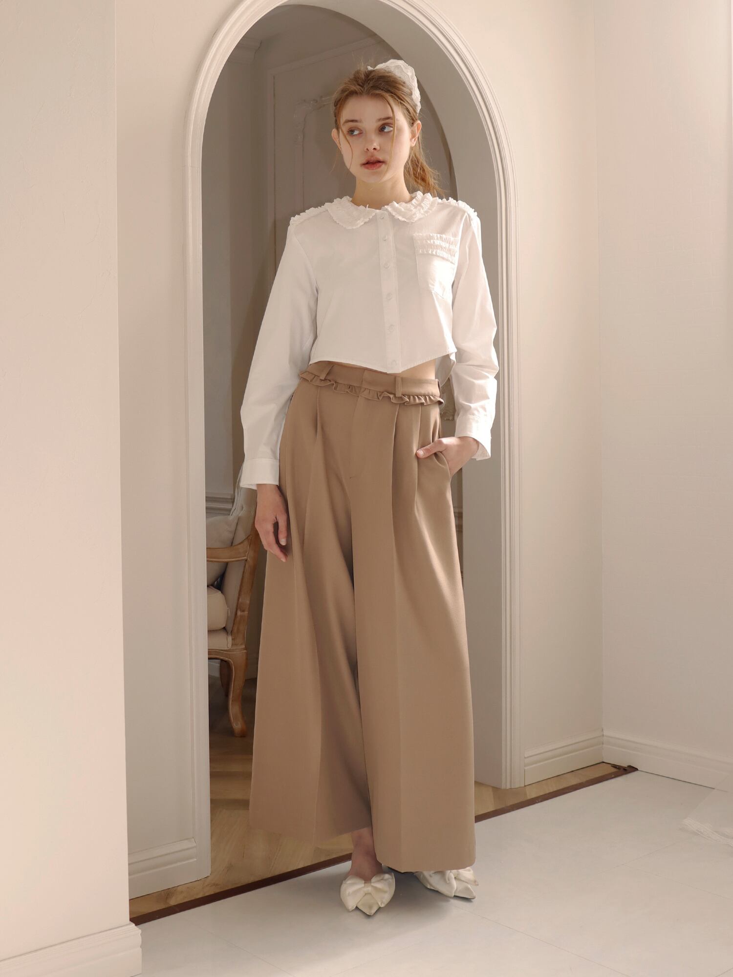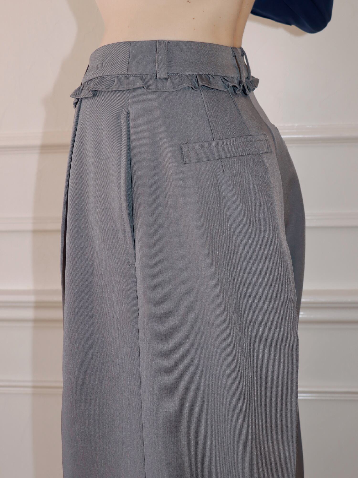 スラックスベースのデザインながら、フリルがほどよくガーリーなアクセントになり、かっちりしすぎず柔らかな印象で着こなせます。丈はあえて長めに設定し、自然と縦ラインを強調。脚をすらっと見せ、スタイルアップ効果も期待できる一枚です。