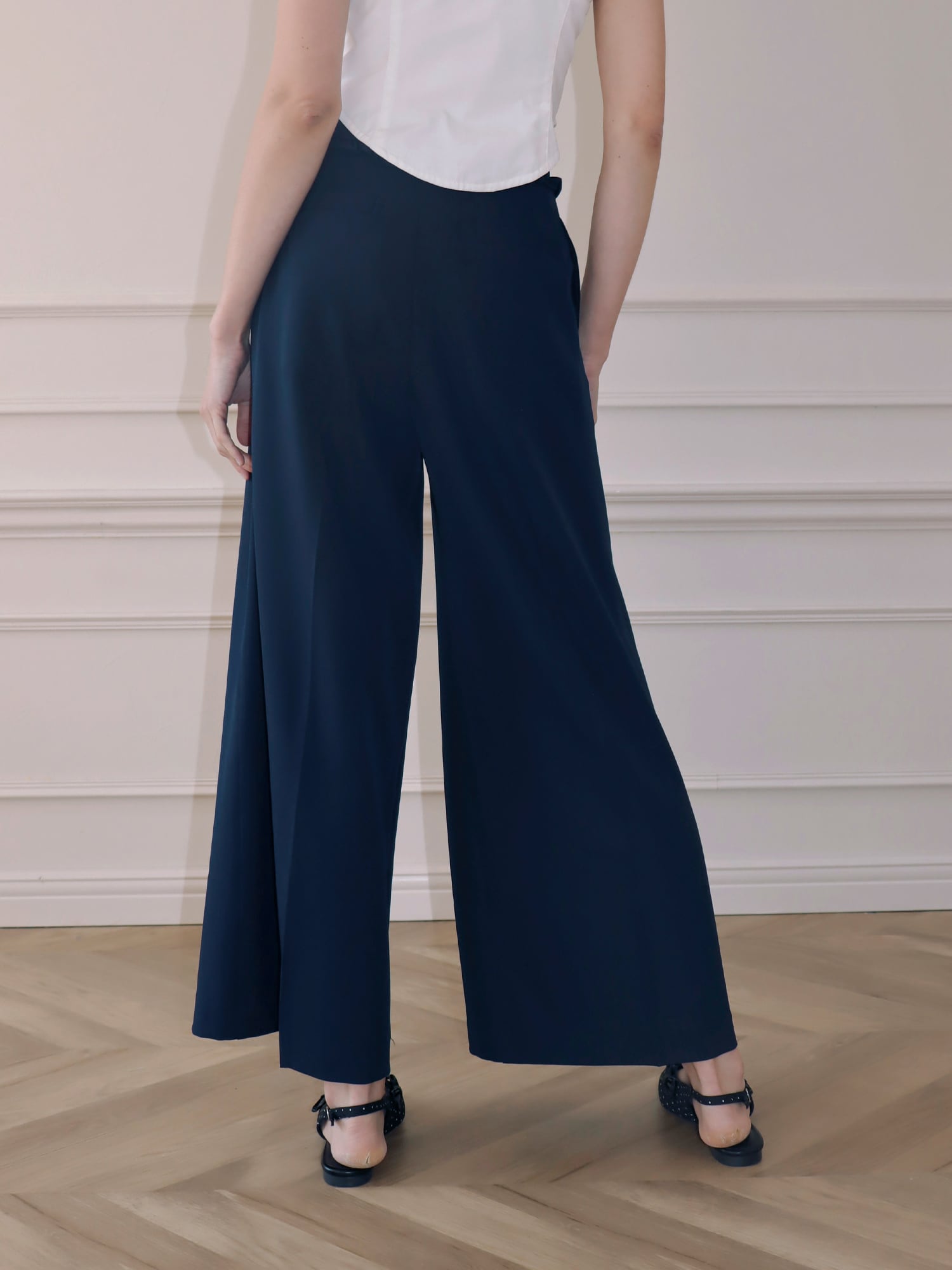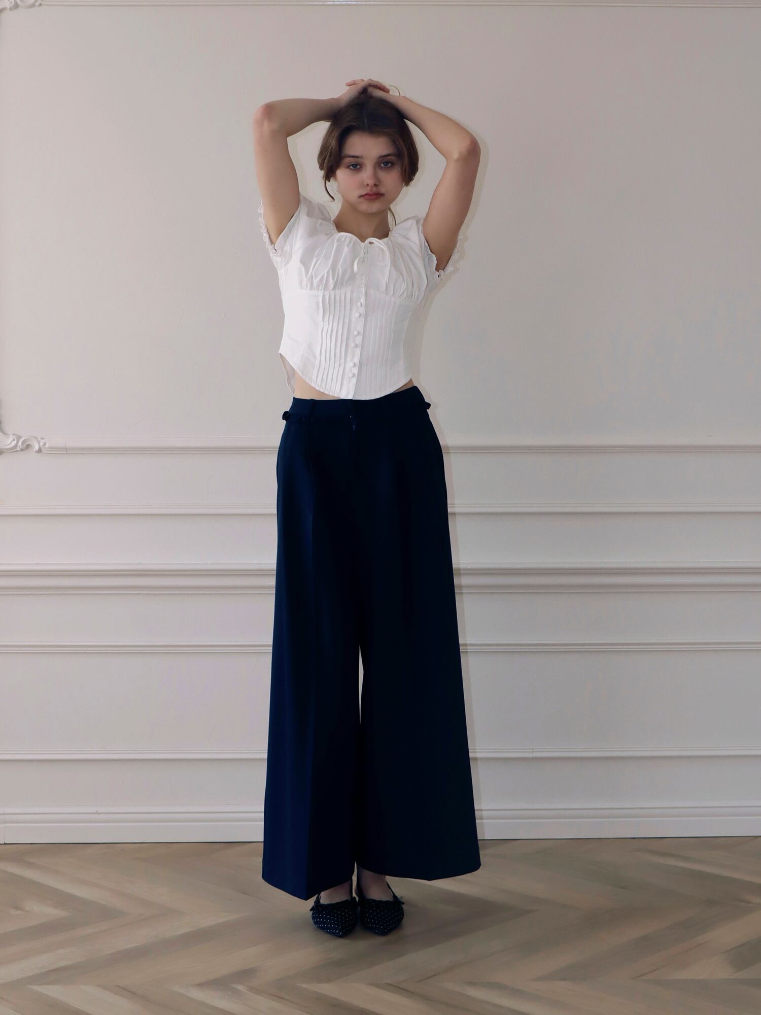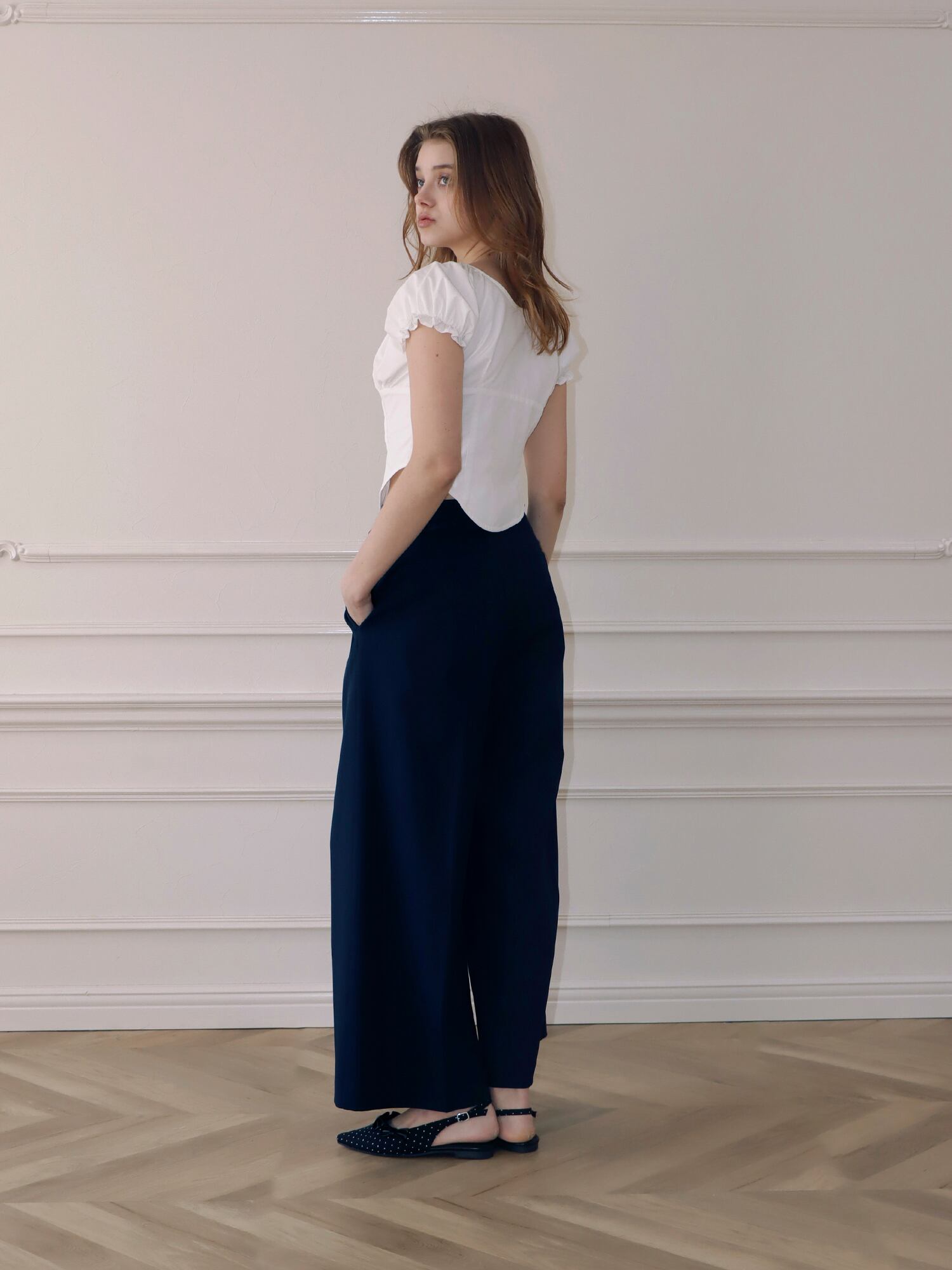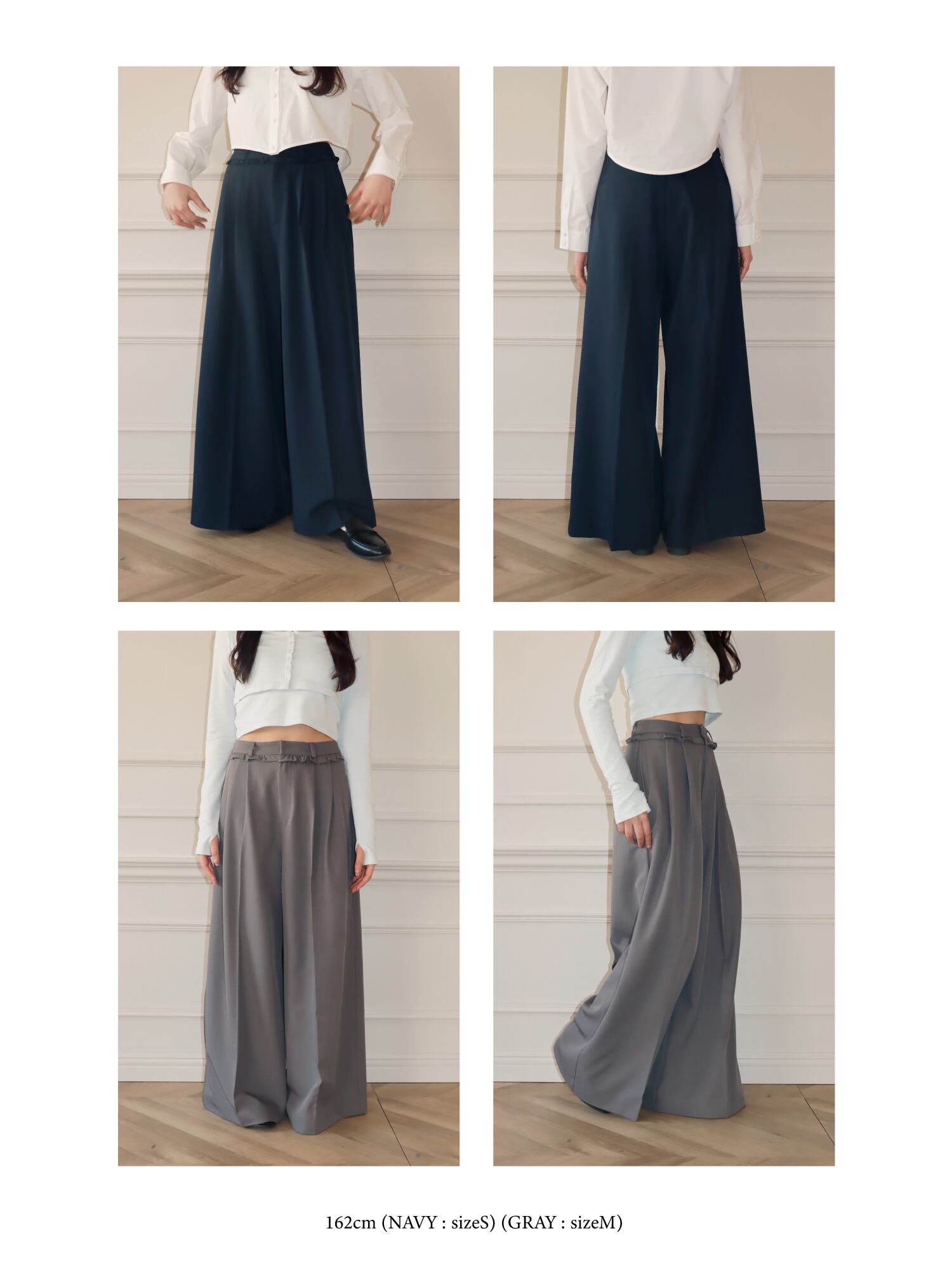 スラックスベースのデザインながら、フリルがほどよくガーリーなアクセントになり、かっちりしすぎず柔らかな印象で着こなせます。丈はあえて長めに設定し、自然と縦ラインを強調。脚をすらっと見せ、スタイルアップ効果も期待できる一枚です。