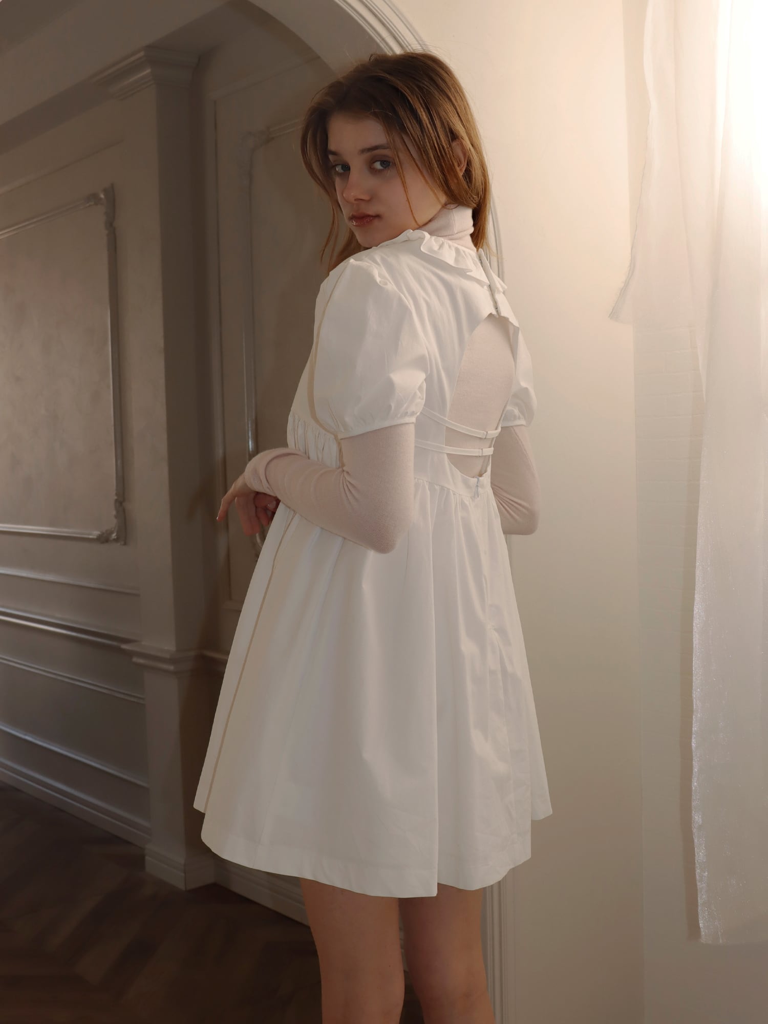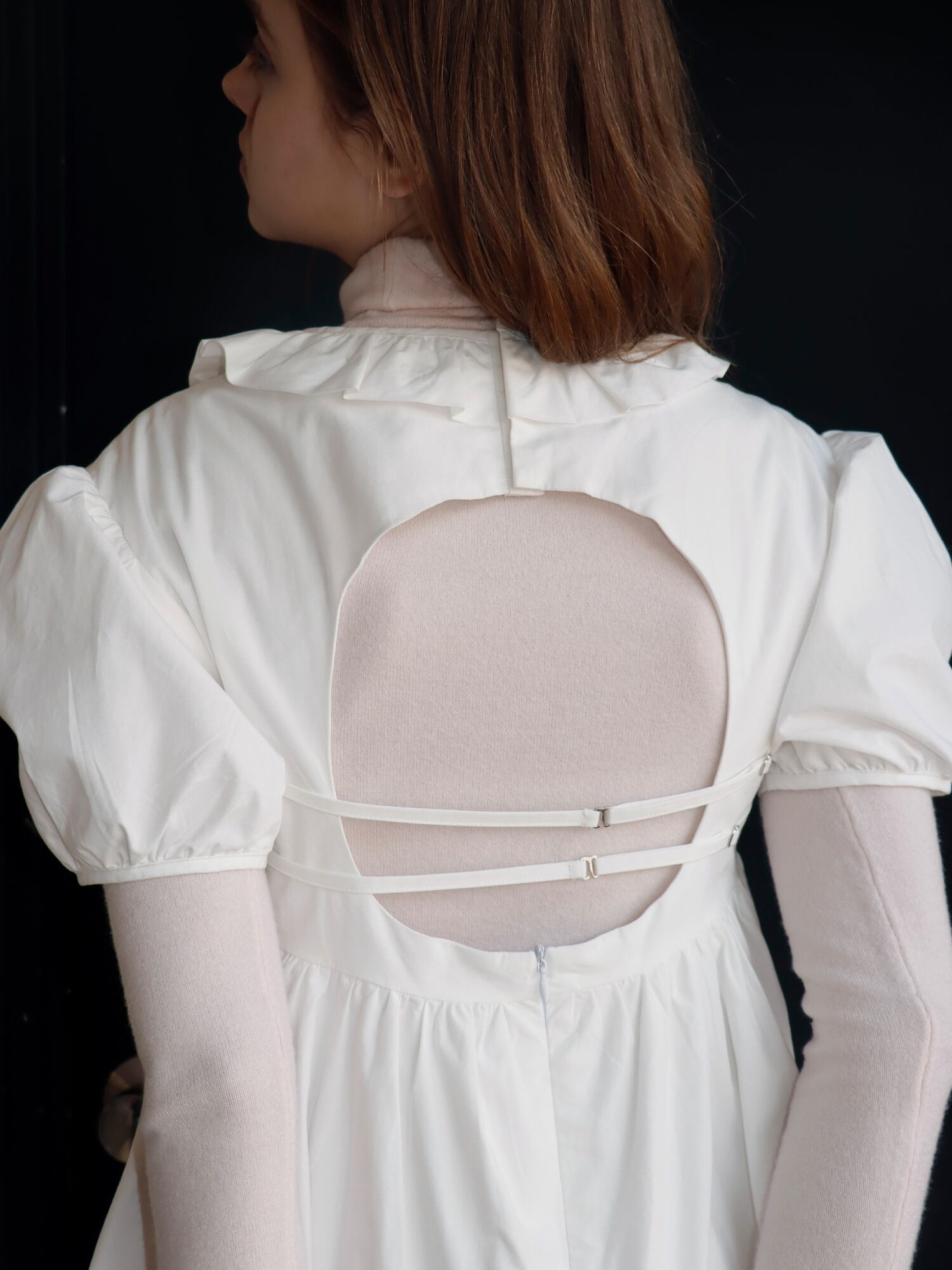 バックスタイルは背中が大きく開いたデザインで、フロントとのギャップが印象的な仕上がりに。