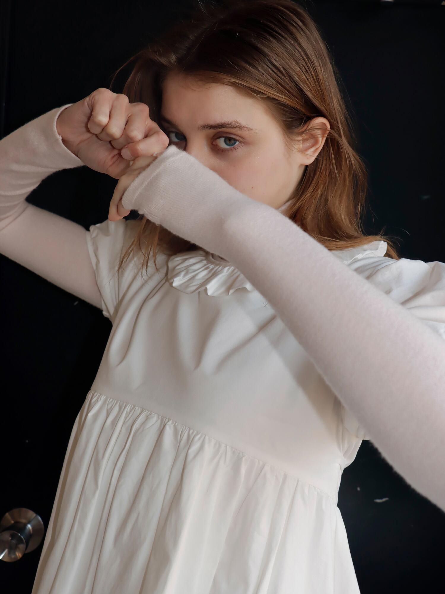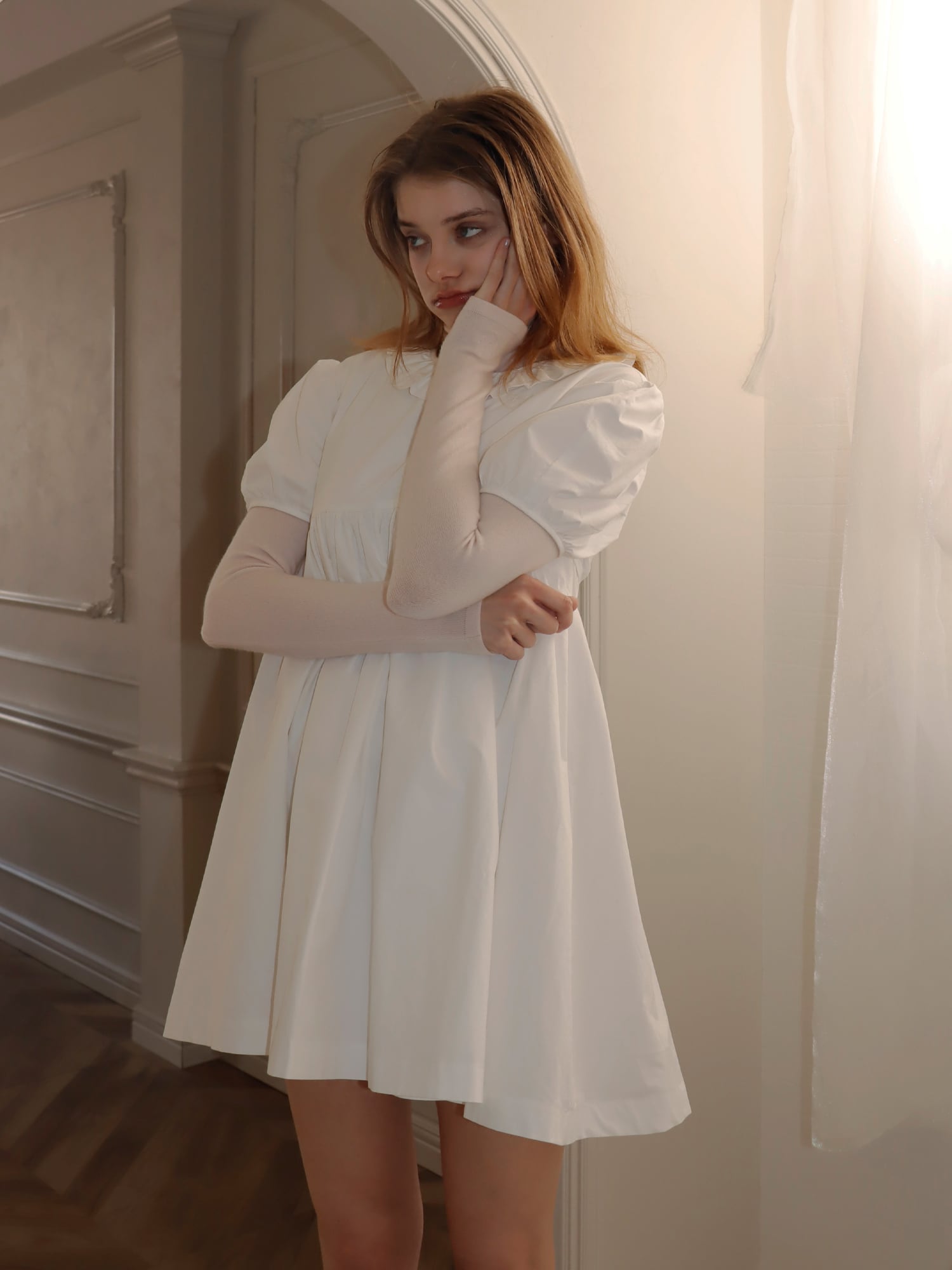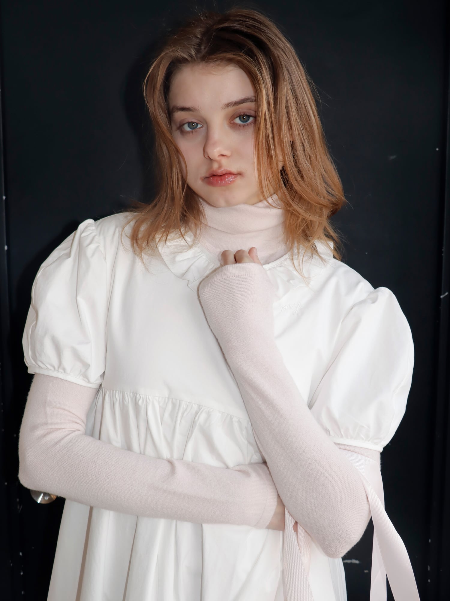 袖は、お花の蕾のようにコロンと丸みのあるシルエットに仕上げ、襟元は花びらを思わせるラインに仕上げました。胸下に切り替えを入れることで、自然とスタイルアップが叶います。