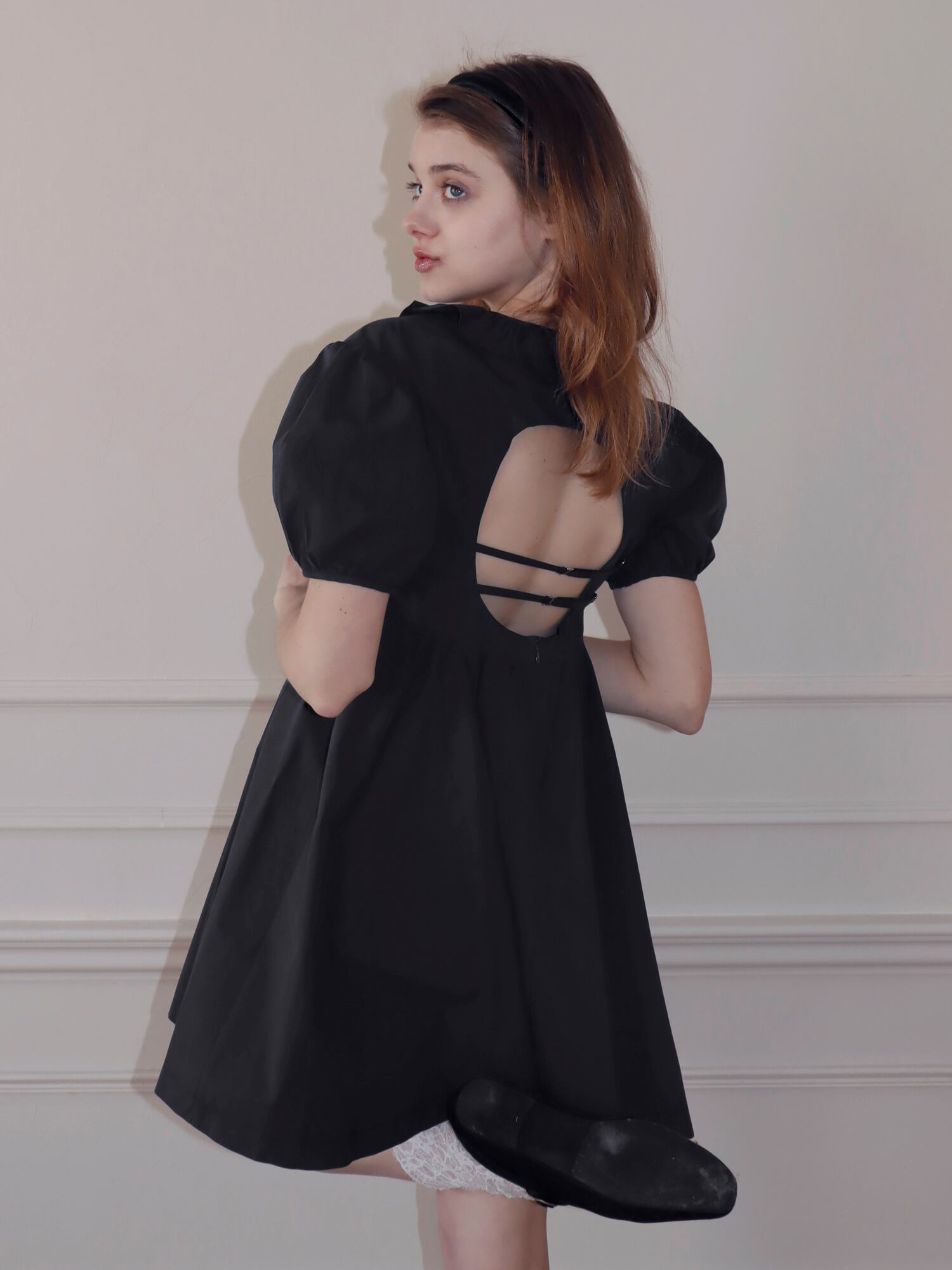バックスタイルは背中が大きく開いたデザインで、フロントとのギャップが印象的な仕上がりに。