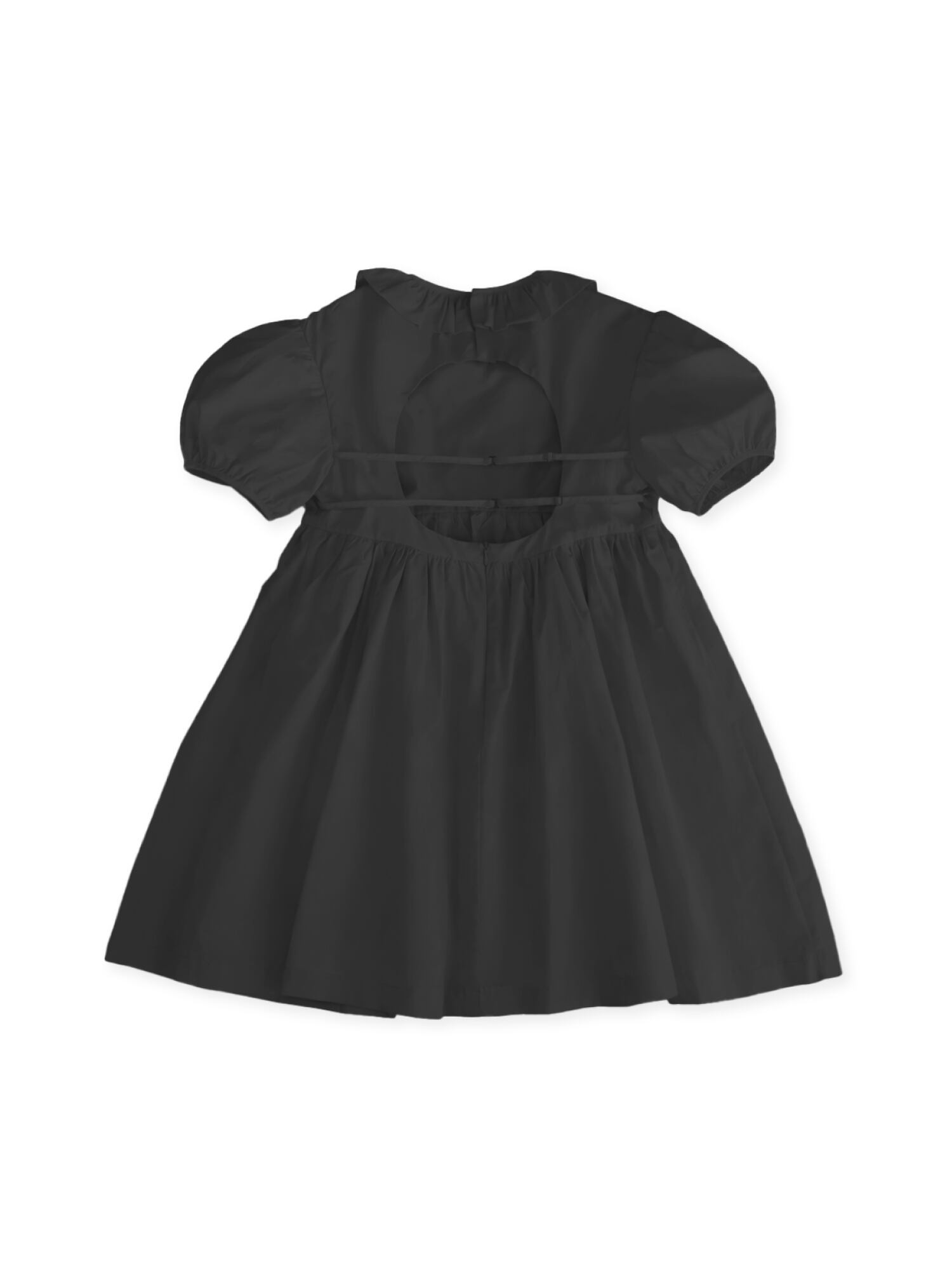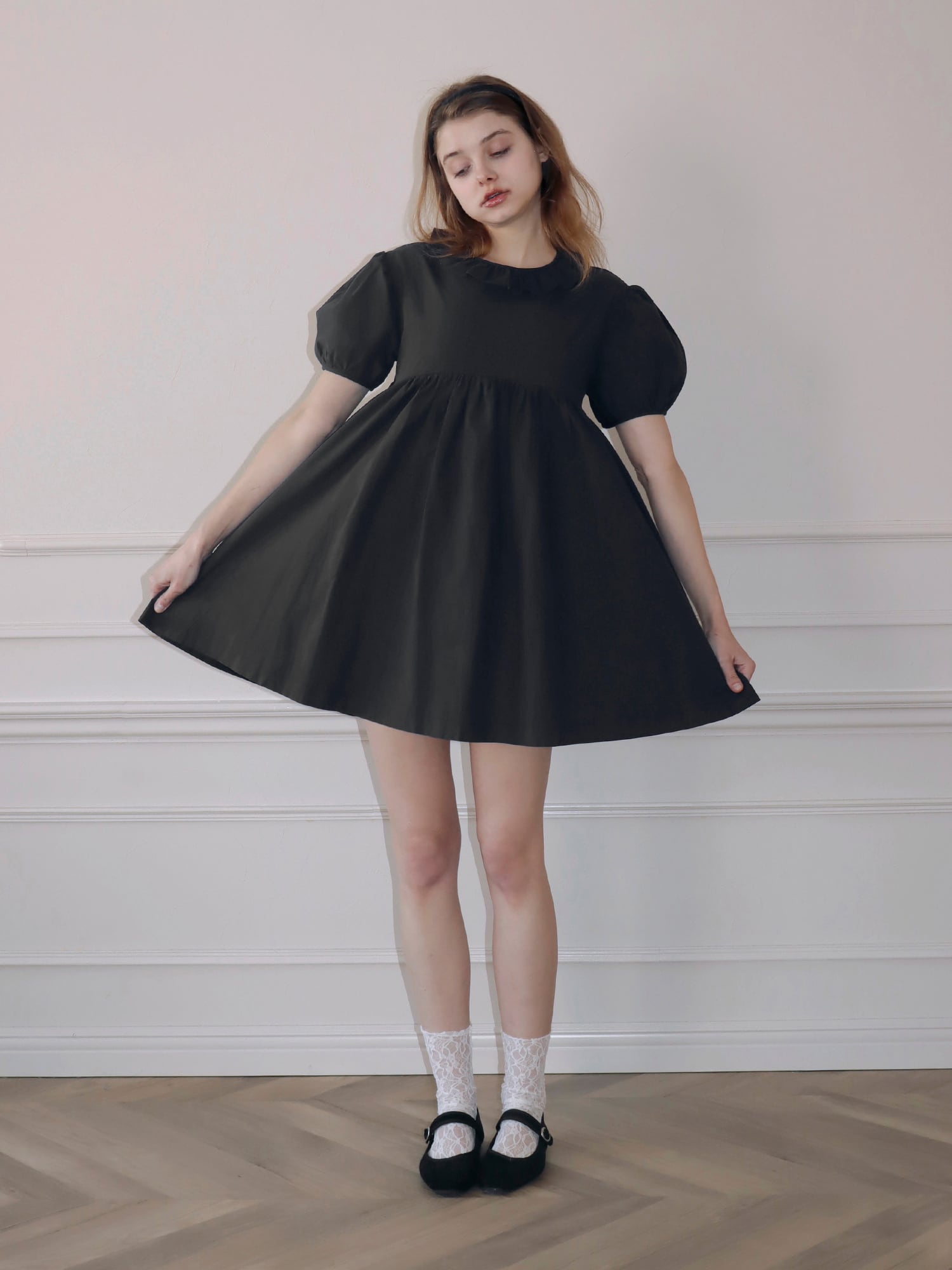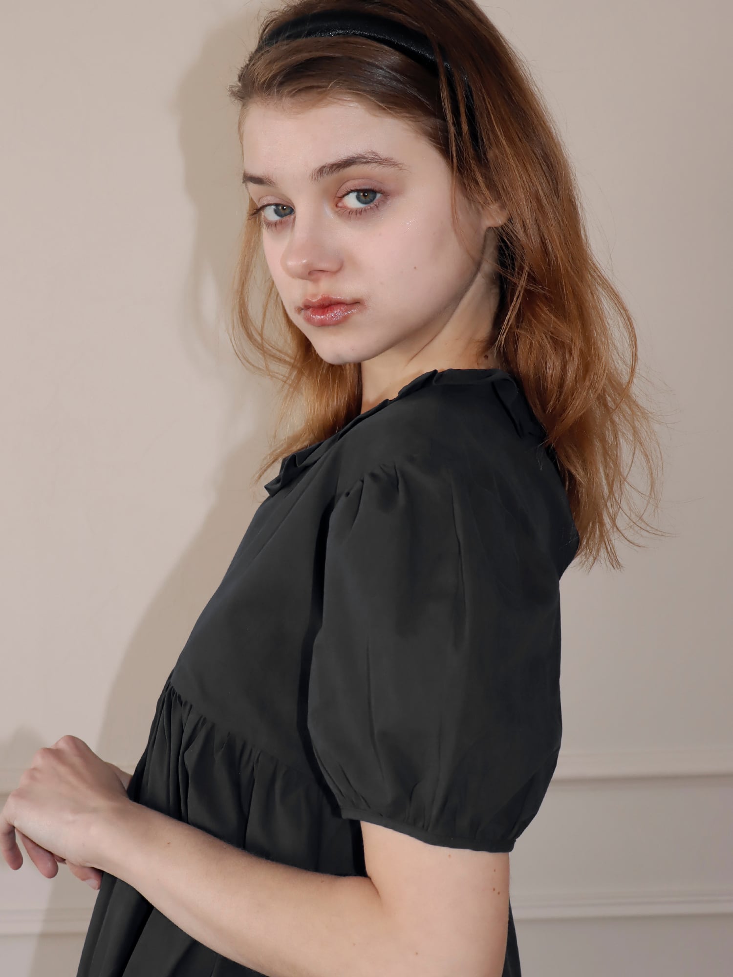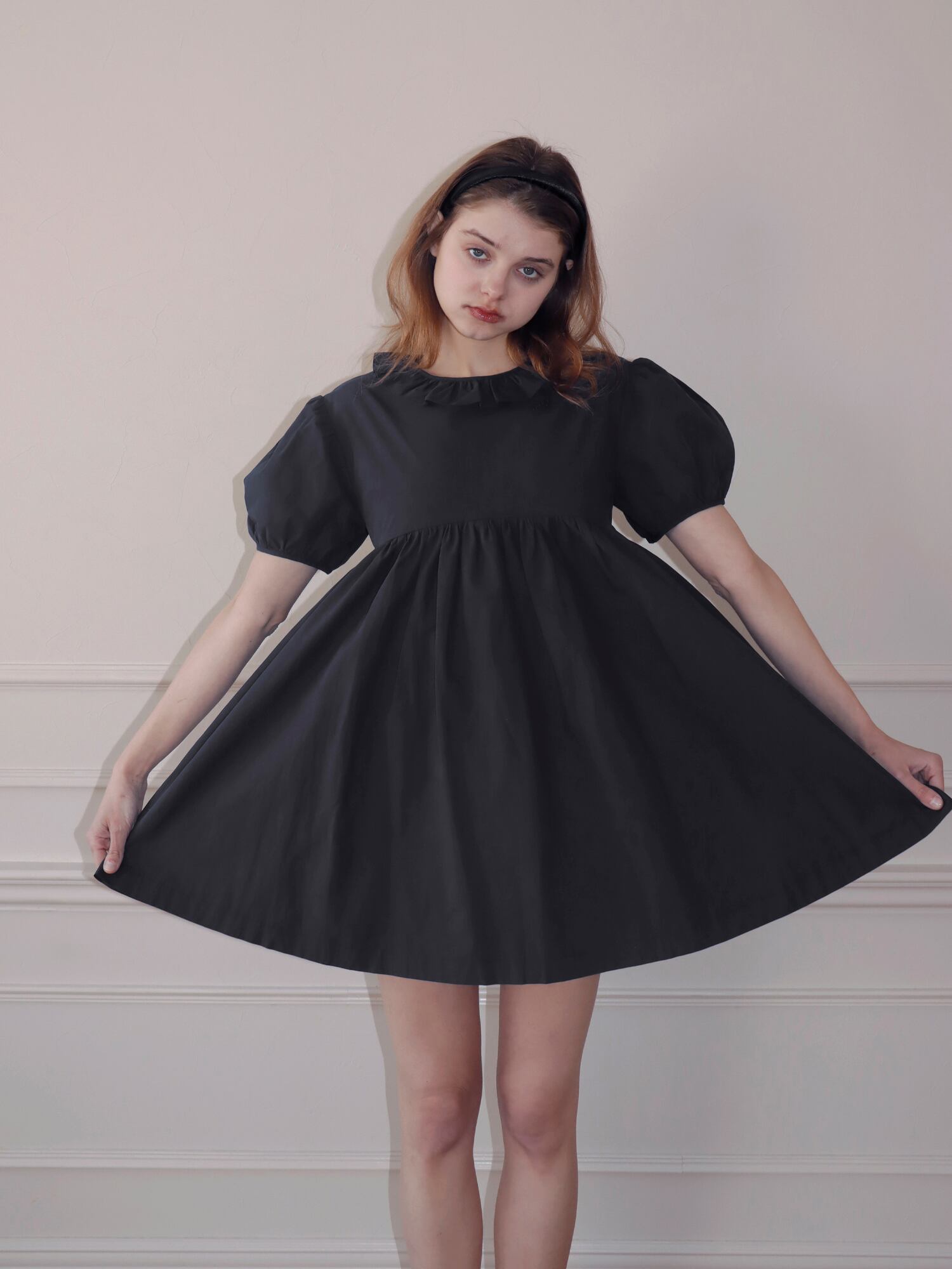 袖は、お花の蕾のようにコロンと丸みのあるシルエットに仕上げ、襟元は花びらを思わせるラインに仕上げました。胸下に切り替えを入れることで、自然とスタイルアップが叶います。