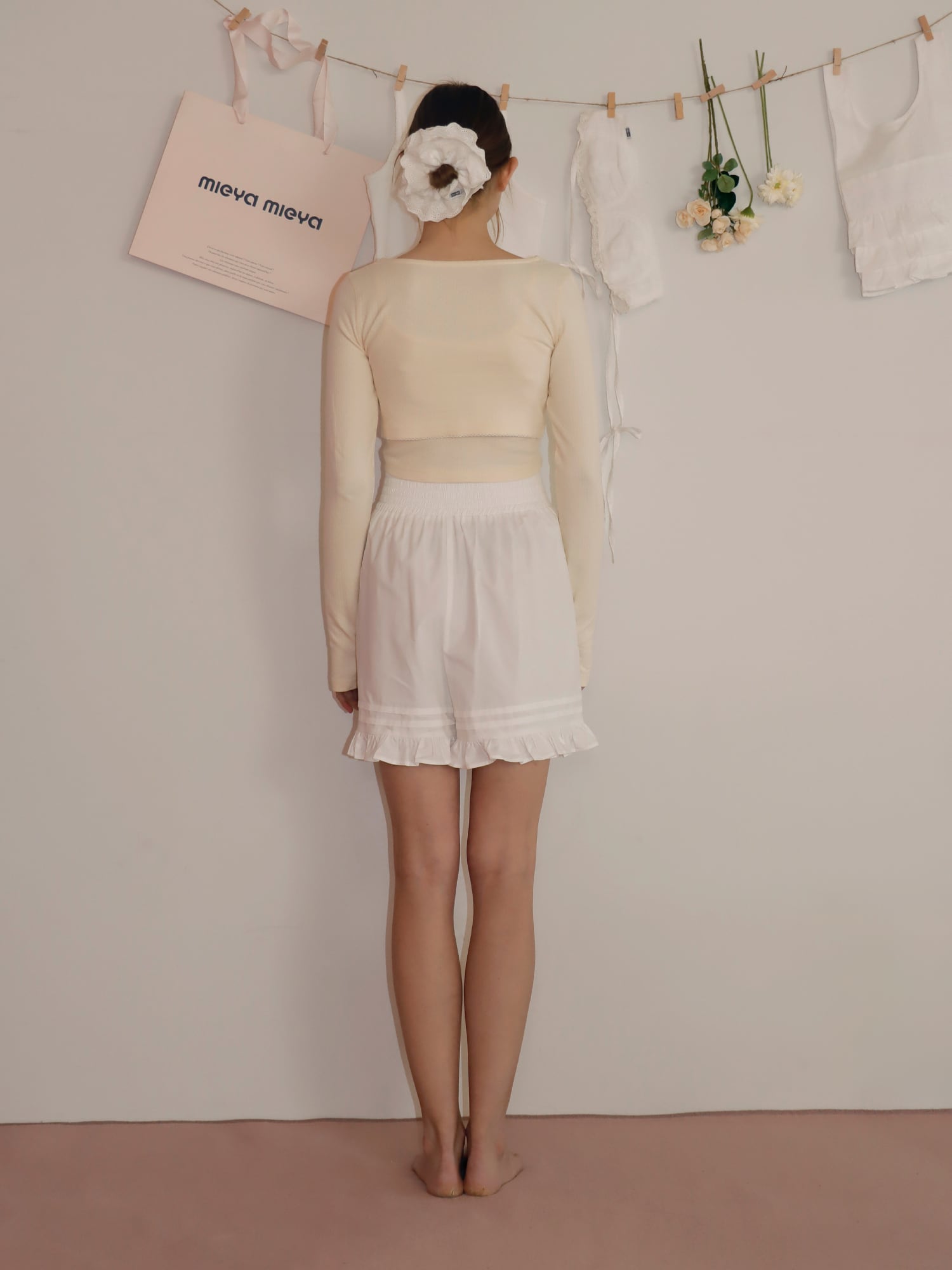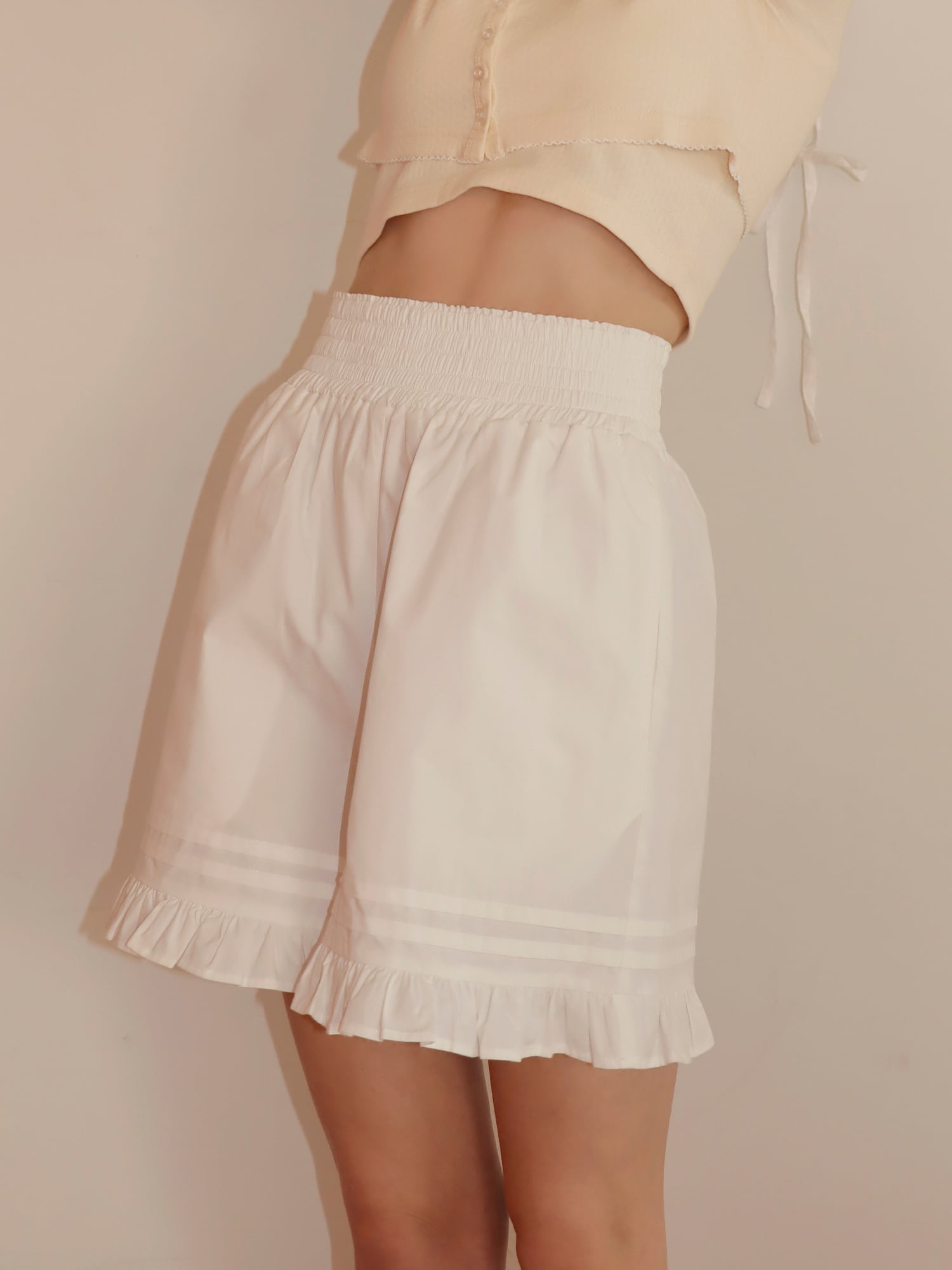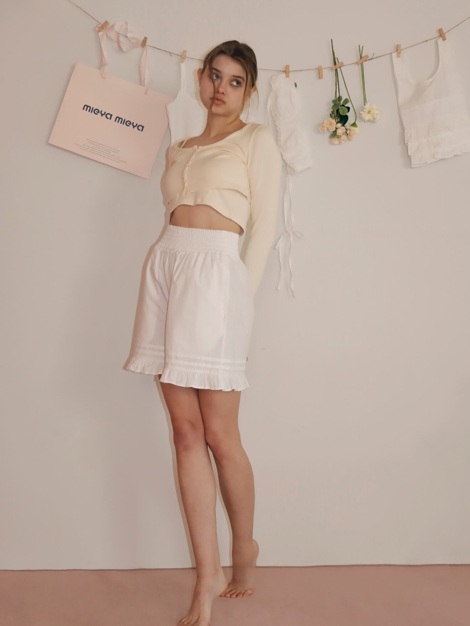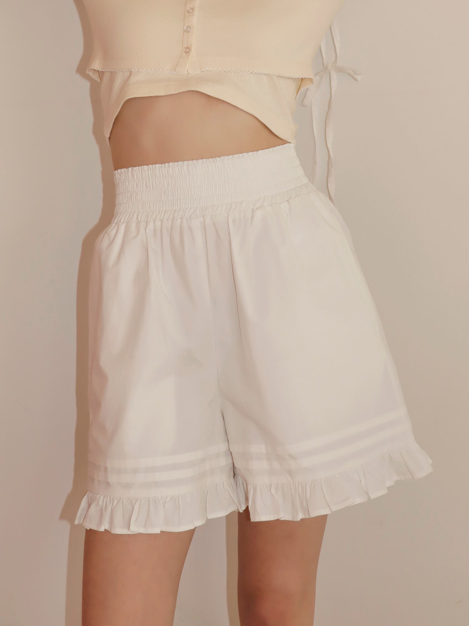 裾にフリルをあしらい、程よくガーリーなアクセントを加えたハーフパンツ。