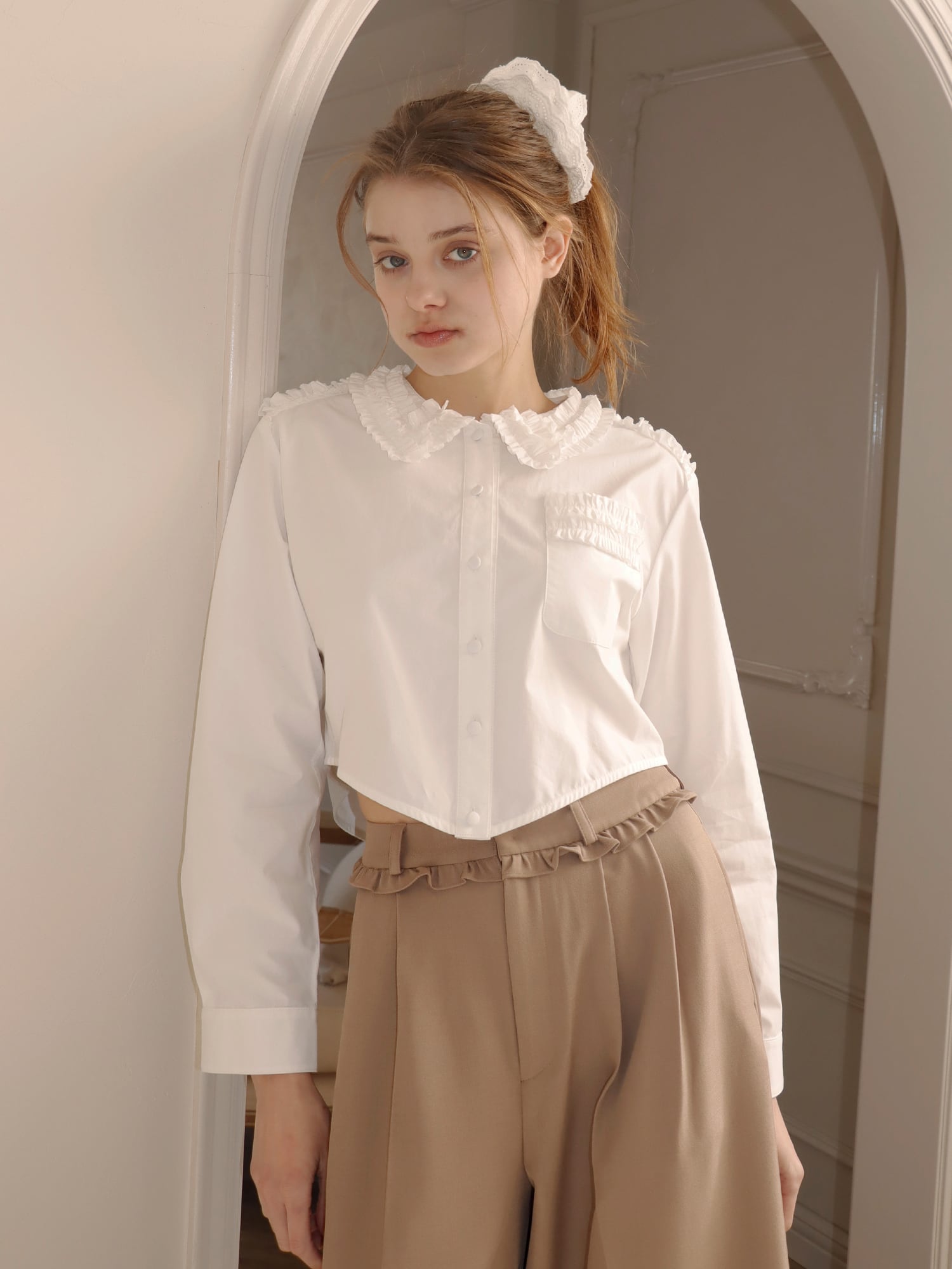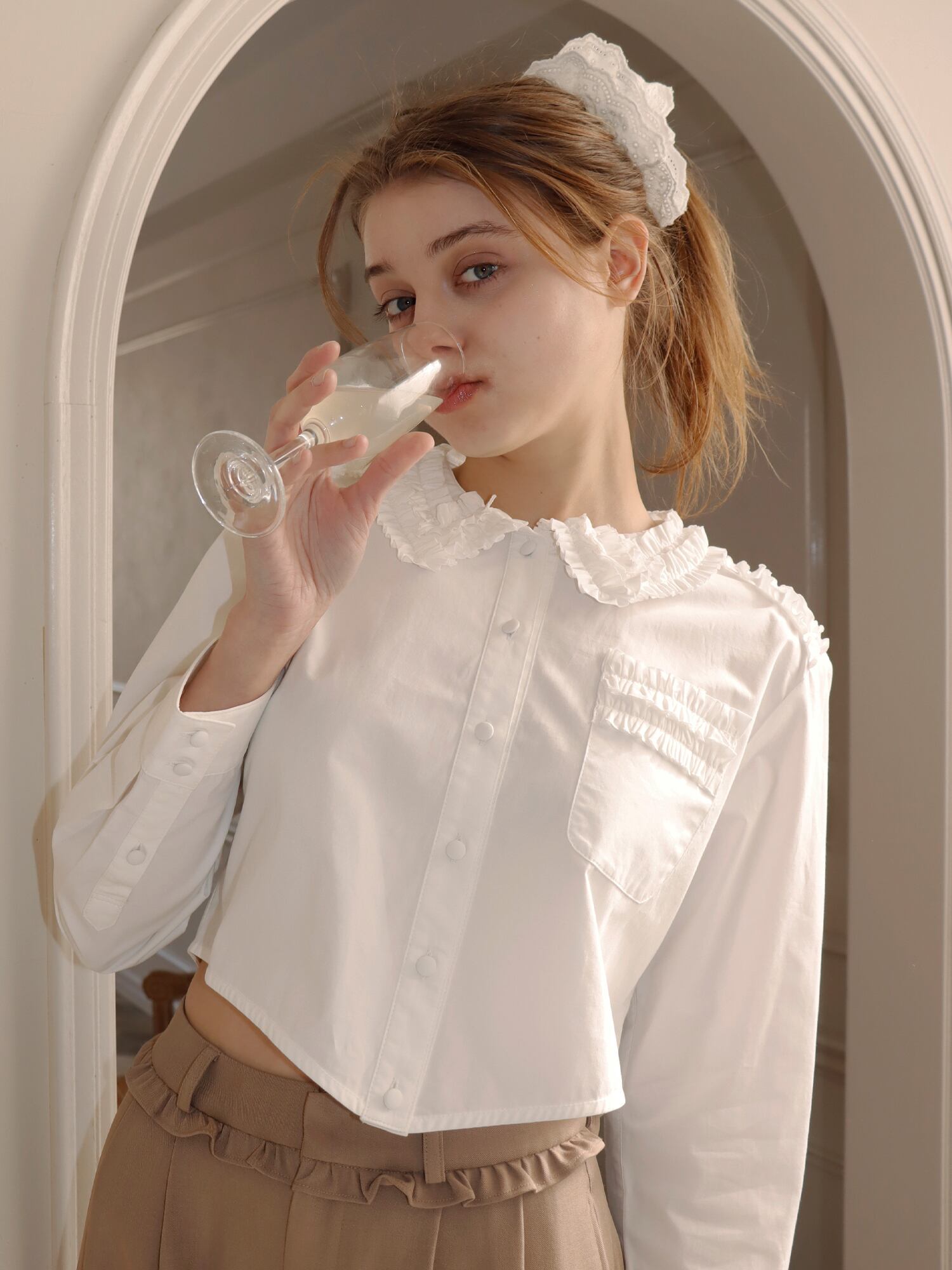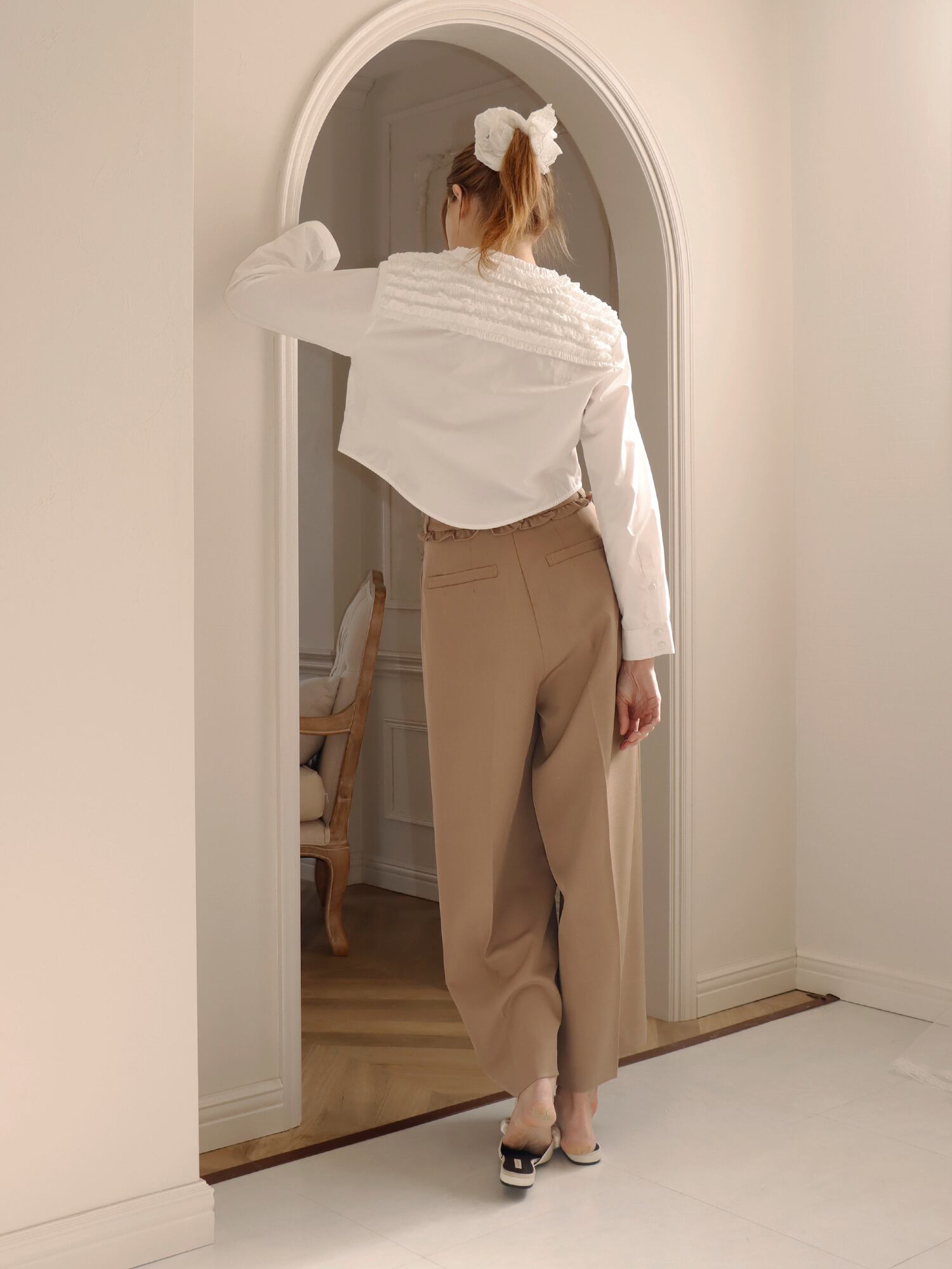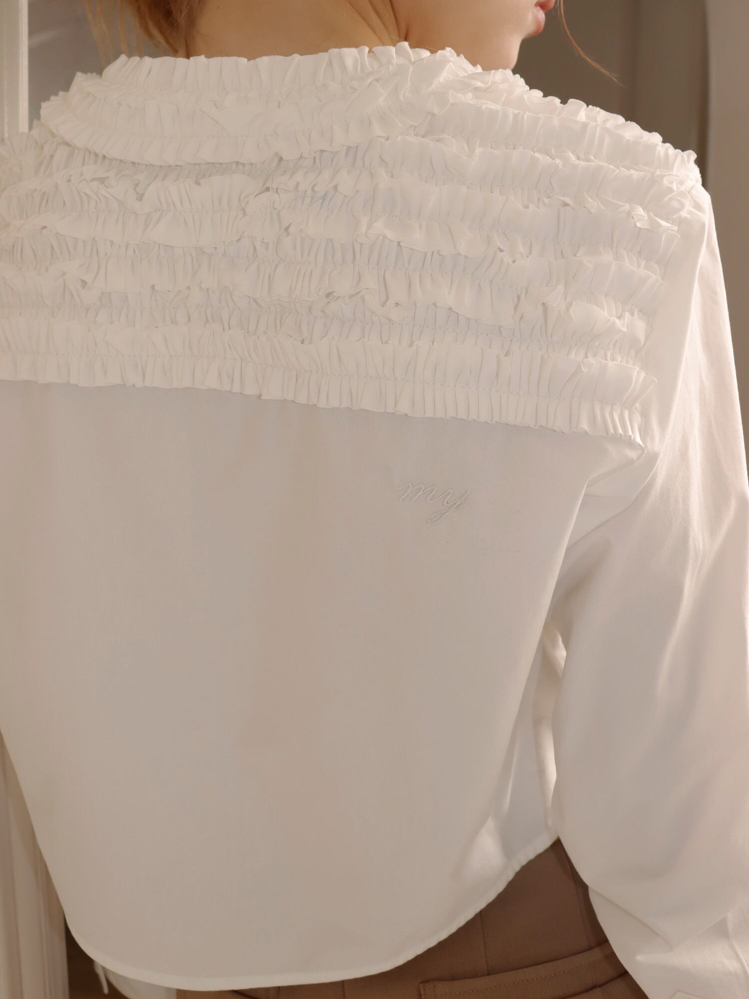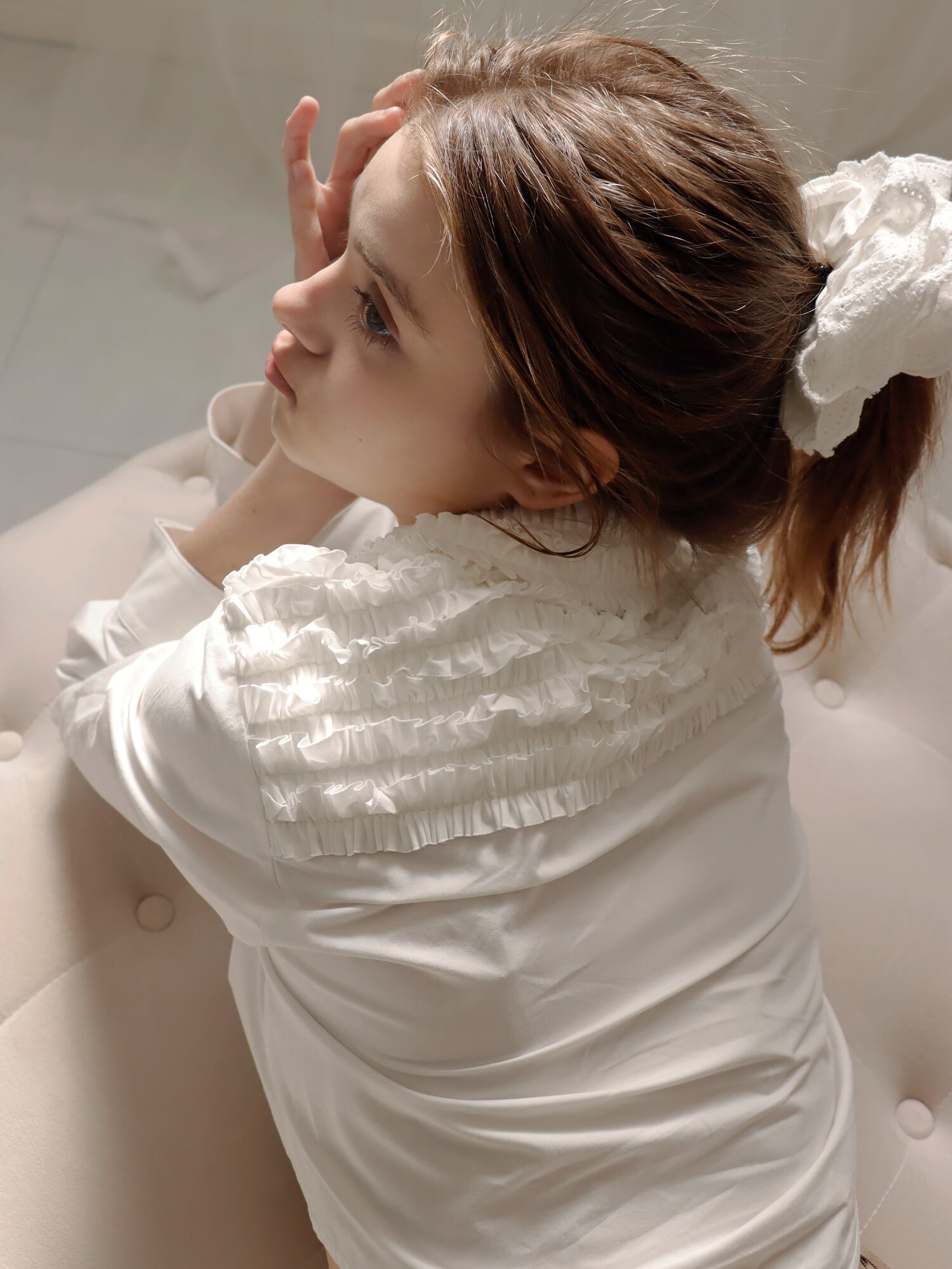 襟元はもちろん、バックスタイルにもフリルを施し、前から見ても後ろから見ても抜かりなく可愛いデザインに仕上げました。フリルたっぷりの甘さがありながら、丈は短めに設定することで、どこかハンサムな印象もプラスしました。