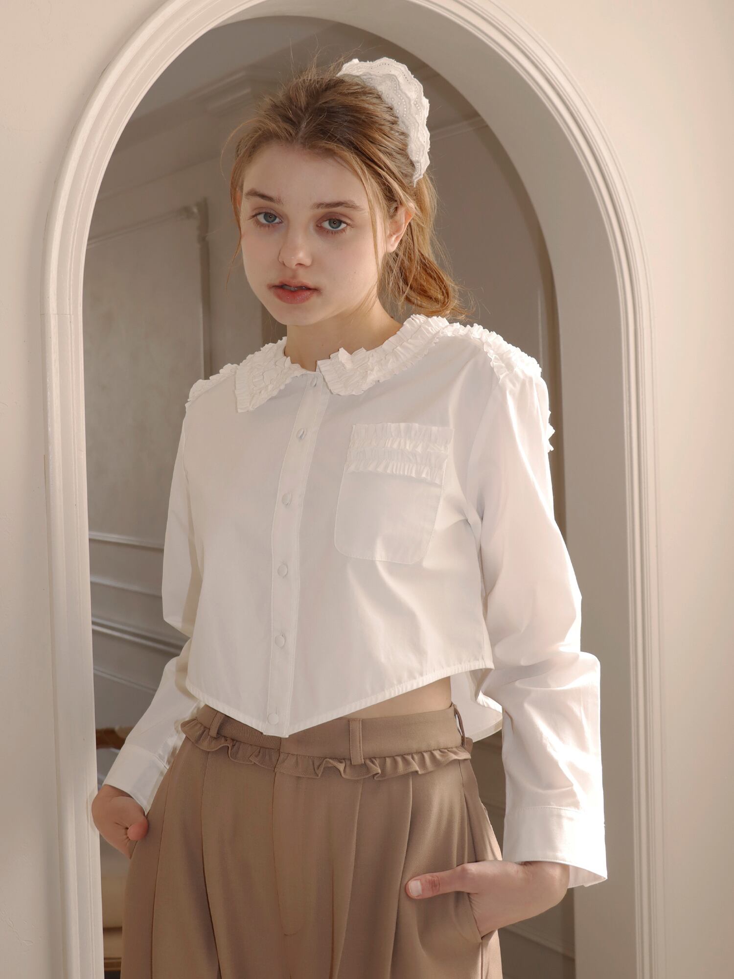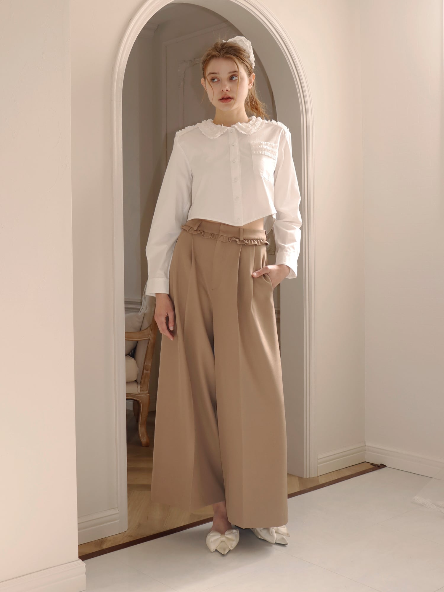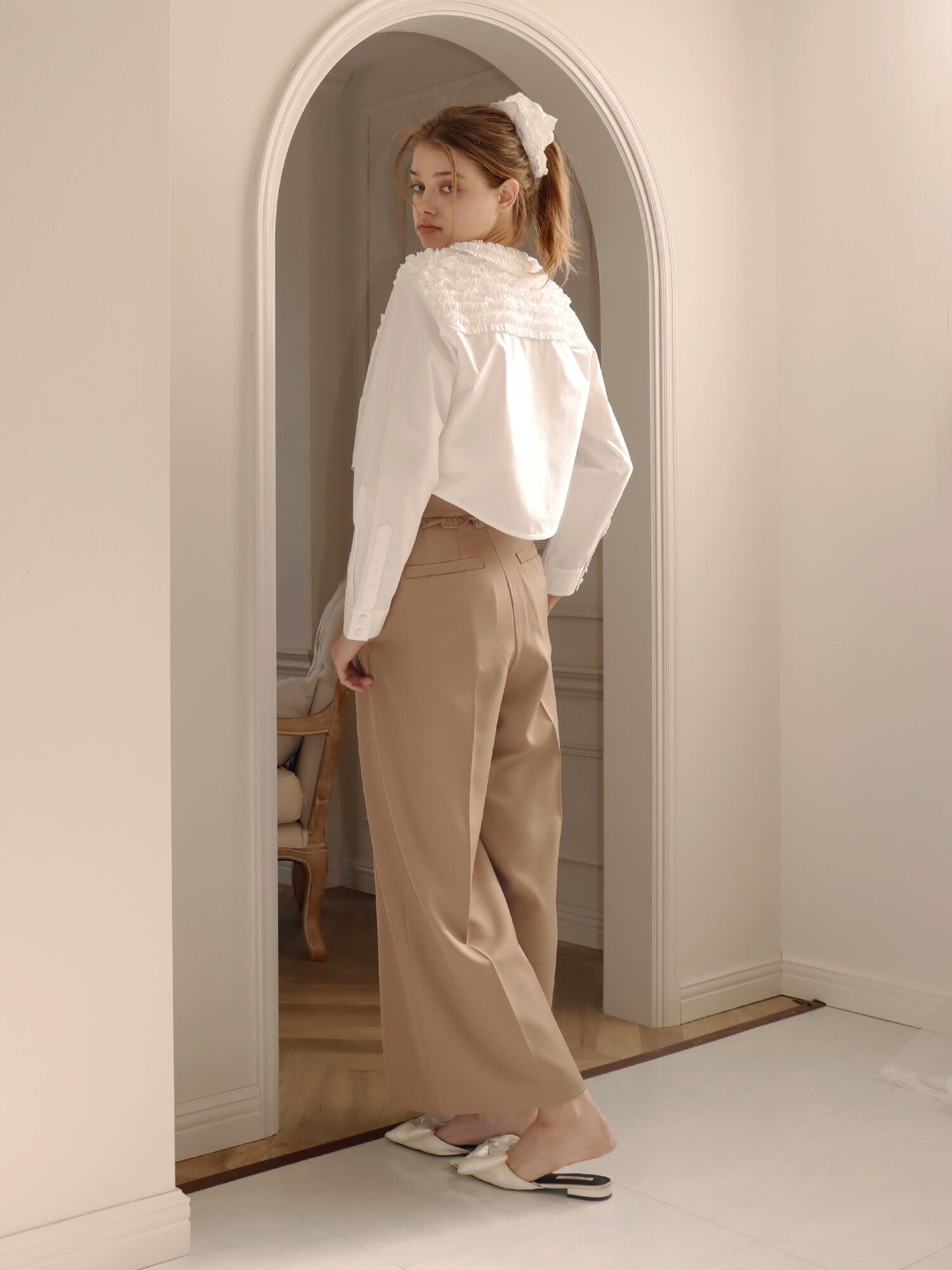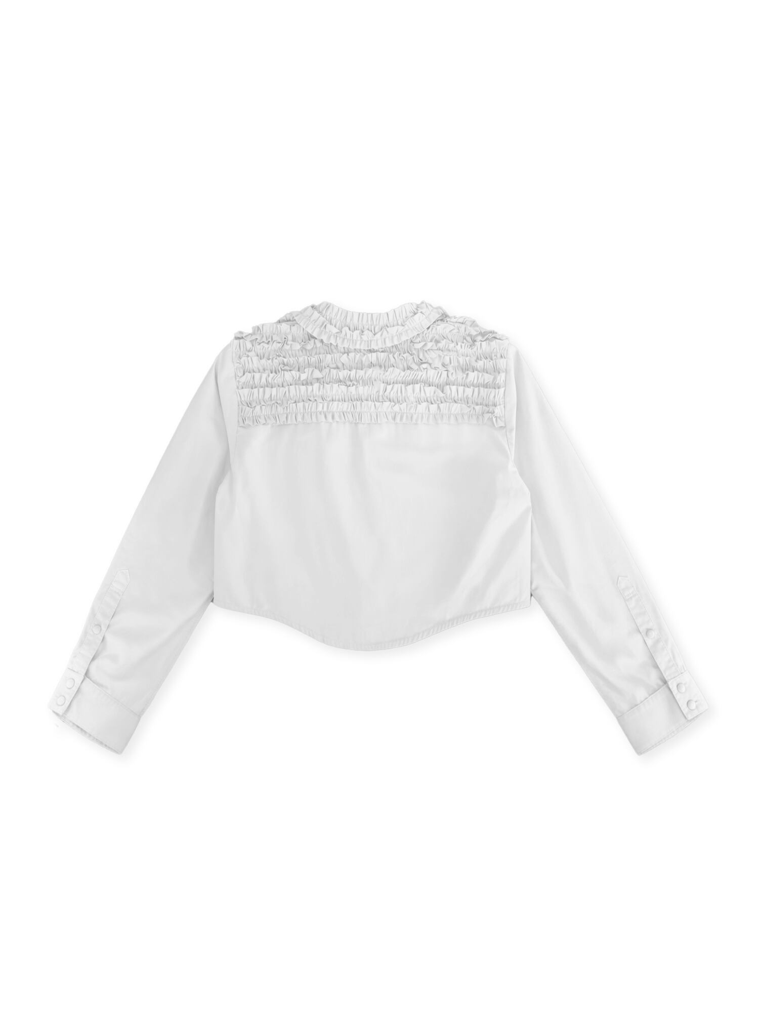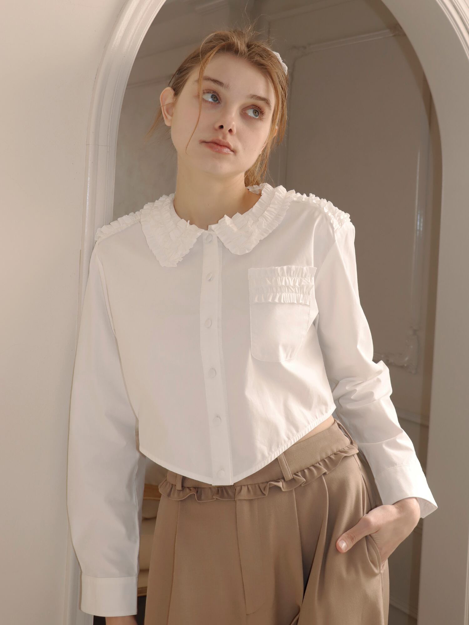 襟元はもちろん、バックスタイルにもフリルを施し、前から見ても後ろから見ても抜かりなく可愛いデザインに仕上げました。フリルたっぷりの甘さがありながら、丈は短めに設定することで、どこかハンサムな印象もプラスしました。