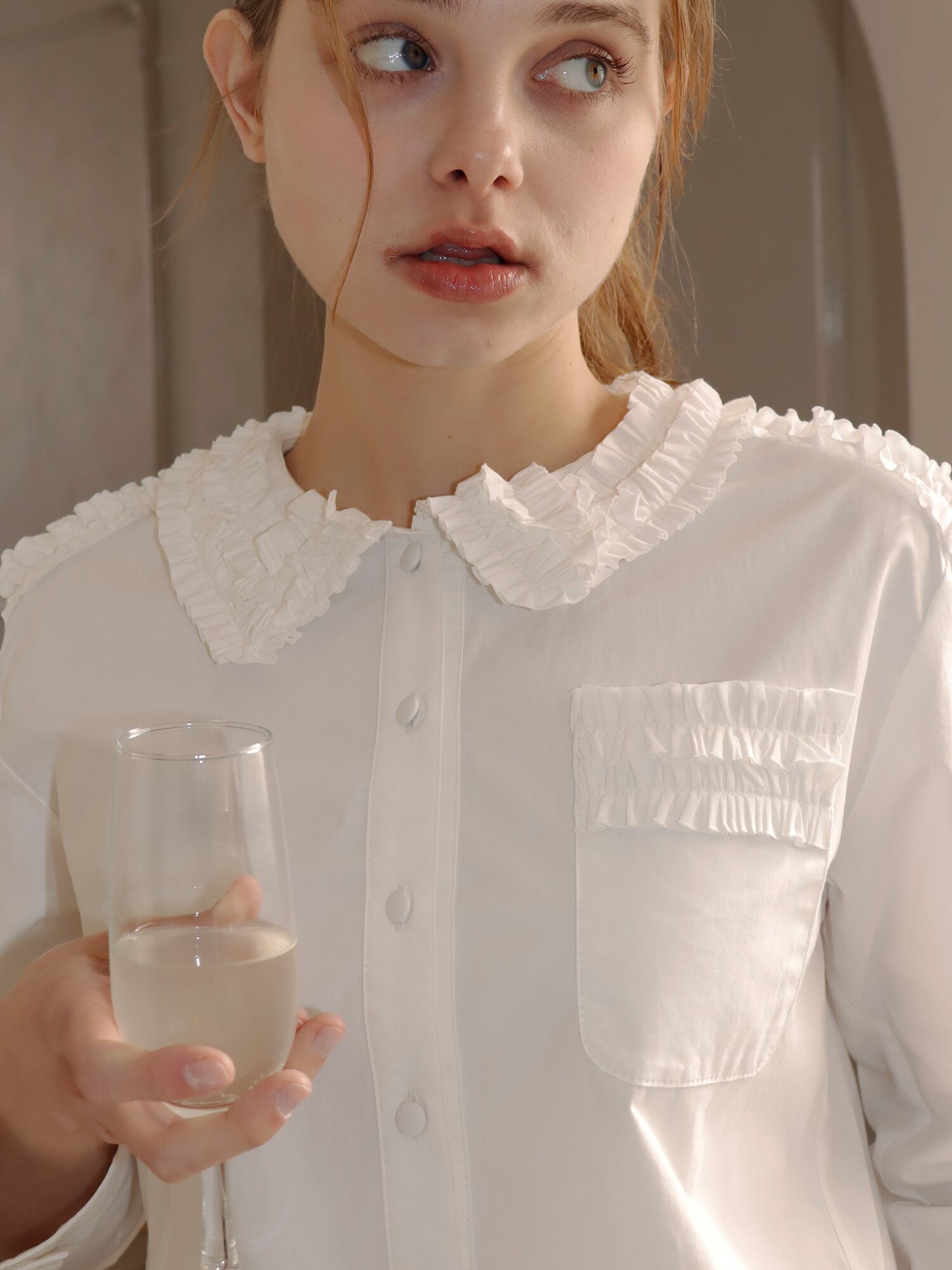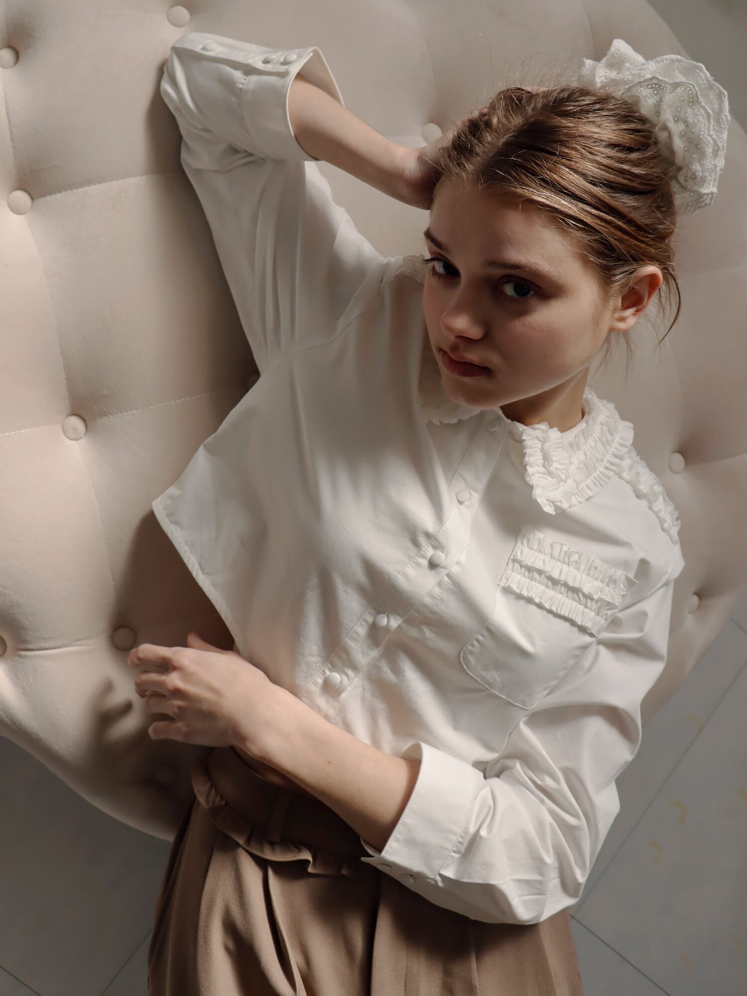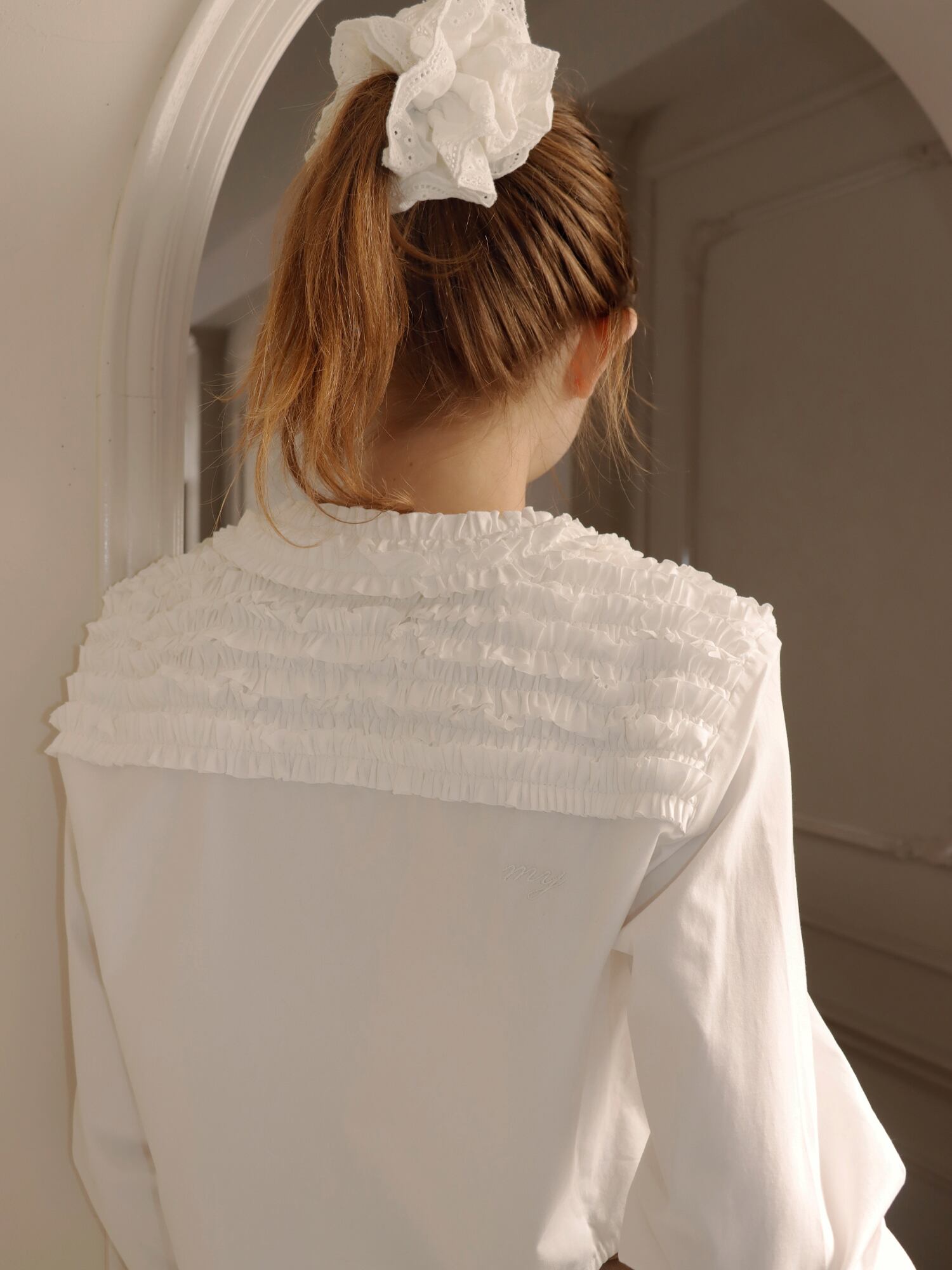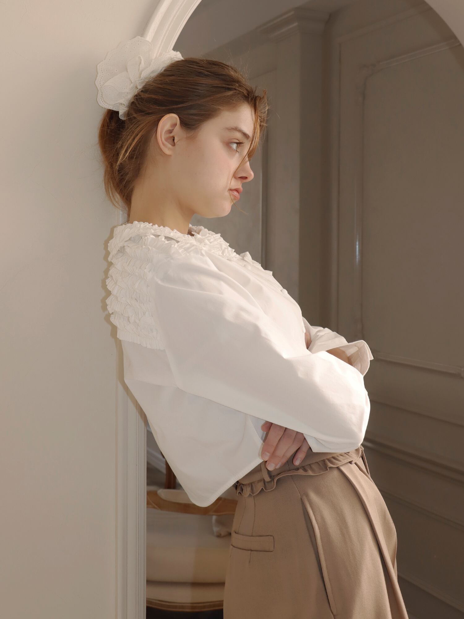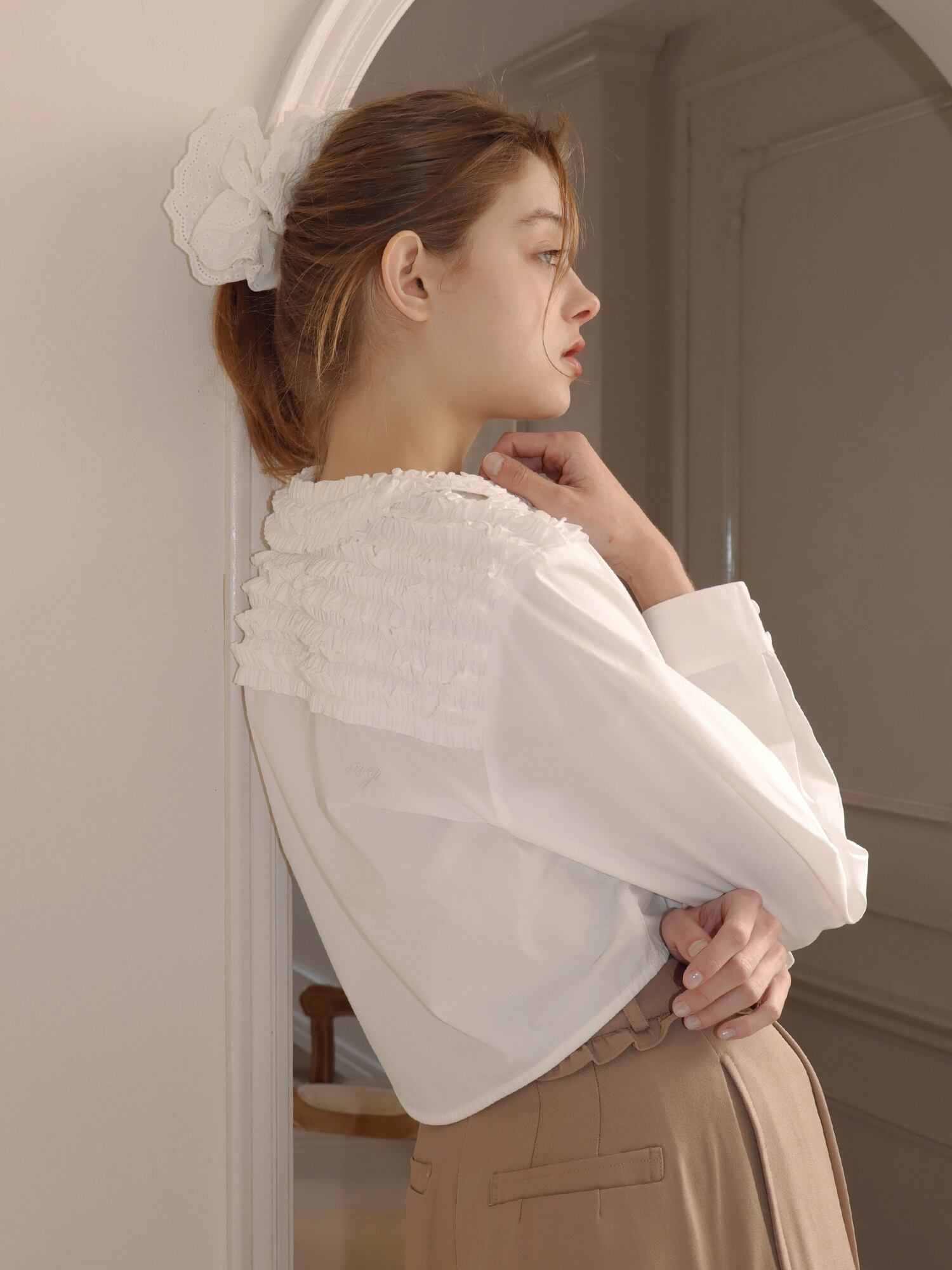 お花の花びらをイメージした、立体感あるフリルをふんだんにあしらったブラウス。