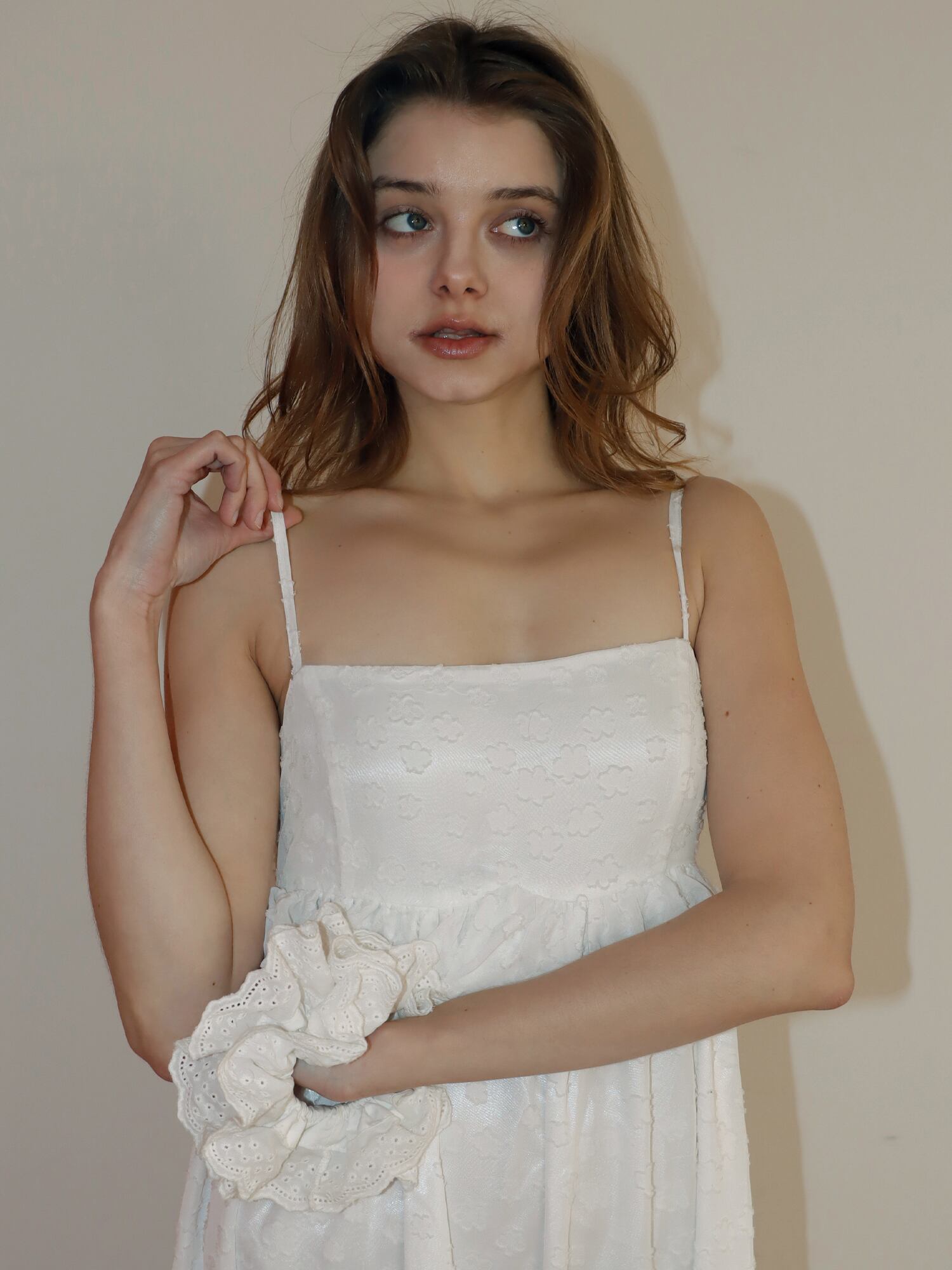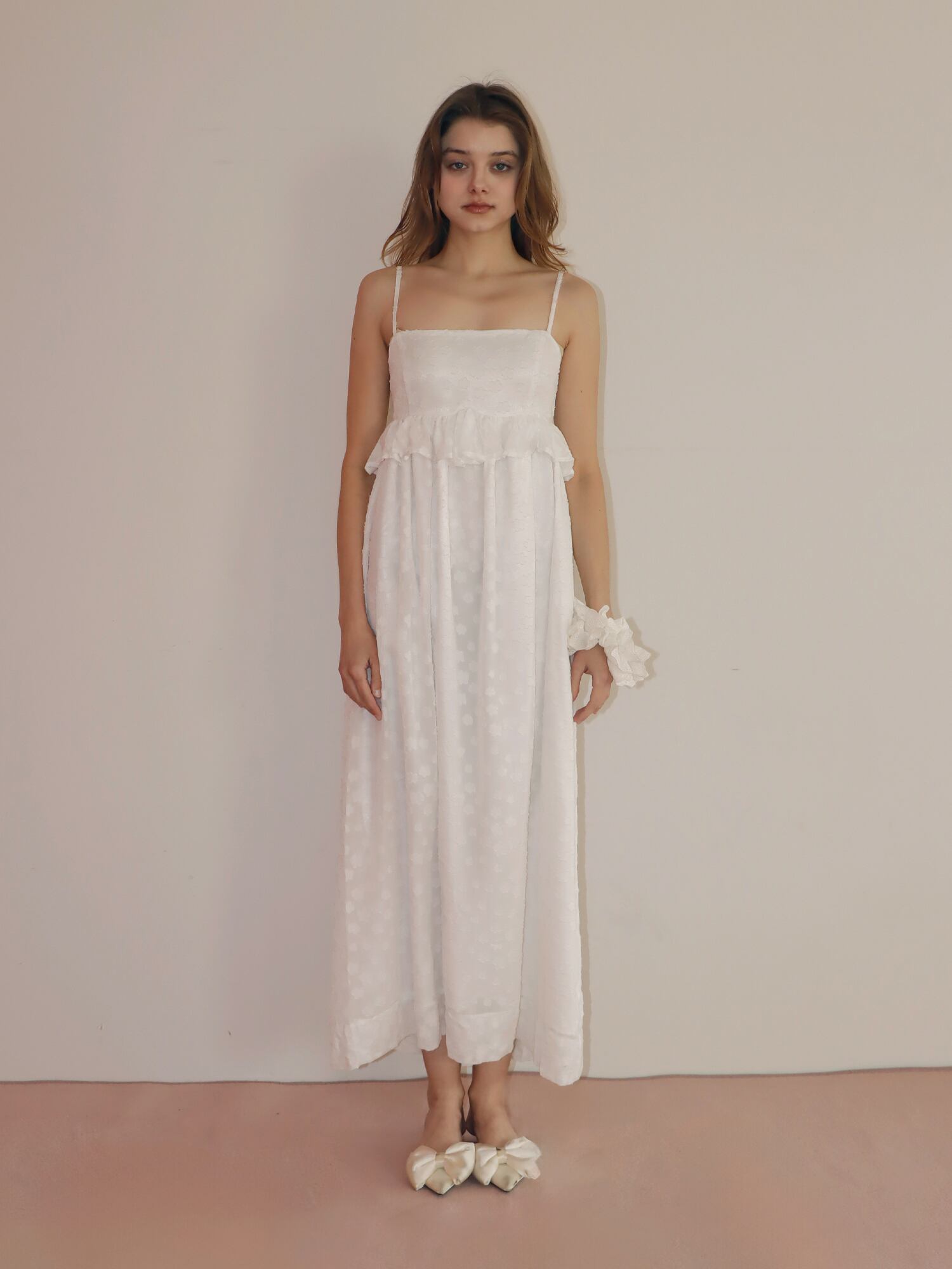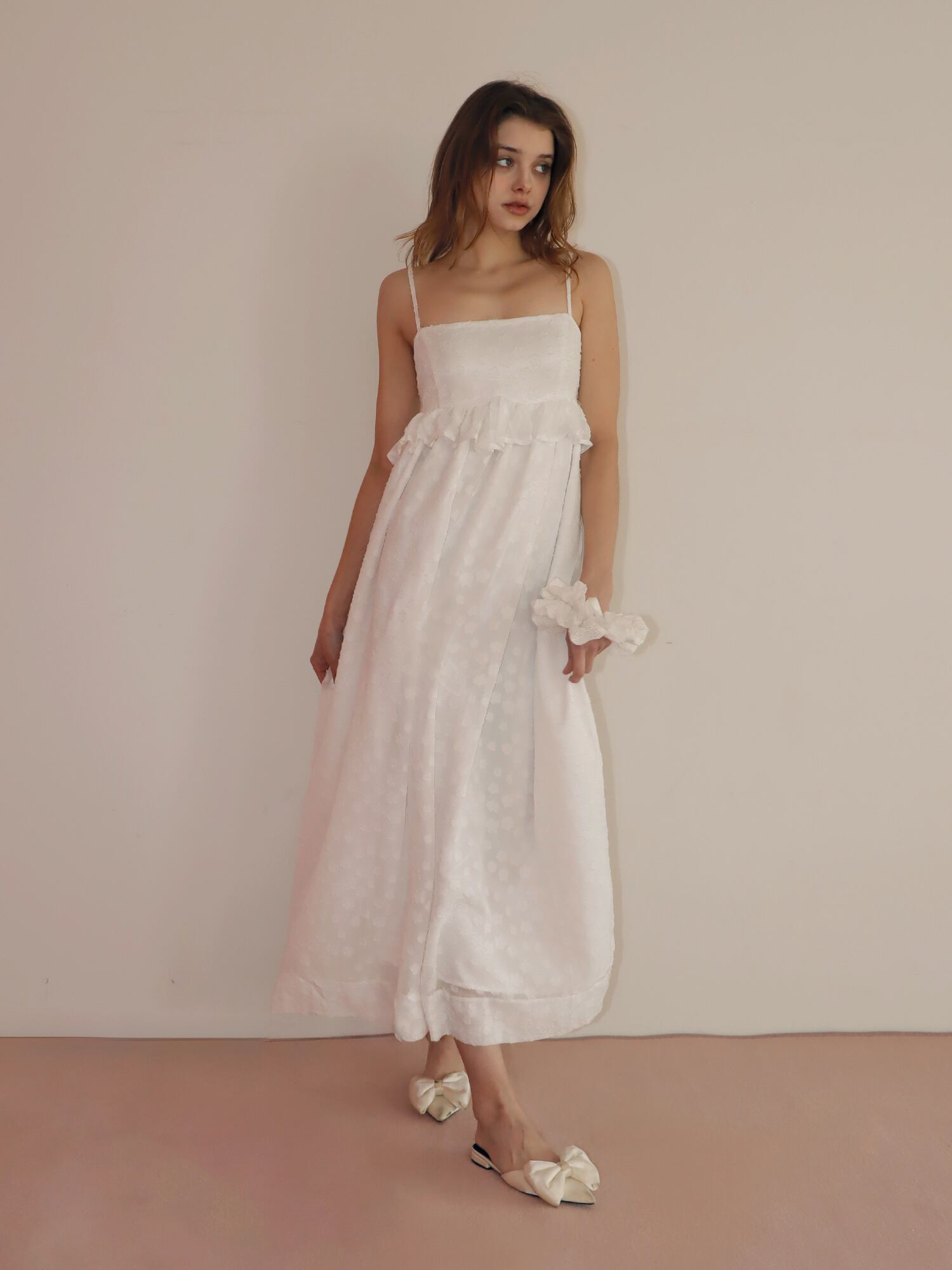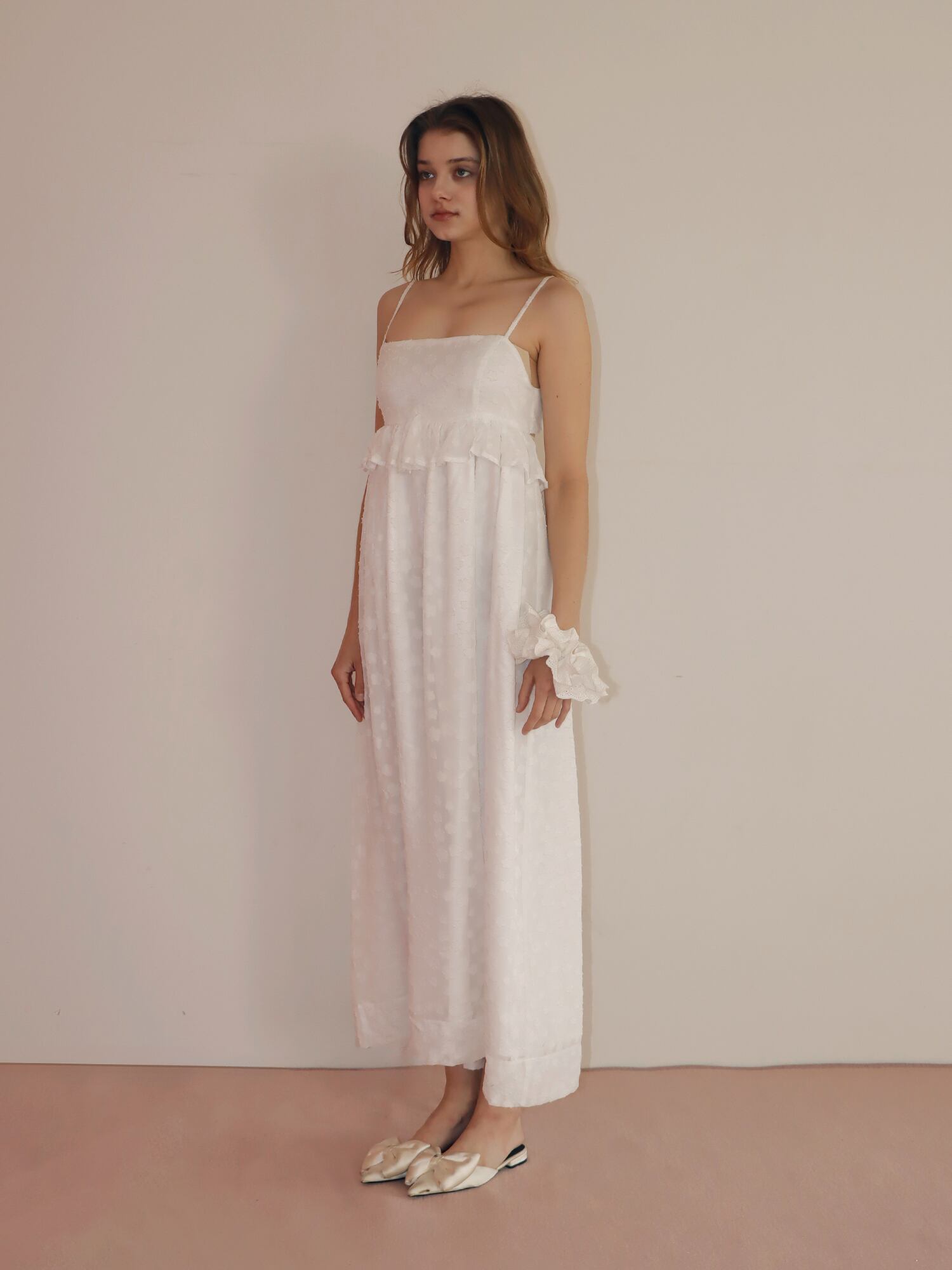 胸下で切り替えたシルエットは自然にスタイルアップを叶え、切り替え部分には存在感のあるフリルをあしらい、コーデの主役になる華やかさをプラス。