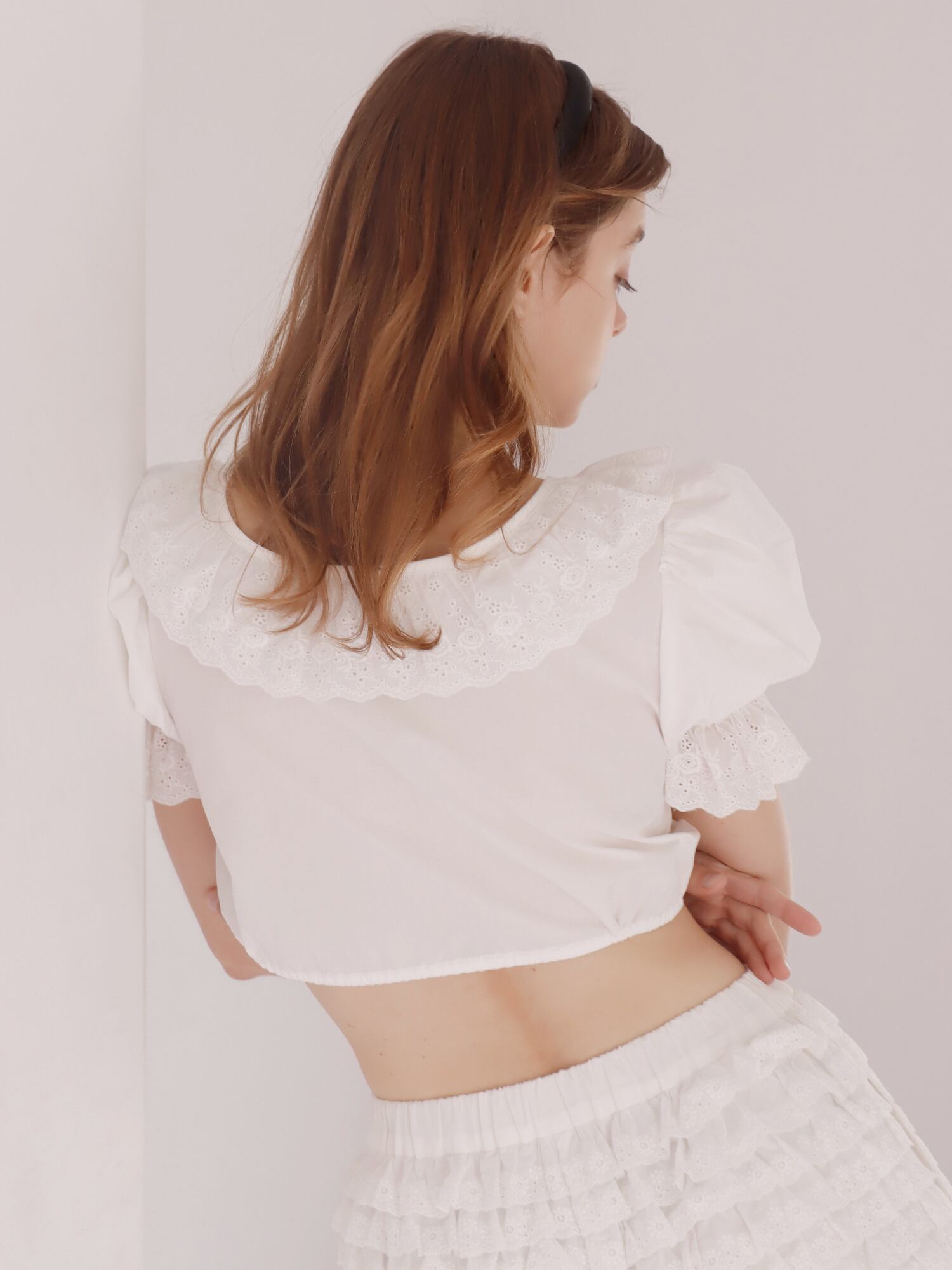 広めに開いた首元がデコルテをすっきりと見せ、アクセサリーも映えるデザインに。さらに首元には太めのレースをあしらい、華やかさをプラスしています。レースやボタンをすべて同色でまとめることで、甘くなりすぎずに着られるのもポイント。