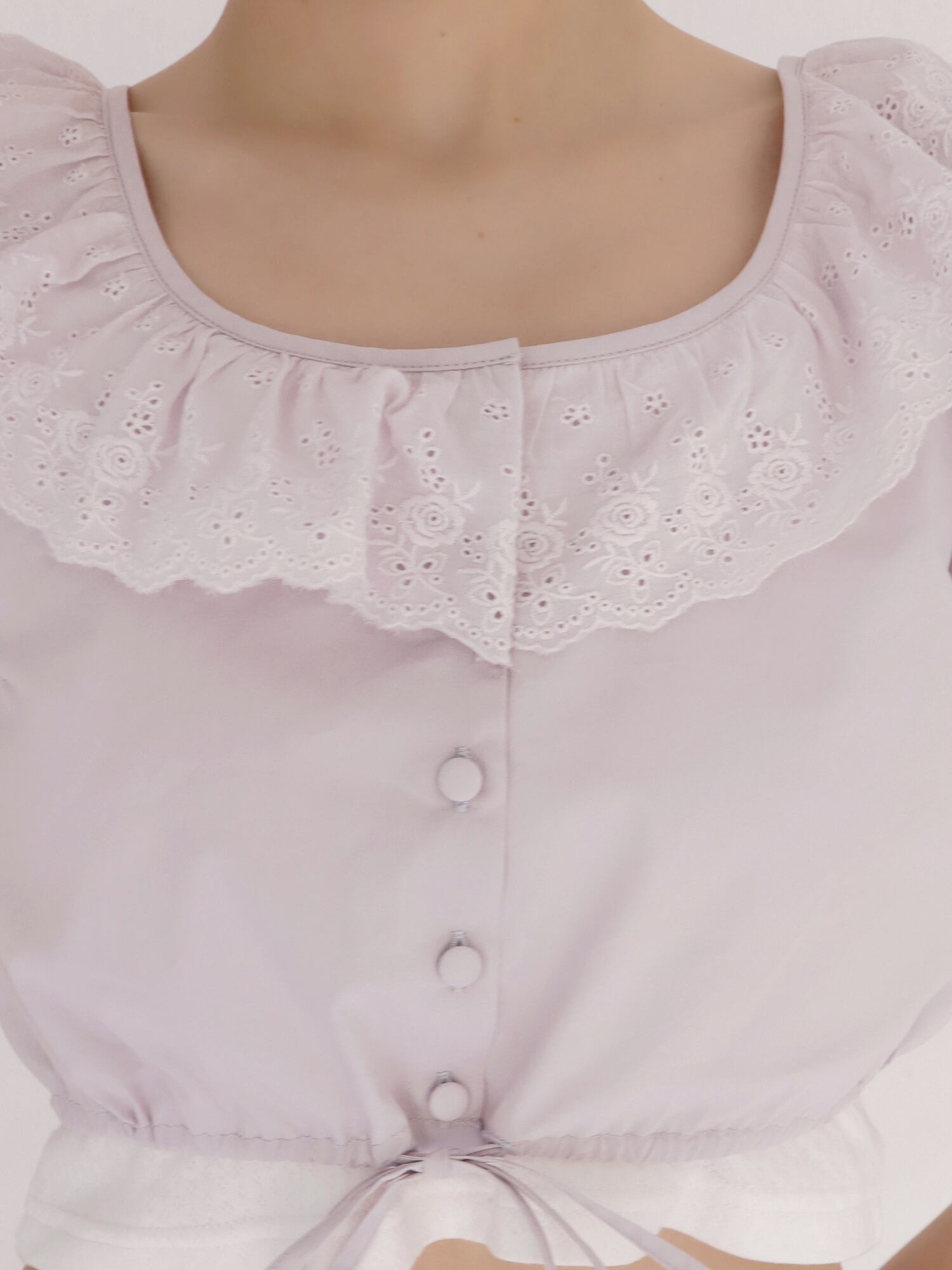 広めに開いた首元がデコルテをすっきりと見せ、アクセサリーも映えるデザインに。さらに首元には太めのレースをあしらい、華やかさをプラスしています。レースやボタンをすべて同色でまとめることで、甘くなりすぎずに着られるのもポイント。
