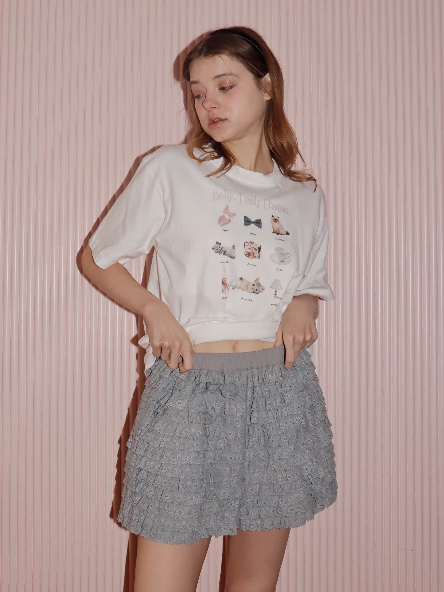 全面に施されたコットンレースが、どこから見ても抜かりなく、上品で高級感のある1枚に仕上げました。甘さのあるデザインながら、ショートパンツのシルエットにすることで可愛くなりすぎず、程よく抜け感のある印象に。