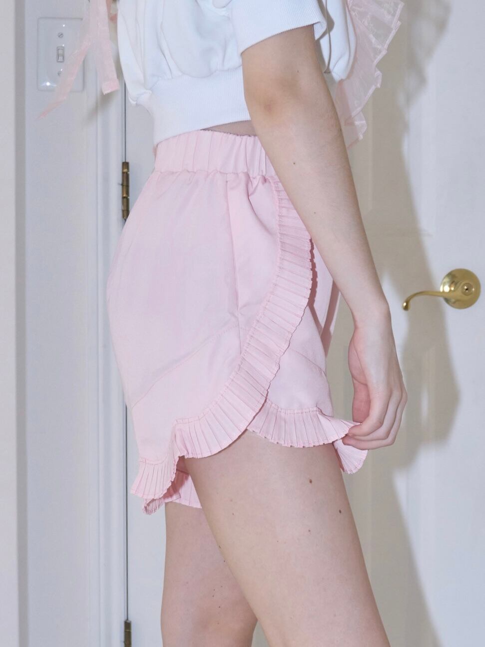 サイドと裾にプリーツタイプのフリルをたっぷり使用することで、甘く存在感のあるショートパンツができました。