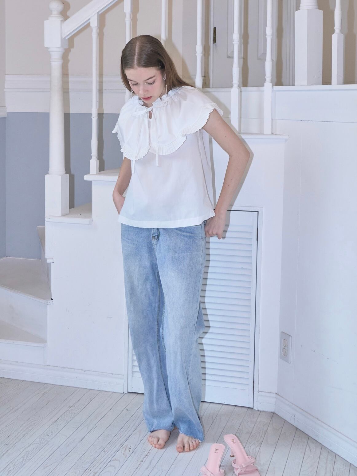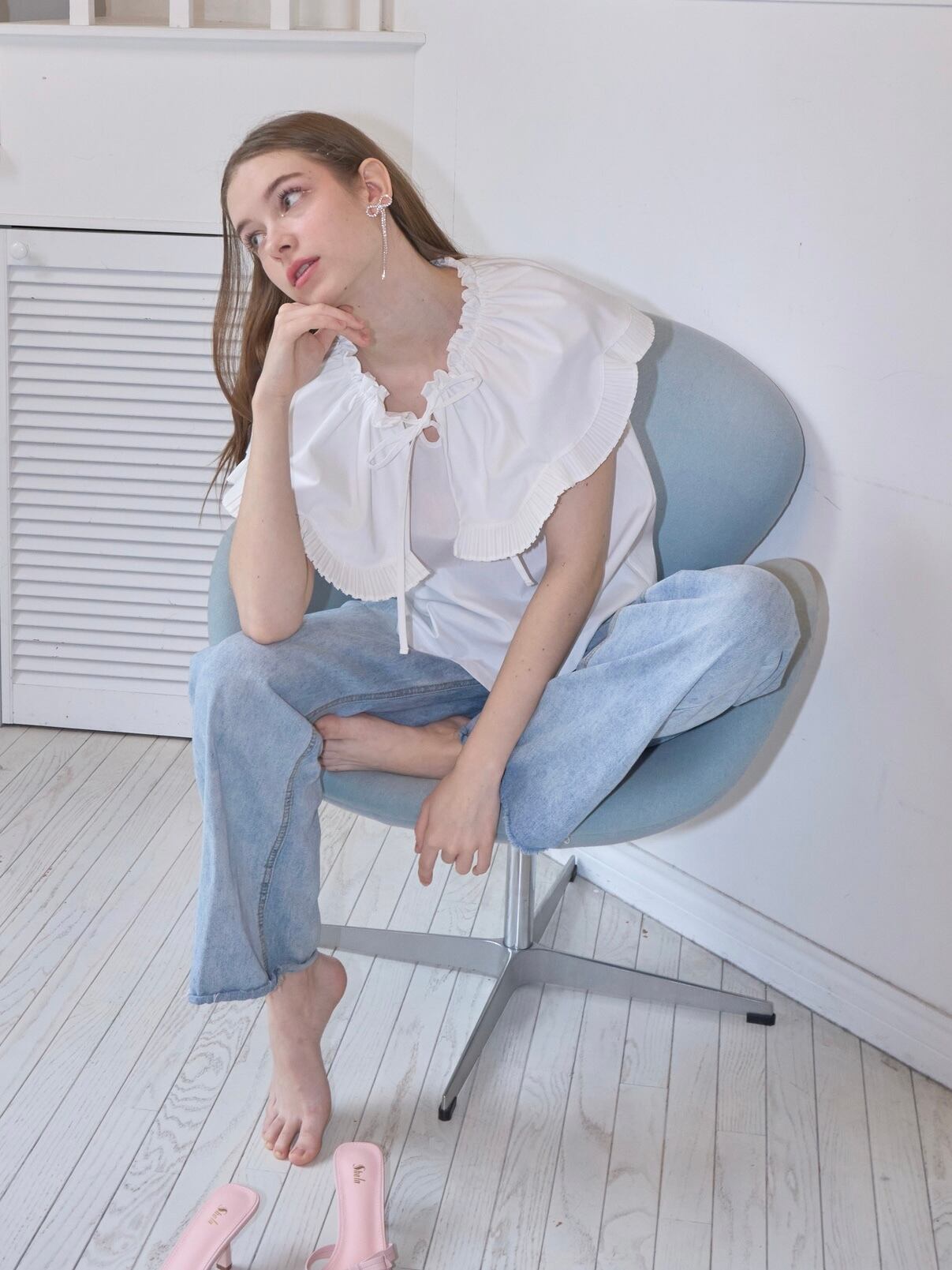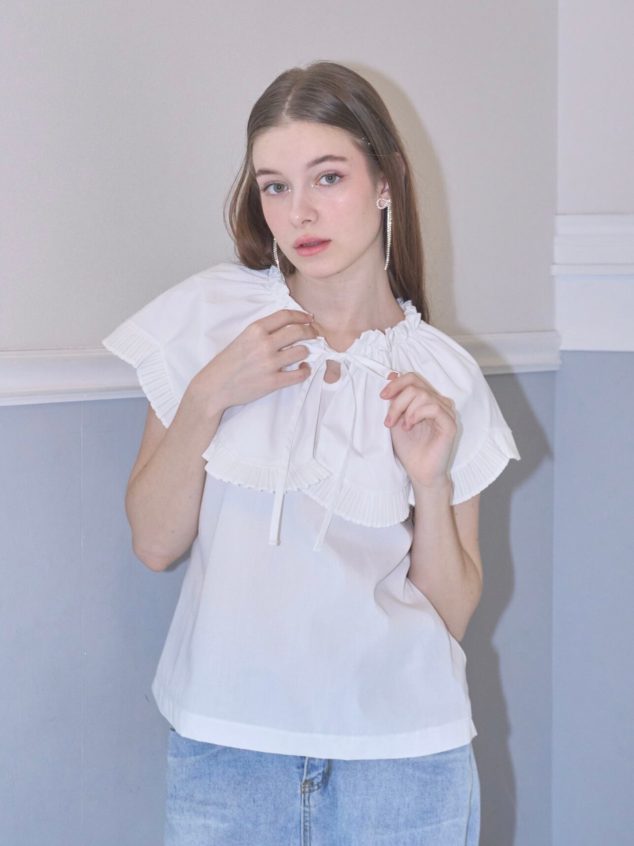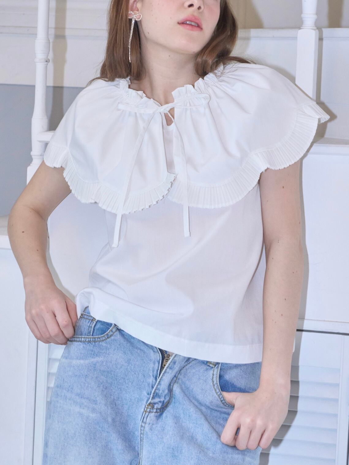 大きめの襟とフリルが目を引くノースリーブブラウス♡