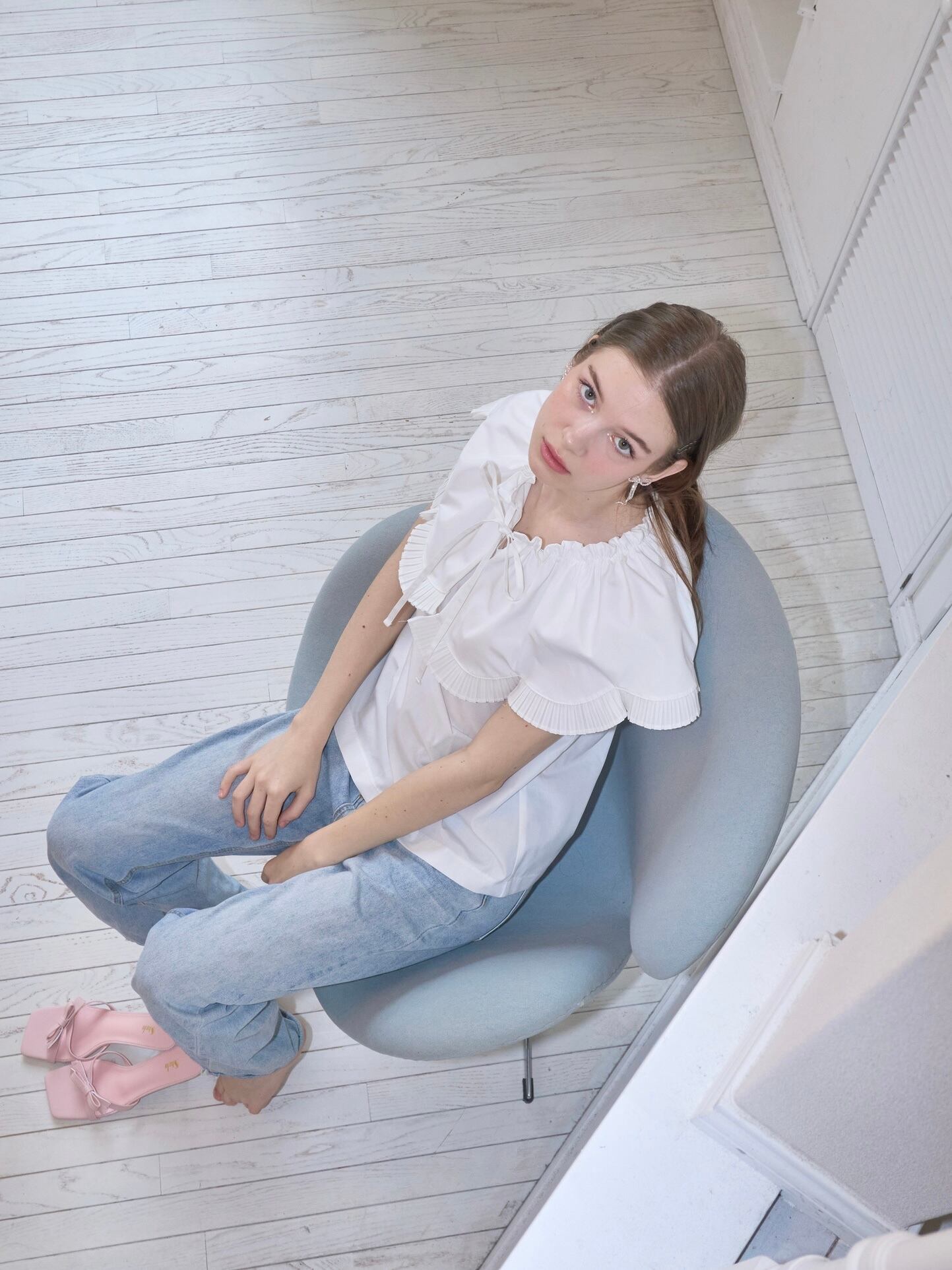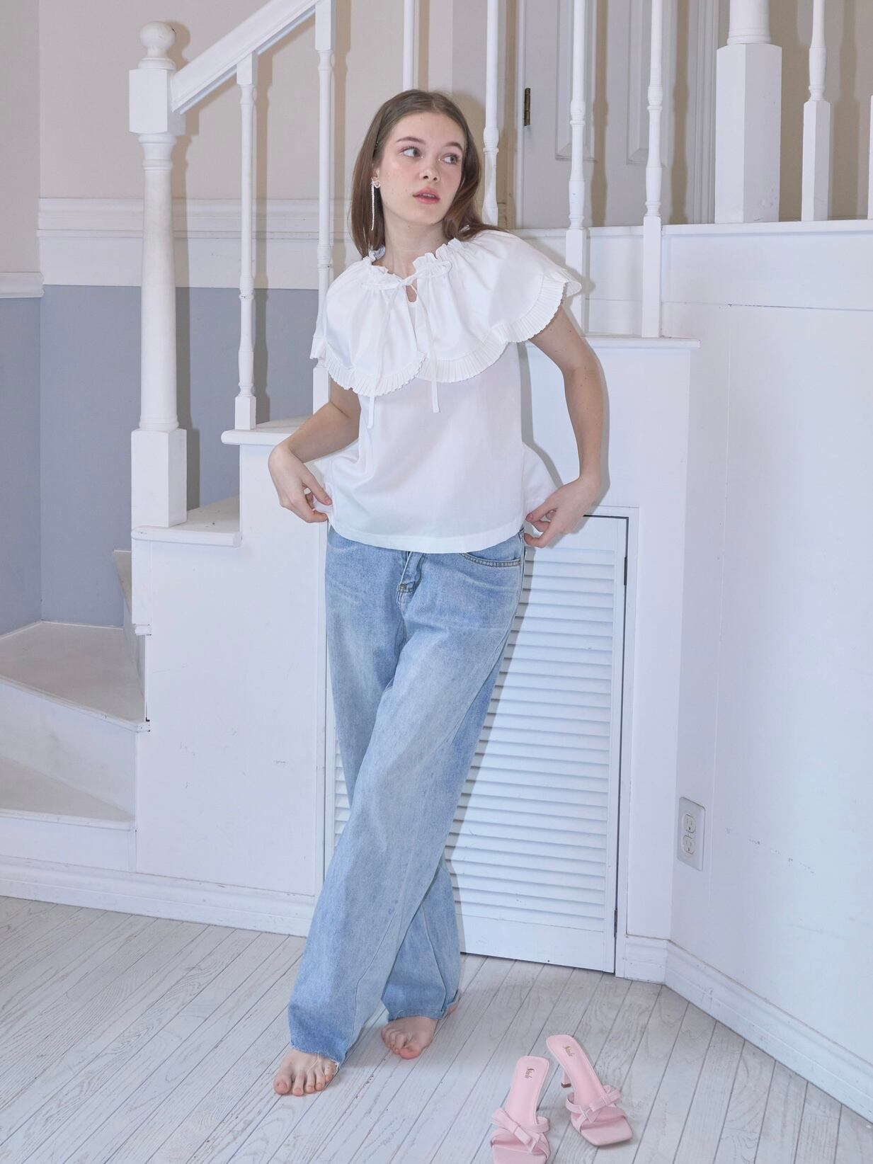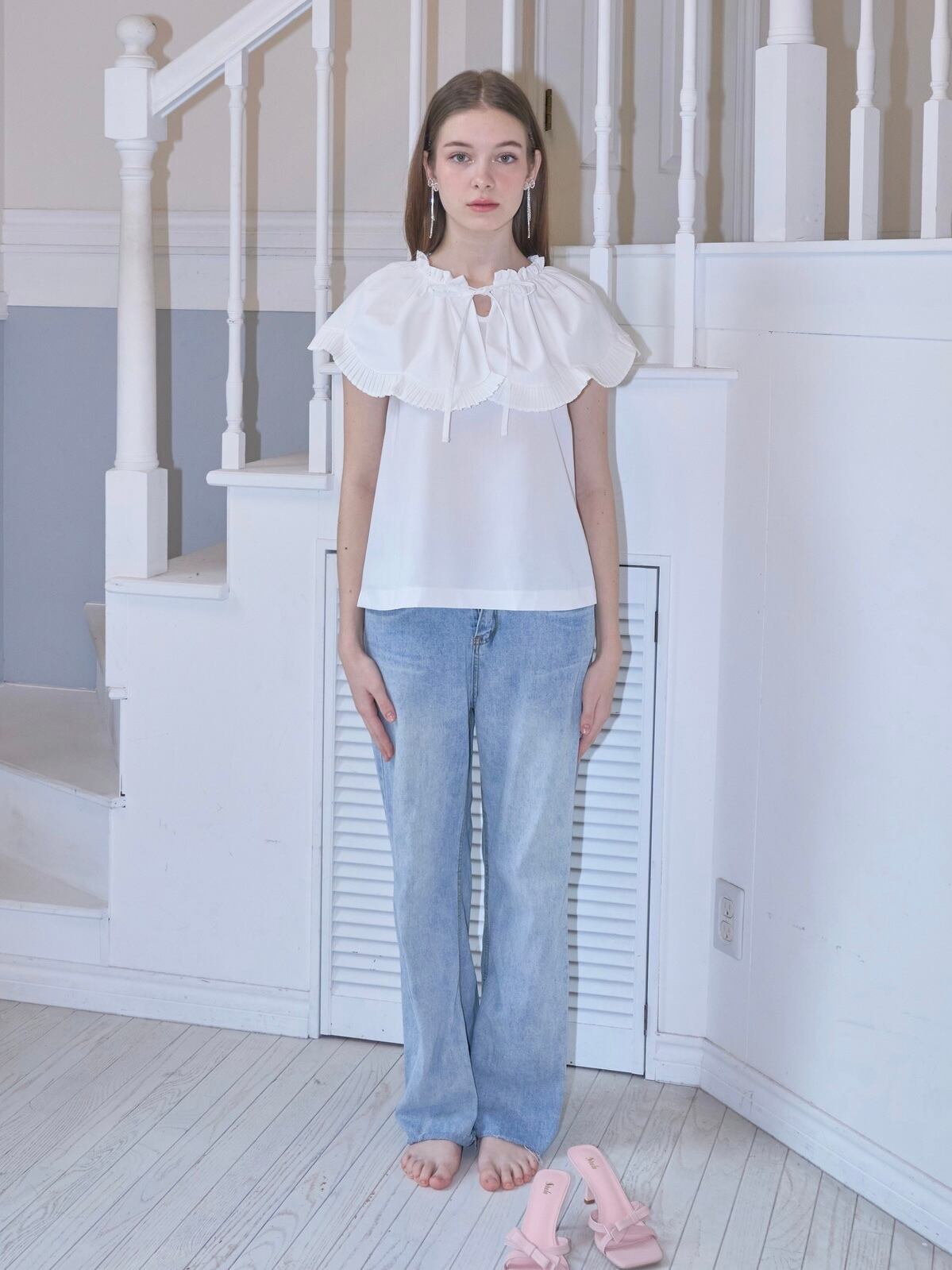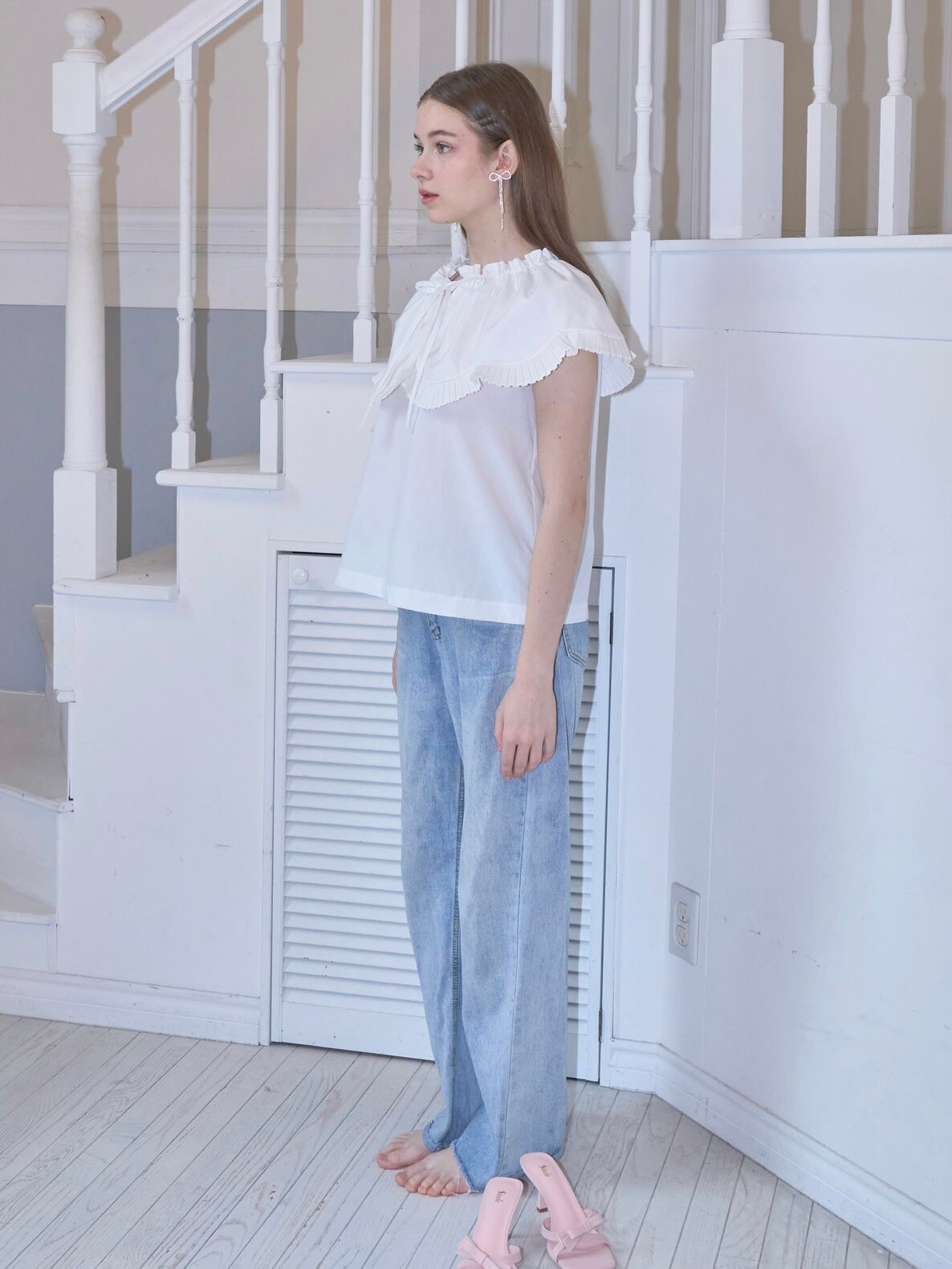 大きめの襟とフリルが目を引くノースリーブブラウス♡